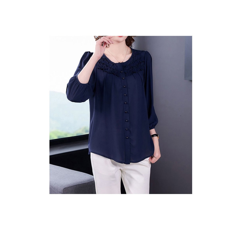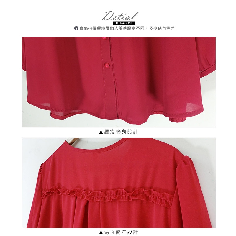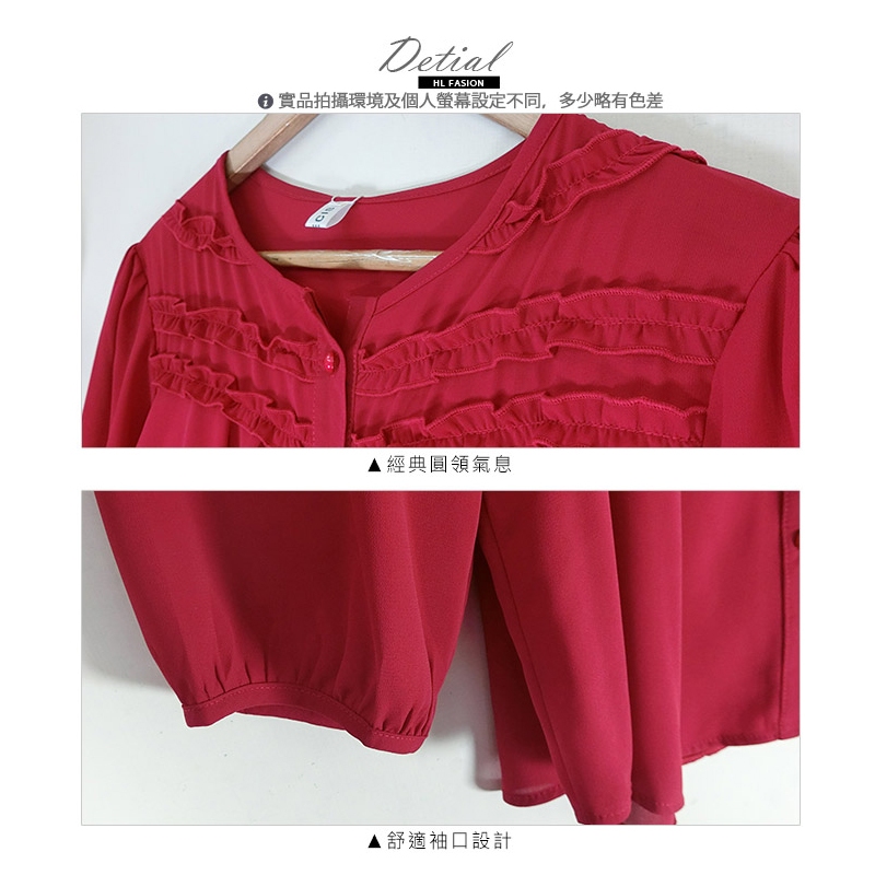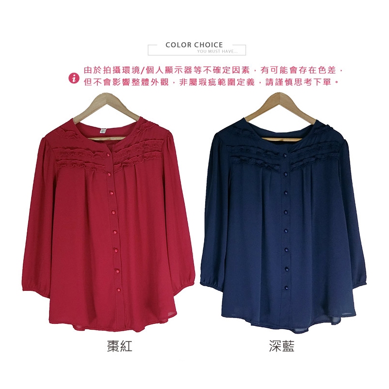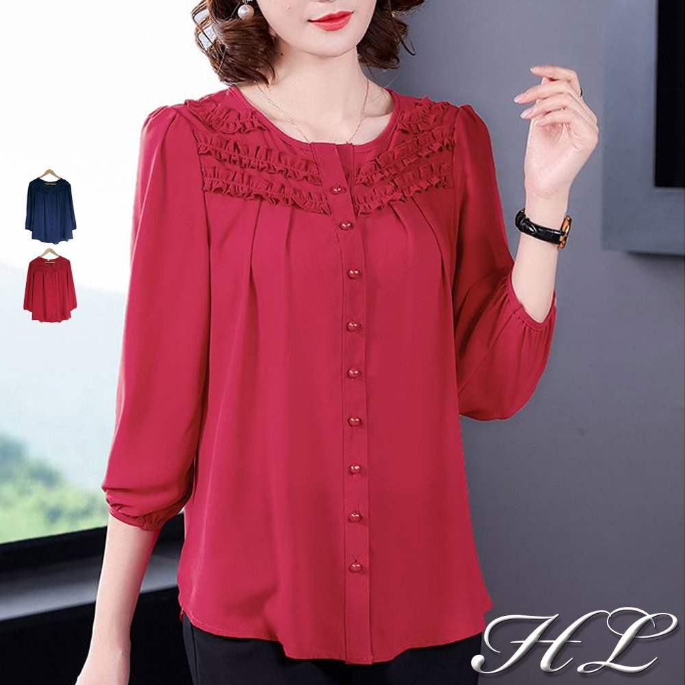 HL中大尺碼【25070178】悠閒滾花領排釦雪紡七分袖 2色52碼棗紅|50碼深藍|52碼深藍|50碼棗紅T-shirtsHL中大尺碼