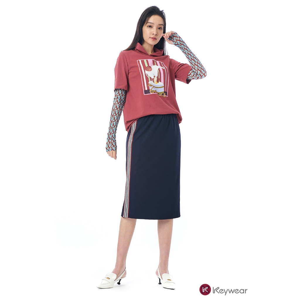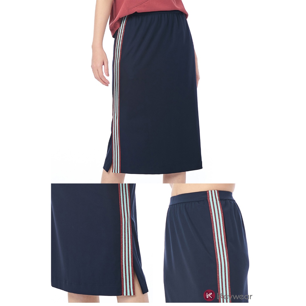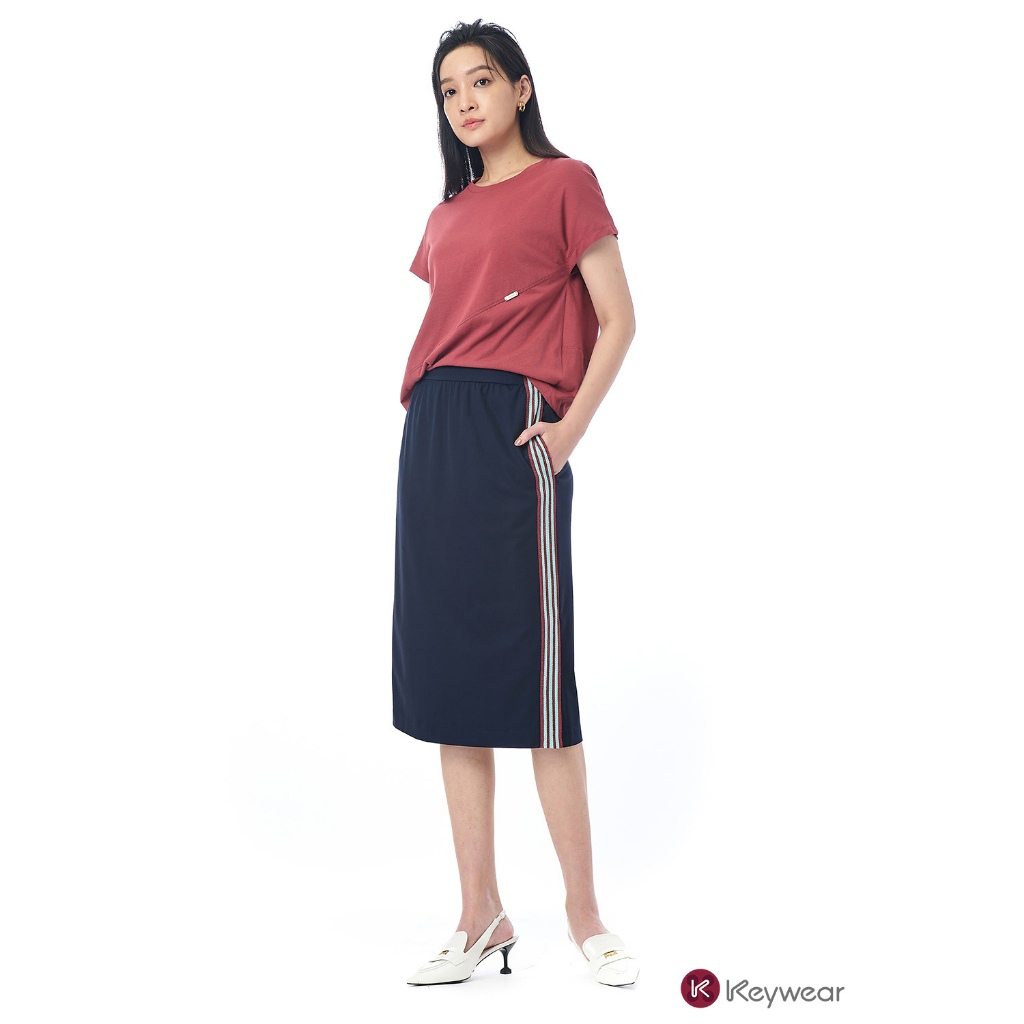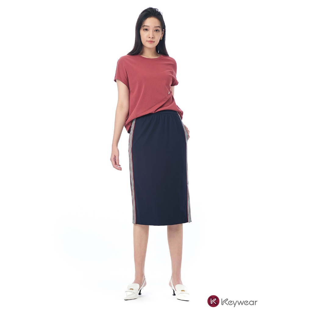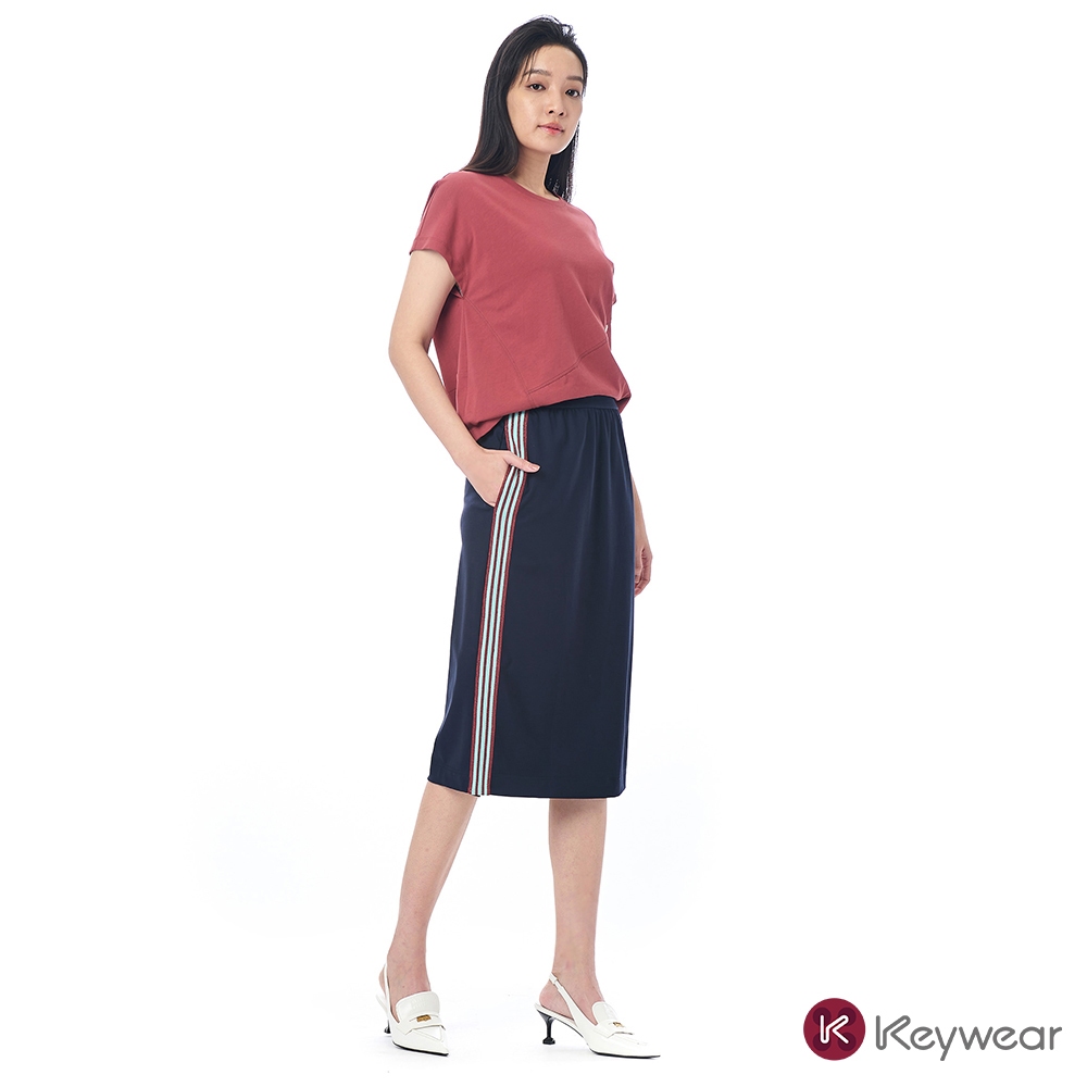 【KeyWear 奇威名品】兩側個性條紋織帶純色中長裙 深藍色S|M|LKeywear奇威官方旗艦店