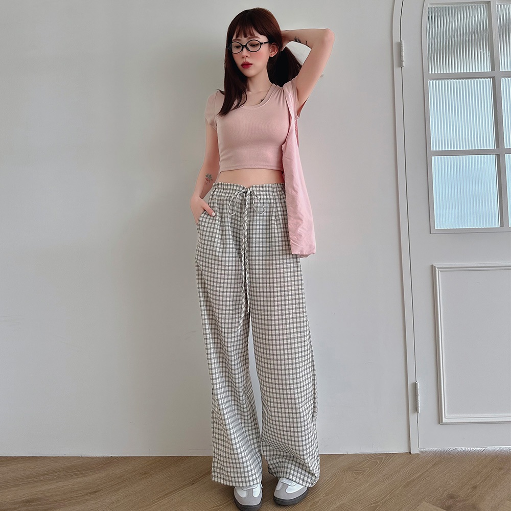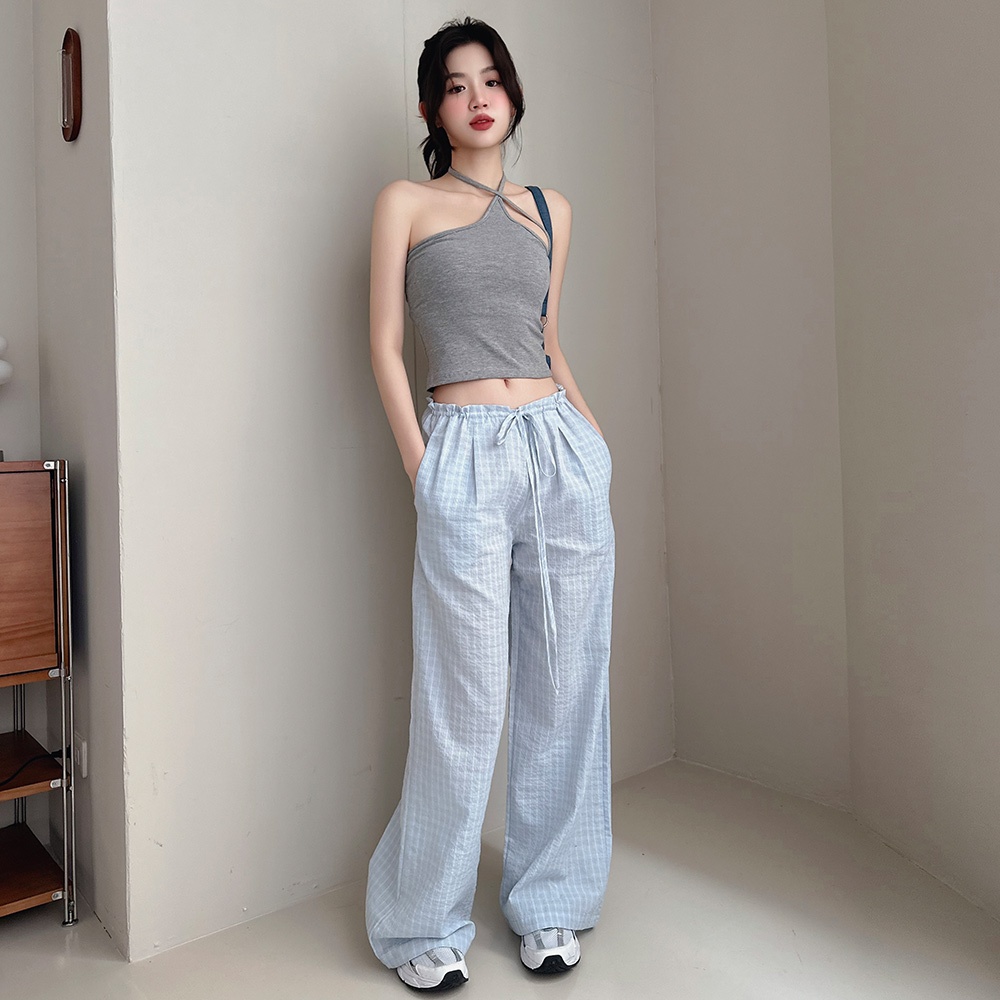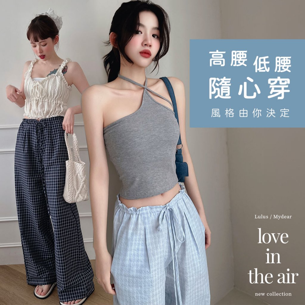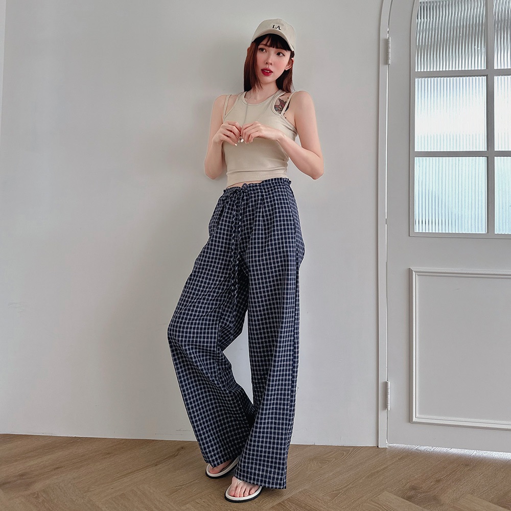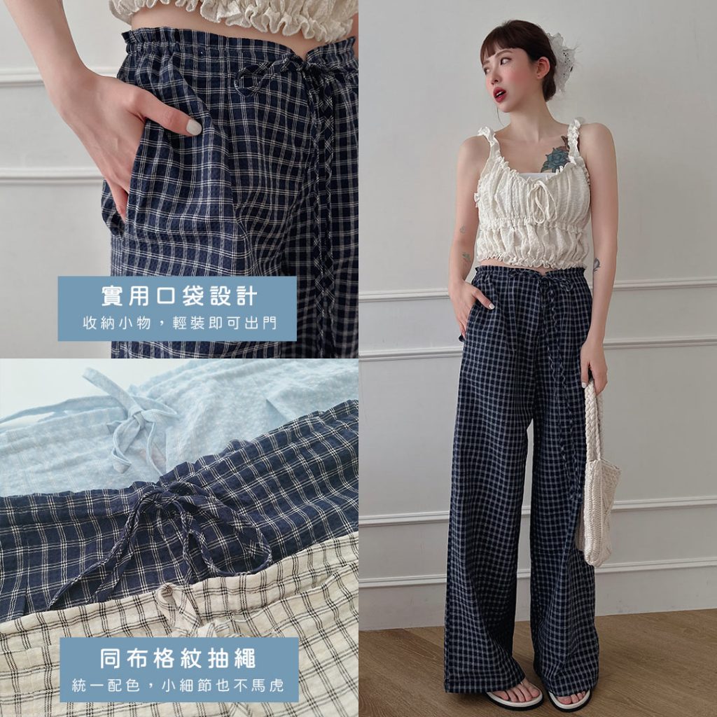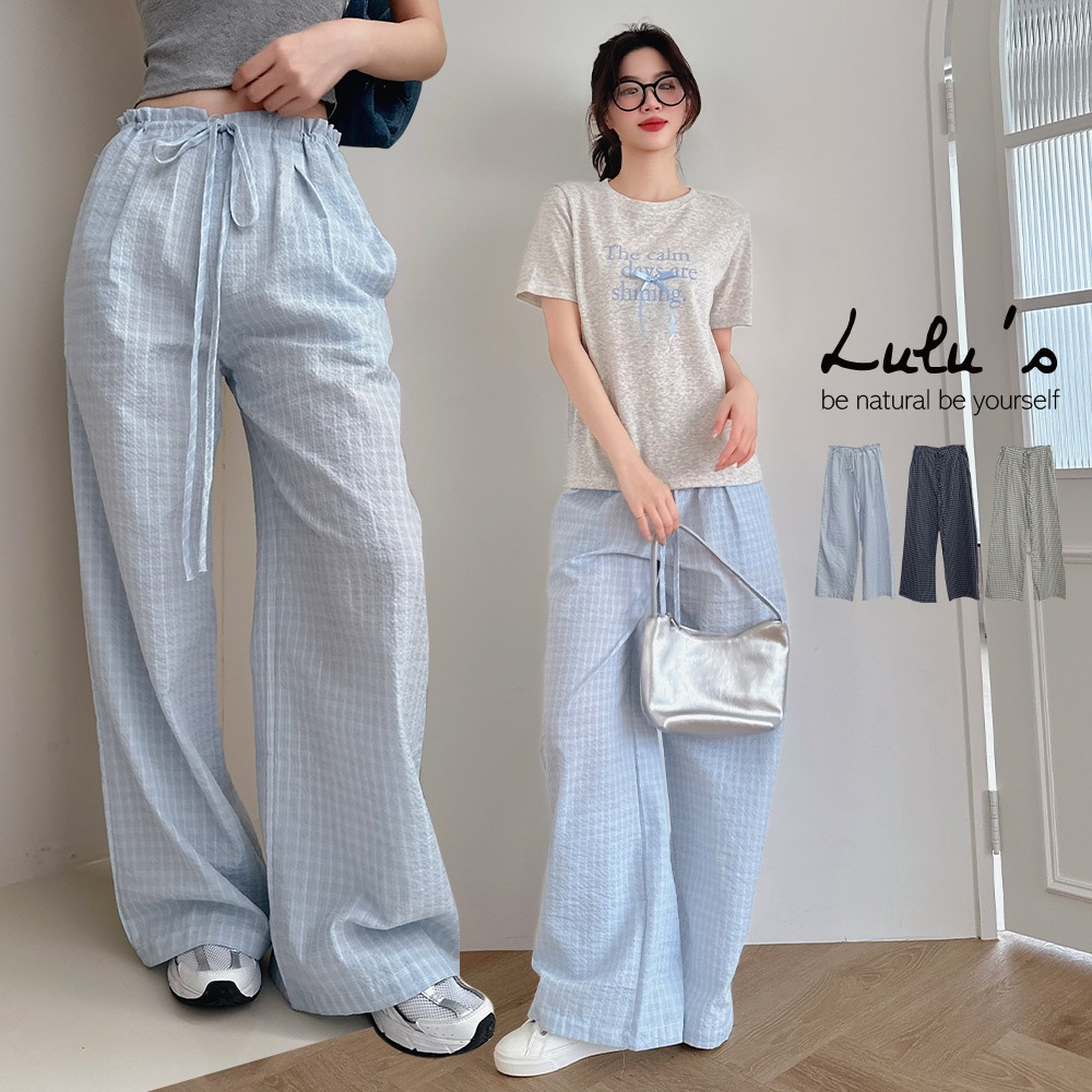 LULUS/現貨/復古格紋腰綁帶寬鬆長褲S-L3色【A04250114】250528深藍L|深藍M|深藍S|淺藍L|淺藍M|淺藍S|白L|白M|白SPantsLULUS