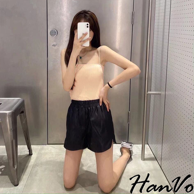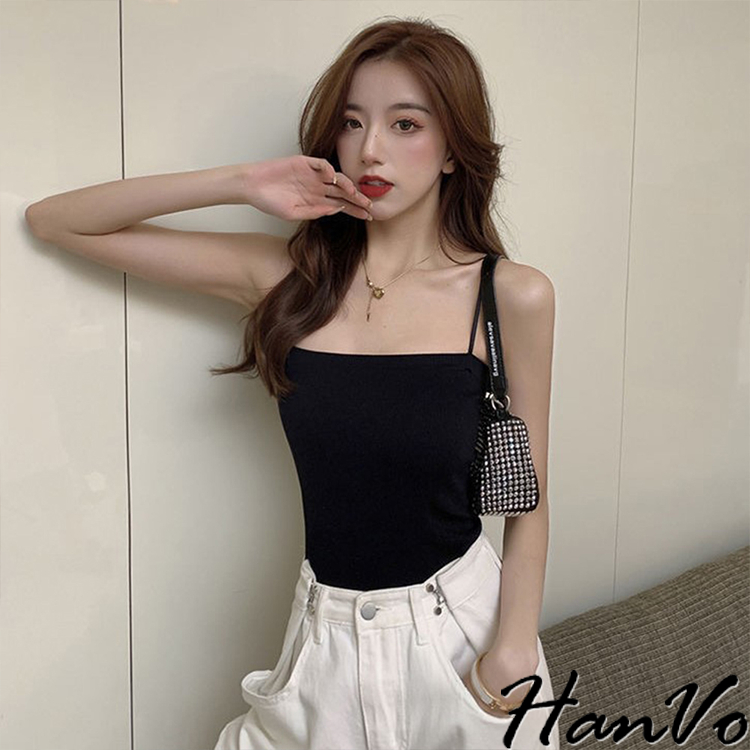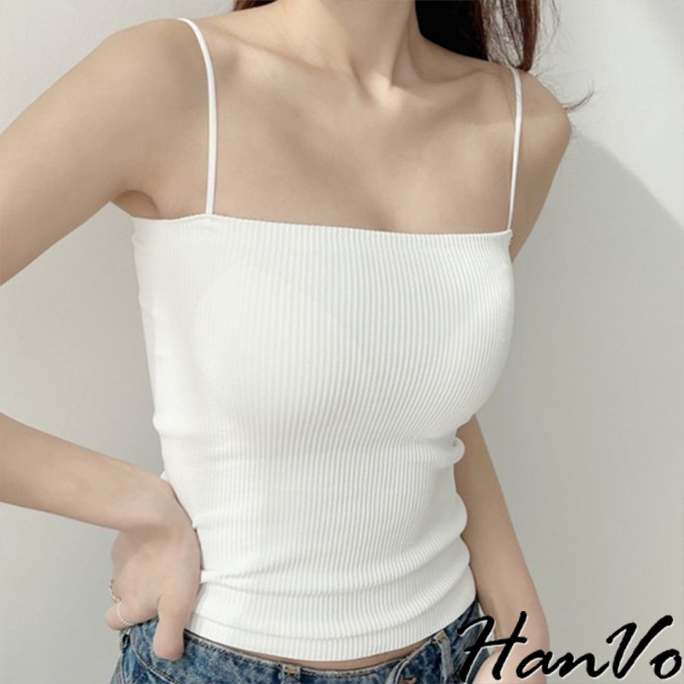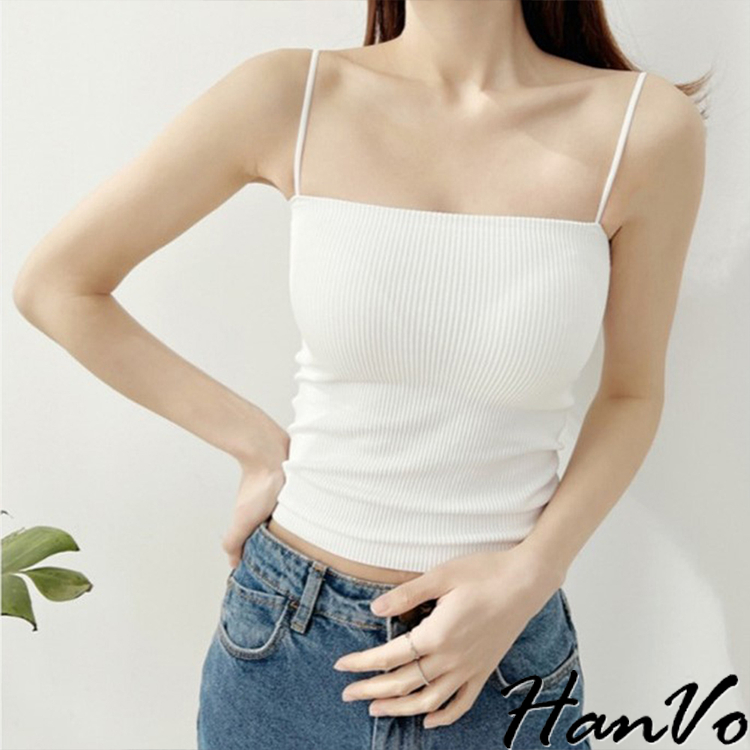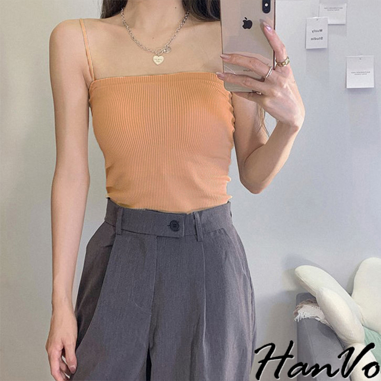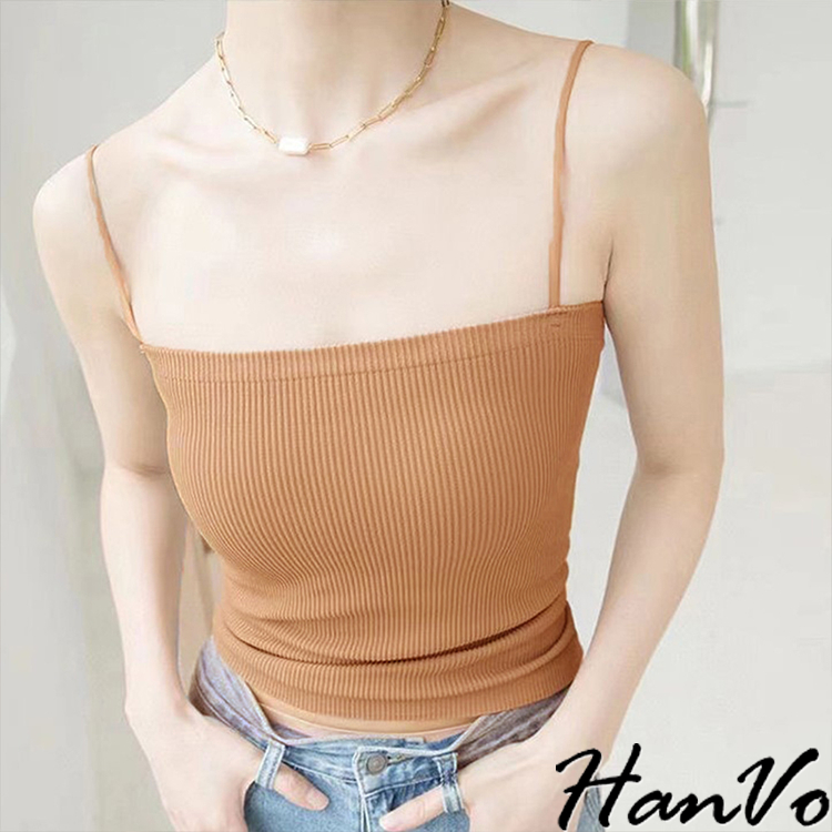 【HanVo】直坑條細肩帶平口背心小可愛 細肩帶背心 附不可拆式胸墊 涼感小可愛 韓系女裝 女生衣著 A09-5061鉛筆灰|咖啡色|米杏色|復古駝Tube TopsHanVo Wear Collection