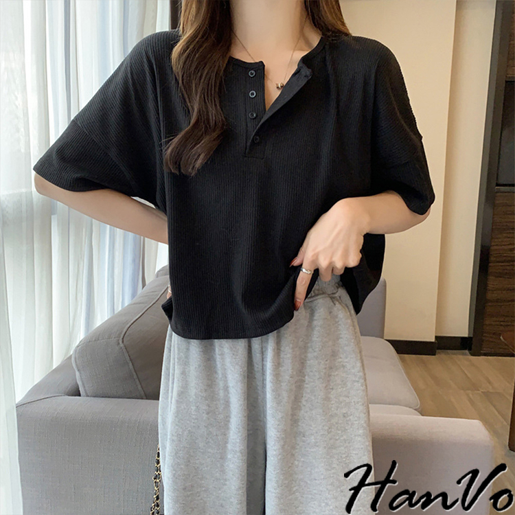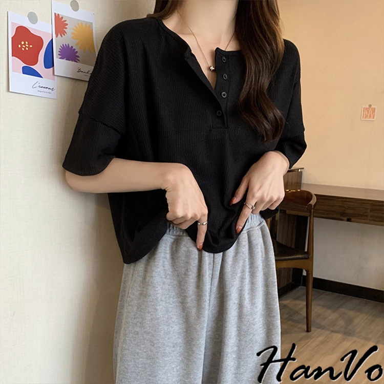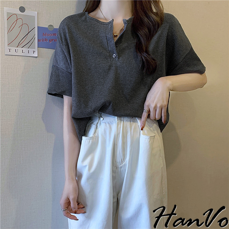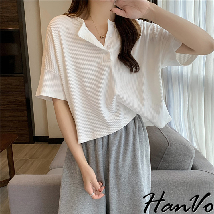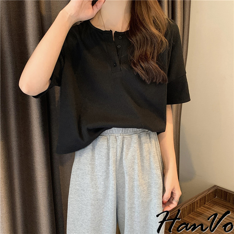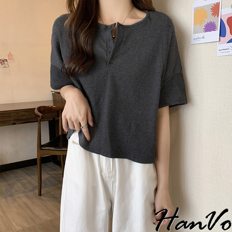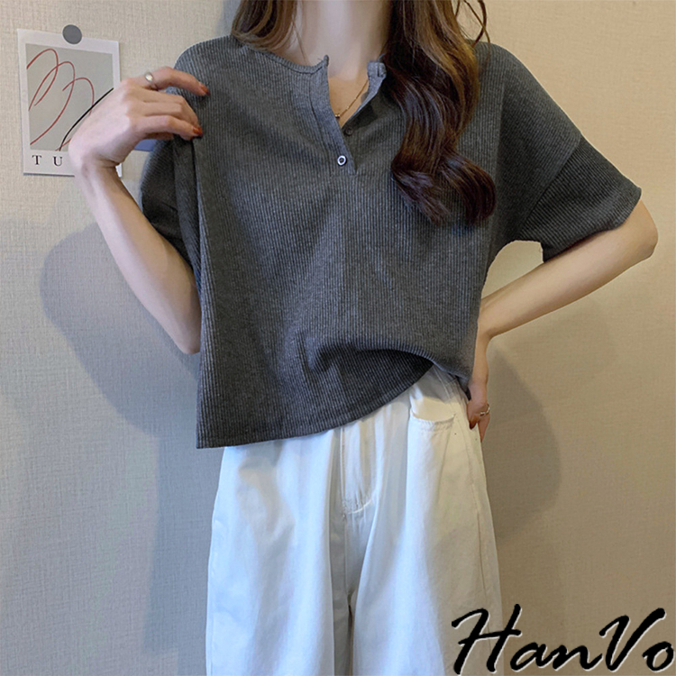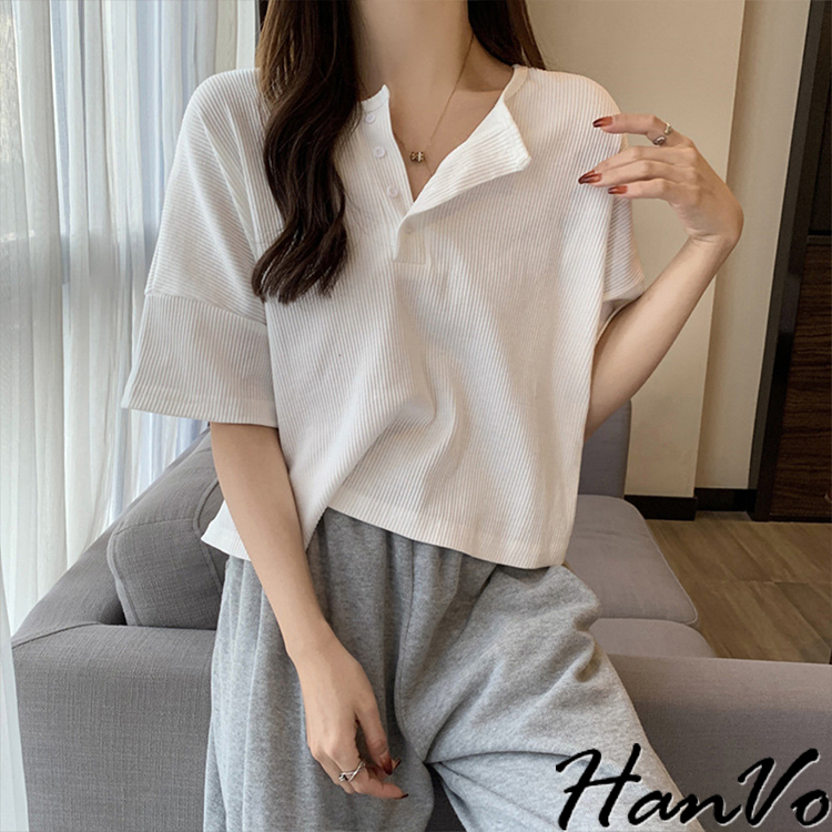 【HanVo】簡約百搭坑條短袖上衣 韓國時尚透氣親膚舒適短袖上衣 韓版簡約日常上衣 韓系女裝 女生衣著 A01-1427