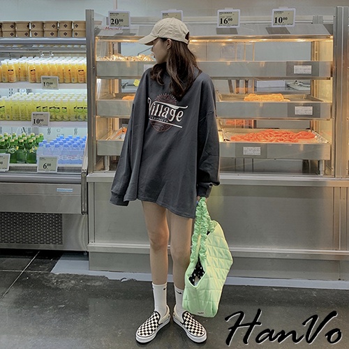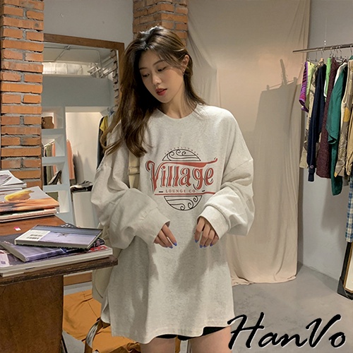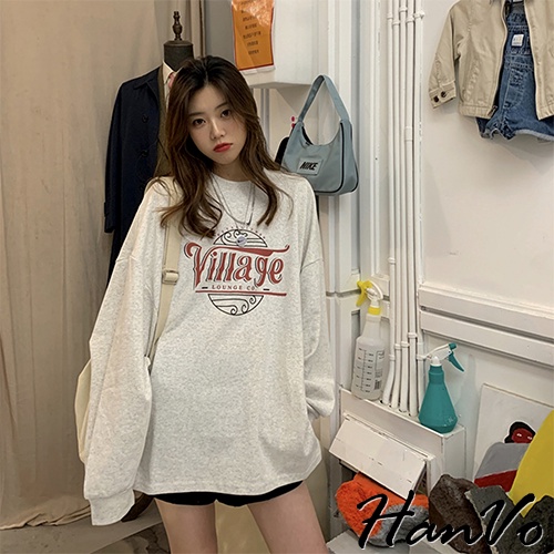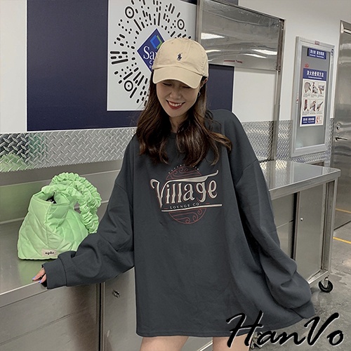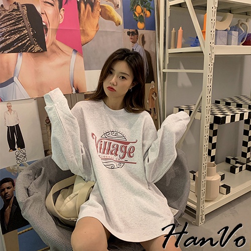 【HanVo】Village海浪紅黑白字母長袖T恤 舒適休閒長袖棉T 百搭顯瘦修身上衣 女生衣著 A02-1757淺灰|暗灰T-shirtsHanVo Wear Collection