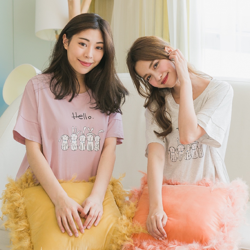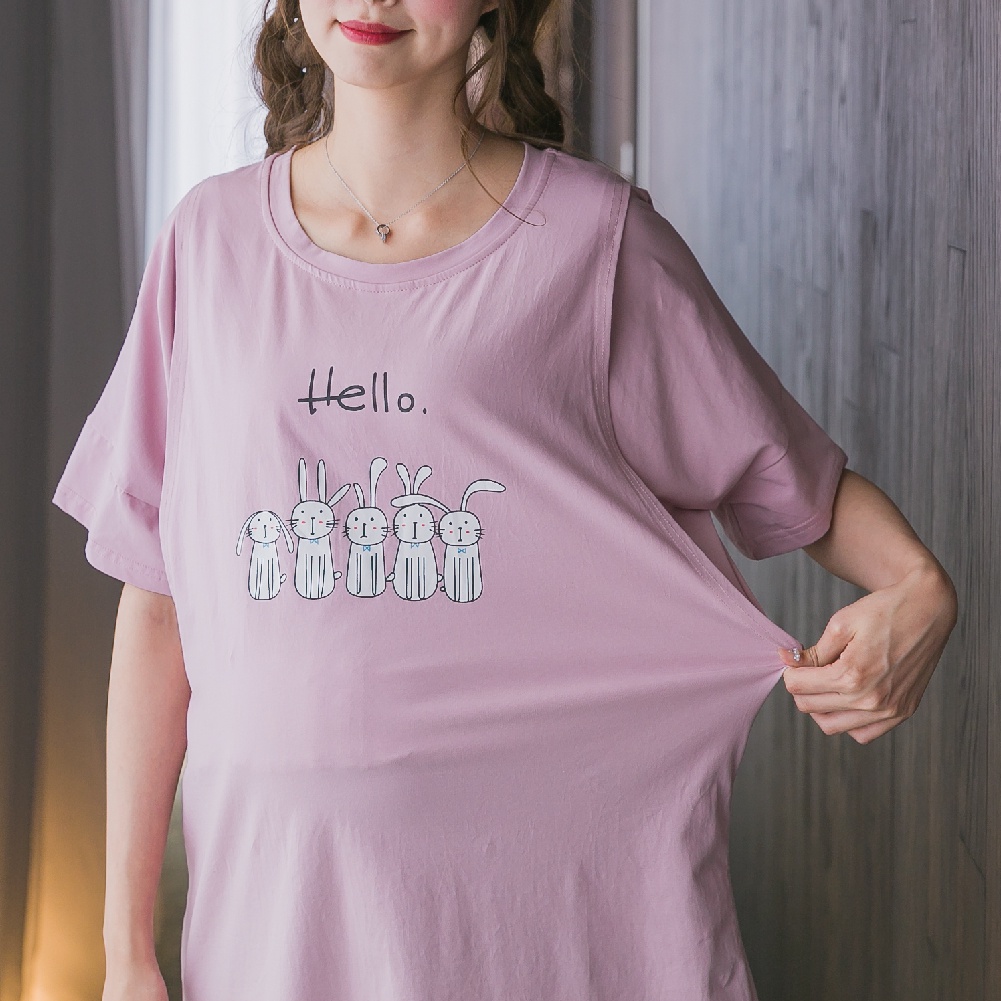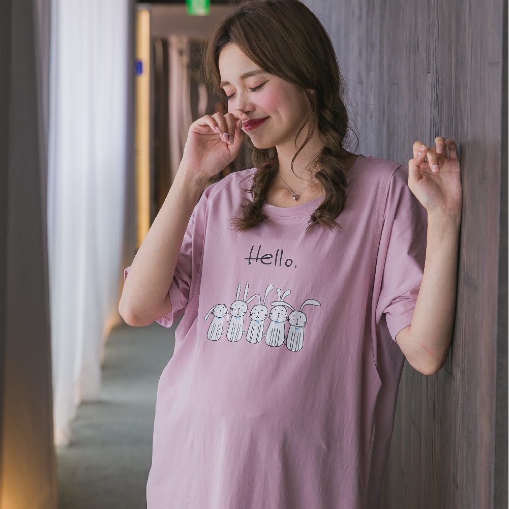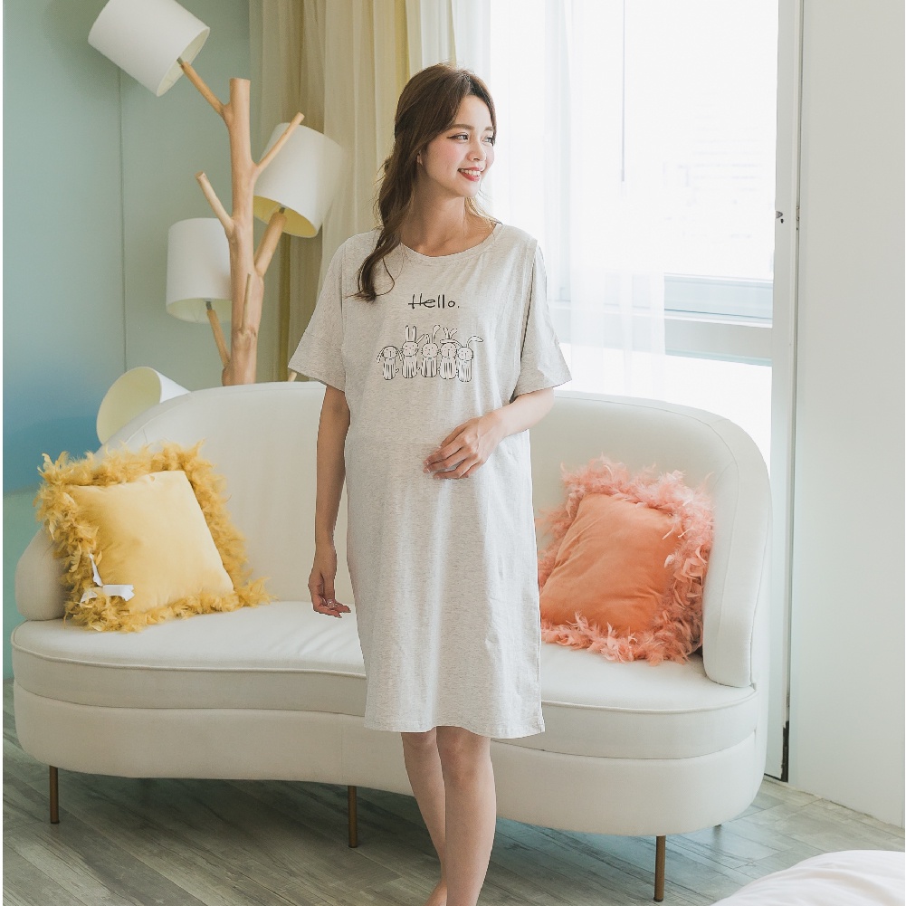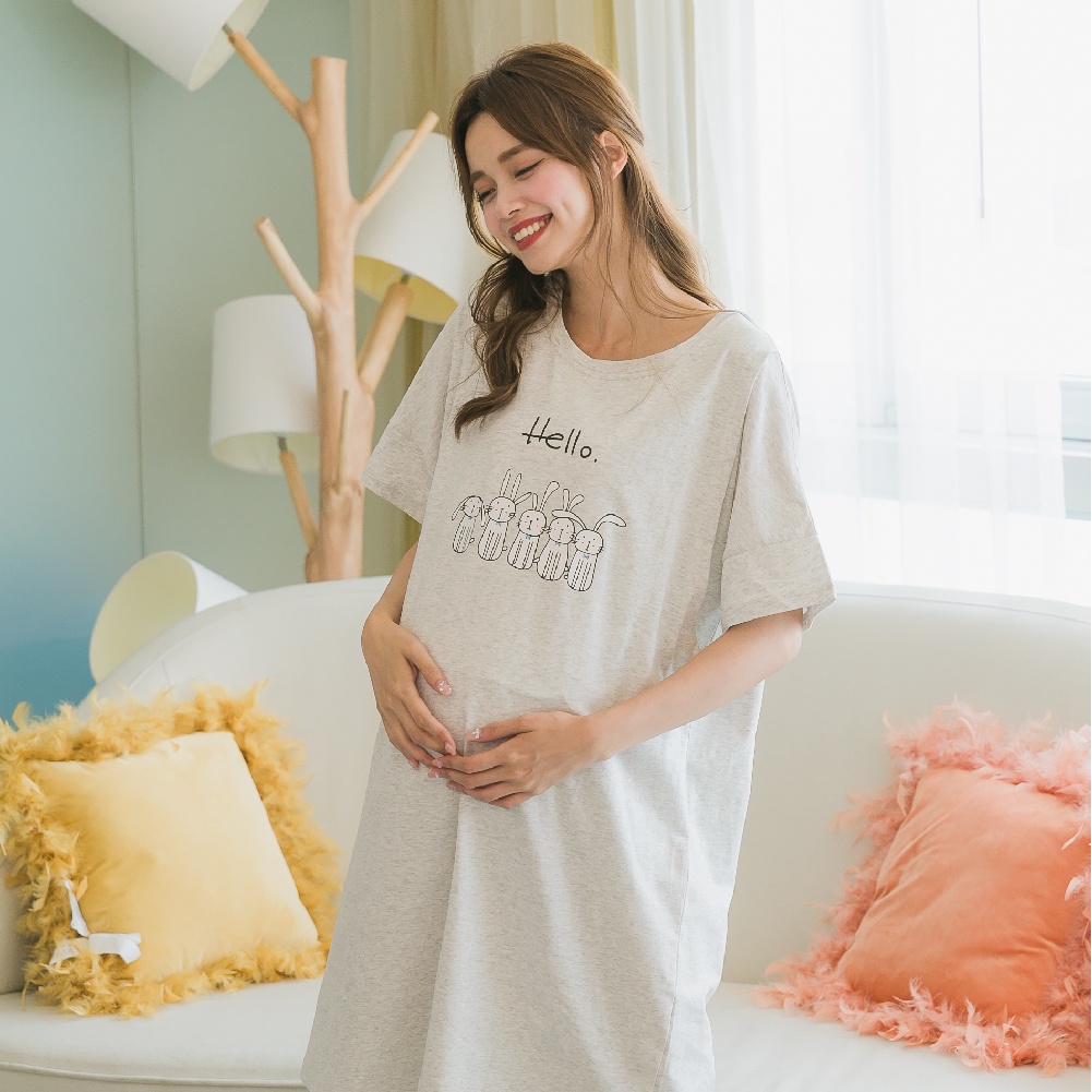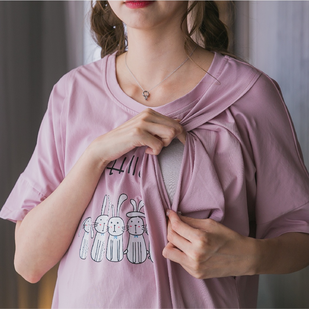 Mamamia孕婦裝 兔子居家哺乳睡衣 正韓製 哺乳套裝 短袖 哺乳衣 月子服 孕婦裝 連身裙 居家服 [A1522]灰|粉Breastfeeding WearMamamia孕婦裝