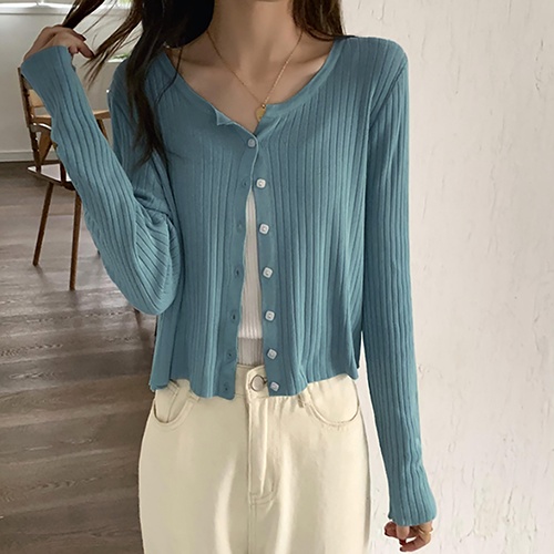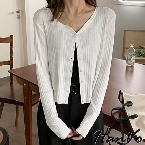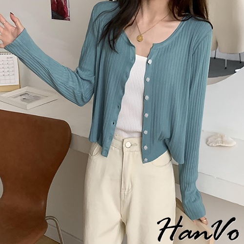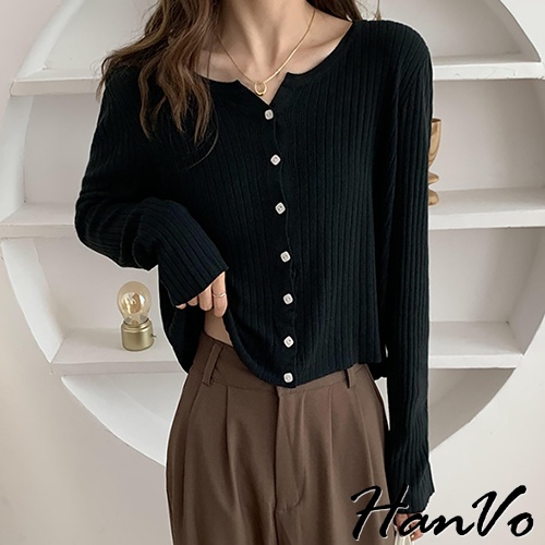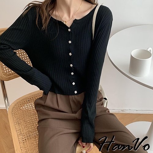 【HanVo】小方釦垂墜素色針織外套 韓系休閒百搭針織外套上衣 韓國韓系女裝 女生衣著 A02-1734黑色|白色|湖藍HanVo Wear Collection