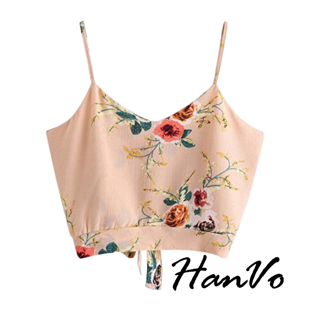 【HanVo】短版印花背心 現貨出清 熱銷新品 吊帶背心細肩帶美背性感露背蝴蝶結 韓系女裝 女生衣著 A01-1047