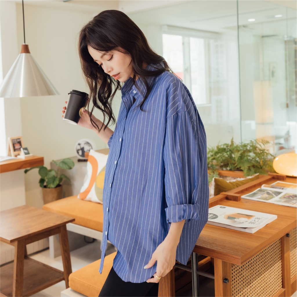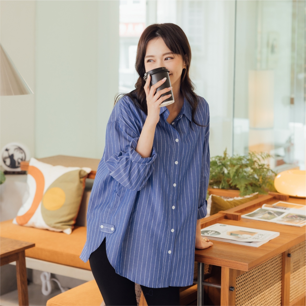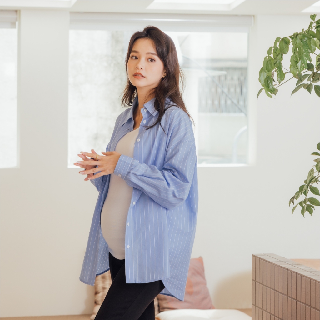 Mamamia孕婦裝 兩穿式經典知性條紋哺乳襯 孕婦裝 孕婦上衣 哺乳上衣 長版上衣 長袖 襯衫 [A1942]淺藍|深藍Breastfeeding WearMamamia孕婦裝