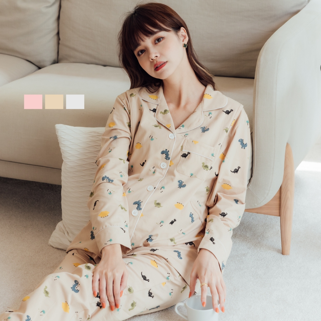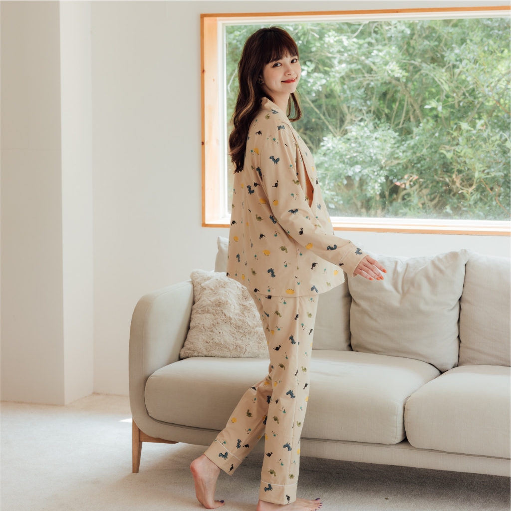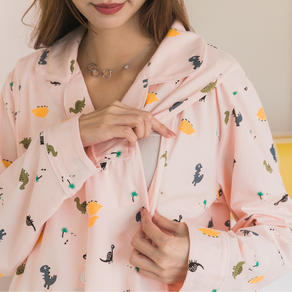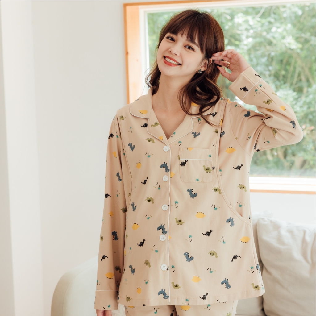 Mamamia孕婦裝 滿版恐龍哺乳睡衣 M~XL 哺乳套裝 喂奶衣 長袖 哺乳衣 月子服 孕婦裝 [A1617]灰,L|灰,XL|粉,M|粉,L|粉,XL|灰,M|奶茶,L|奶茶,M|奶茶,XLBreastfeeding WearMamamia孕婦裝