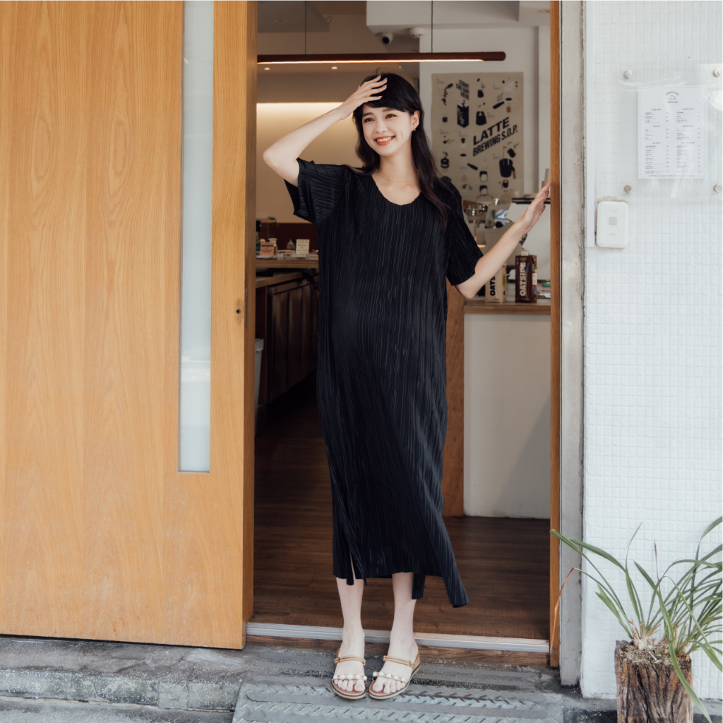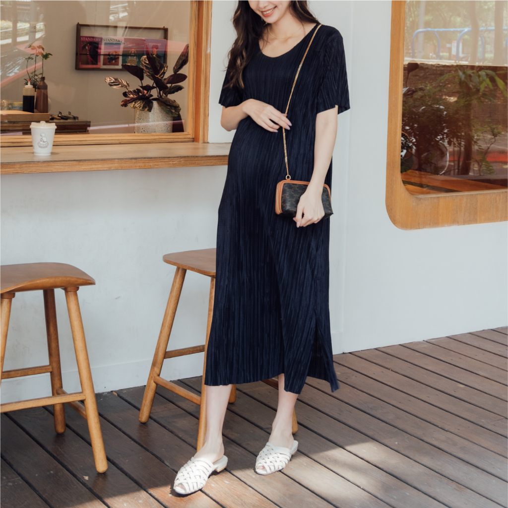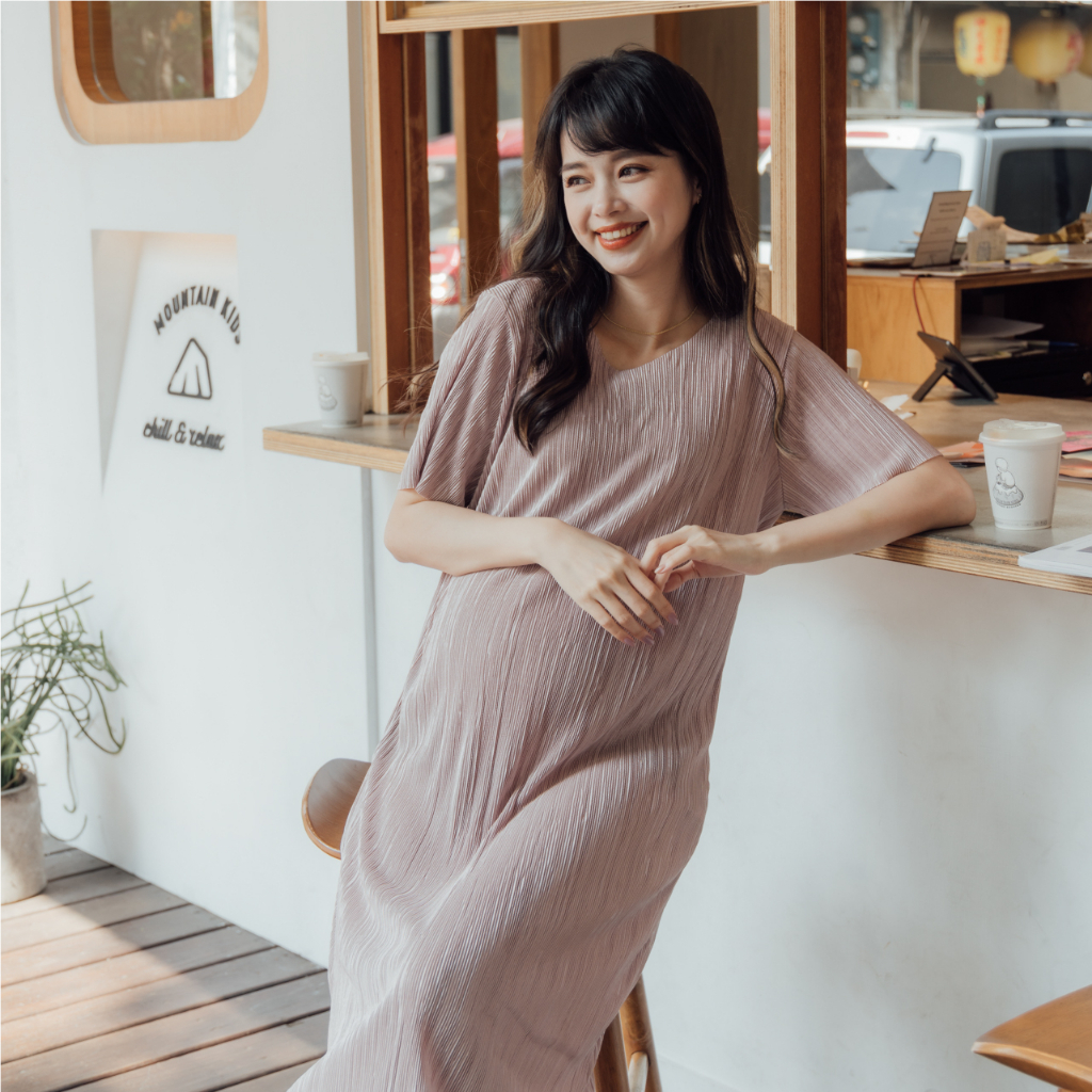 Mamamia孕婦裝 質感系波光壓褶彈力孕婦洋裝 正韓製 孕婦裝 孕婦裙 孕婦洋裝 短袖 孕婦穿搭 [D7196]杏-售完不補|粉|藍|黑Maternity DressesMamamia孕婦裝