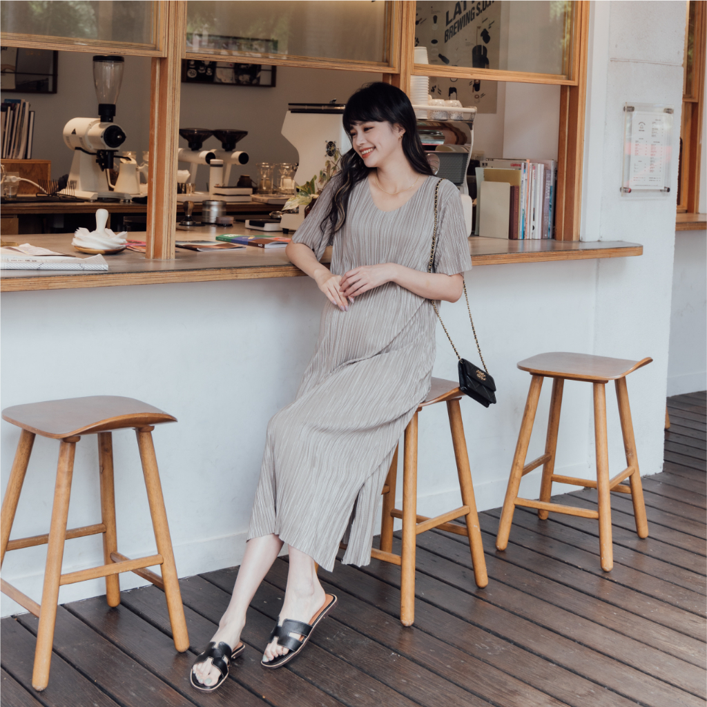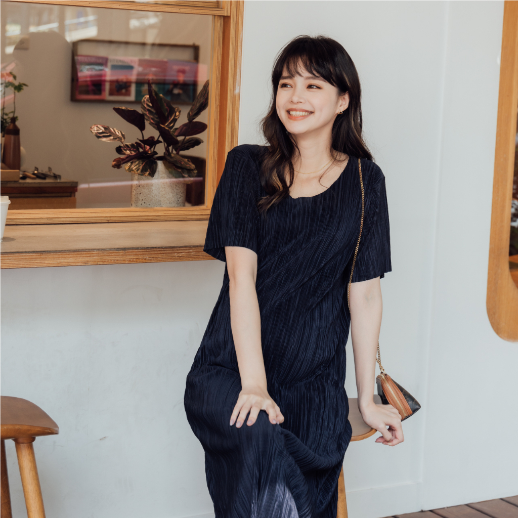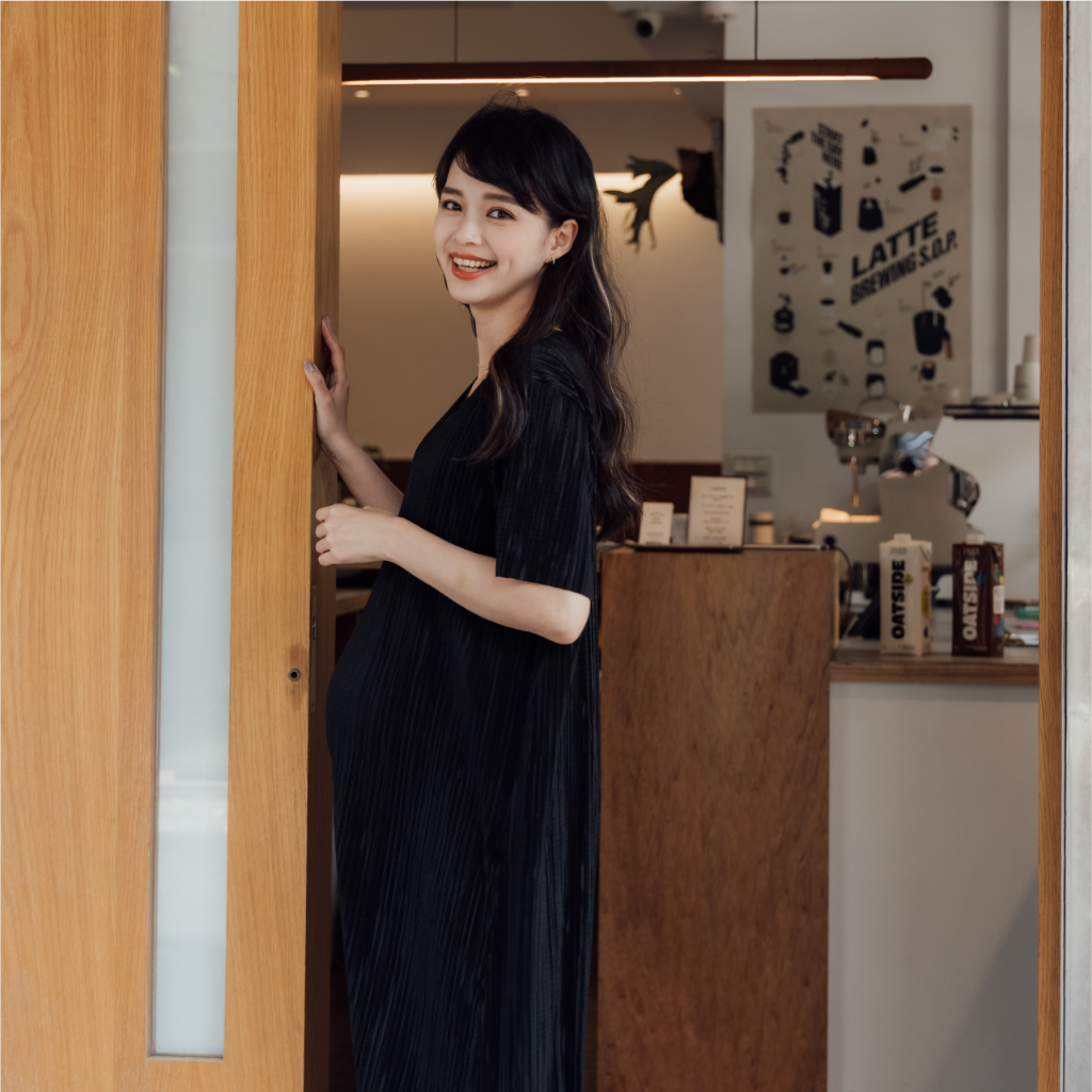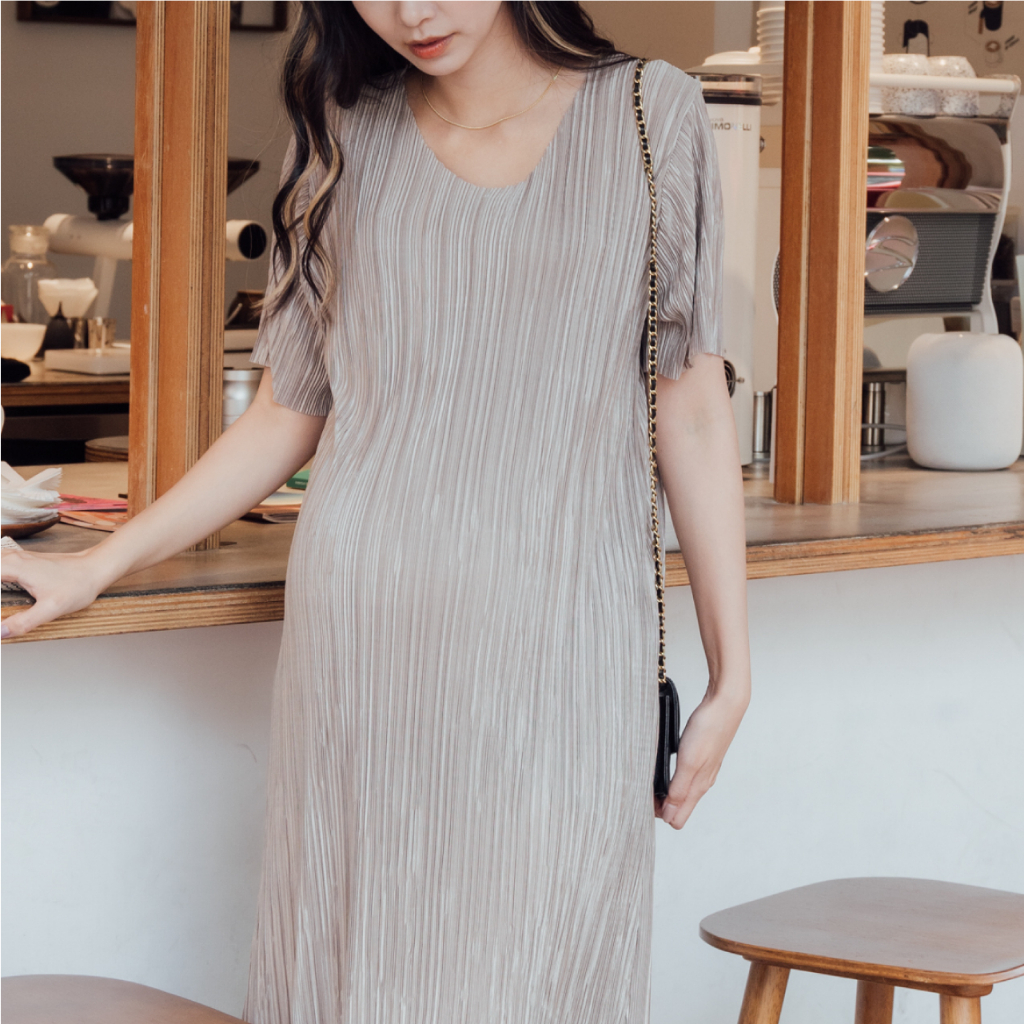 Mamamia孕婦裝 質感系波光壓褶彈力孕婦洋裝 正韓製 孕婦裝 孕婦裙 孕婦洋裝 短袖 孕婦穿搭 [D7196]杏-售完不補|粉|藍|黑Maternity DressesMamamia孕婦裝