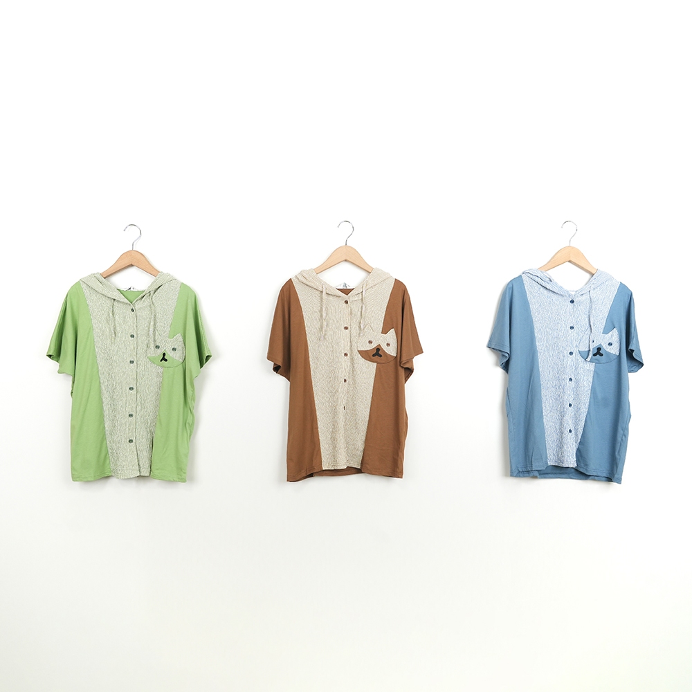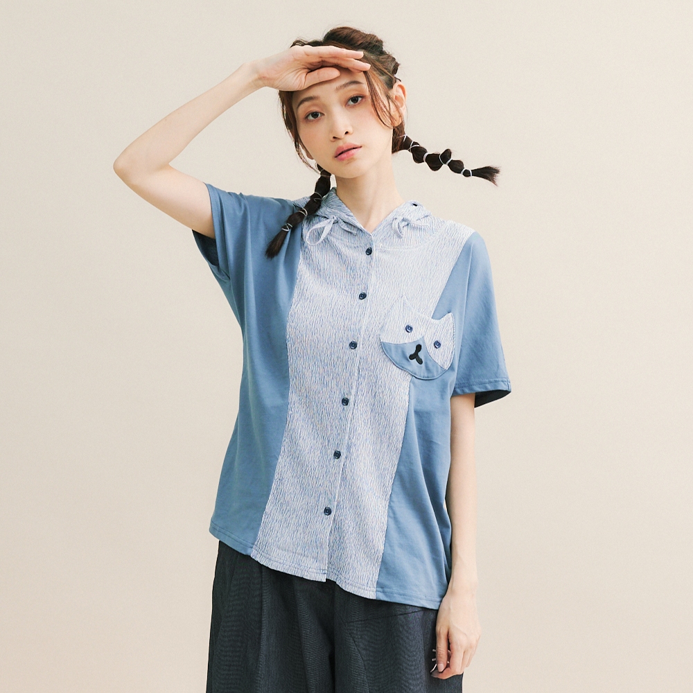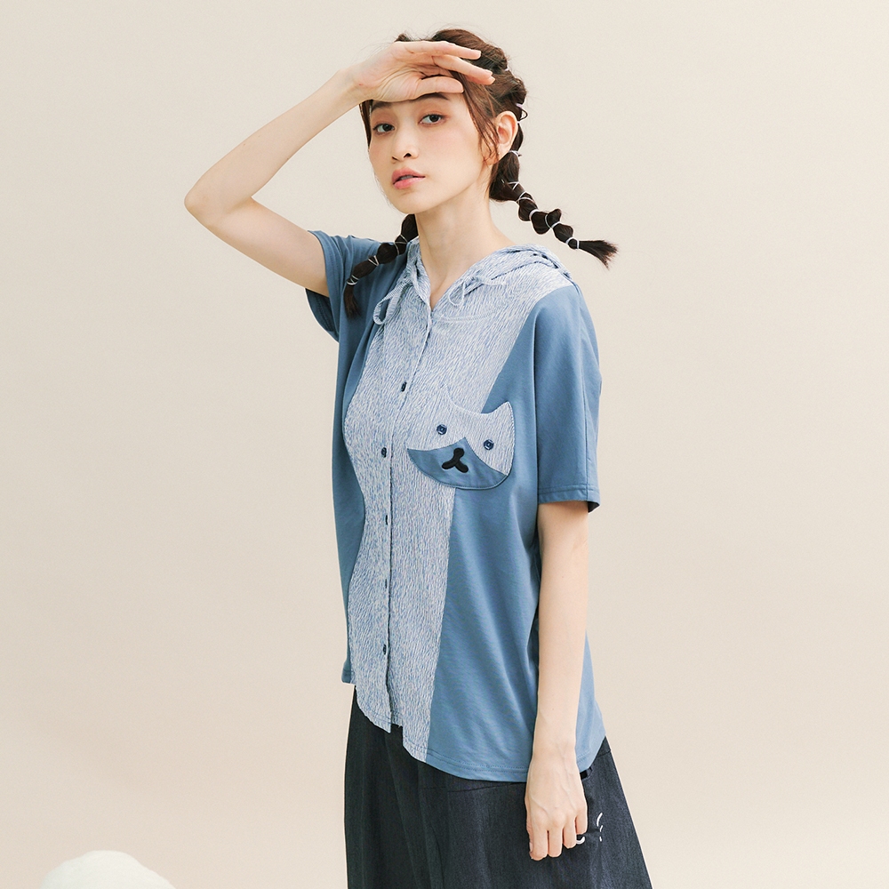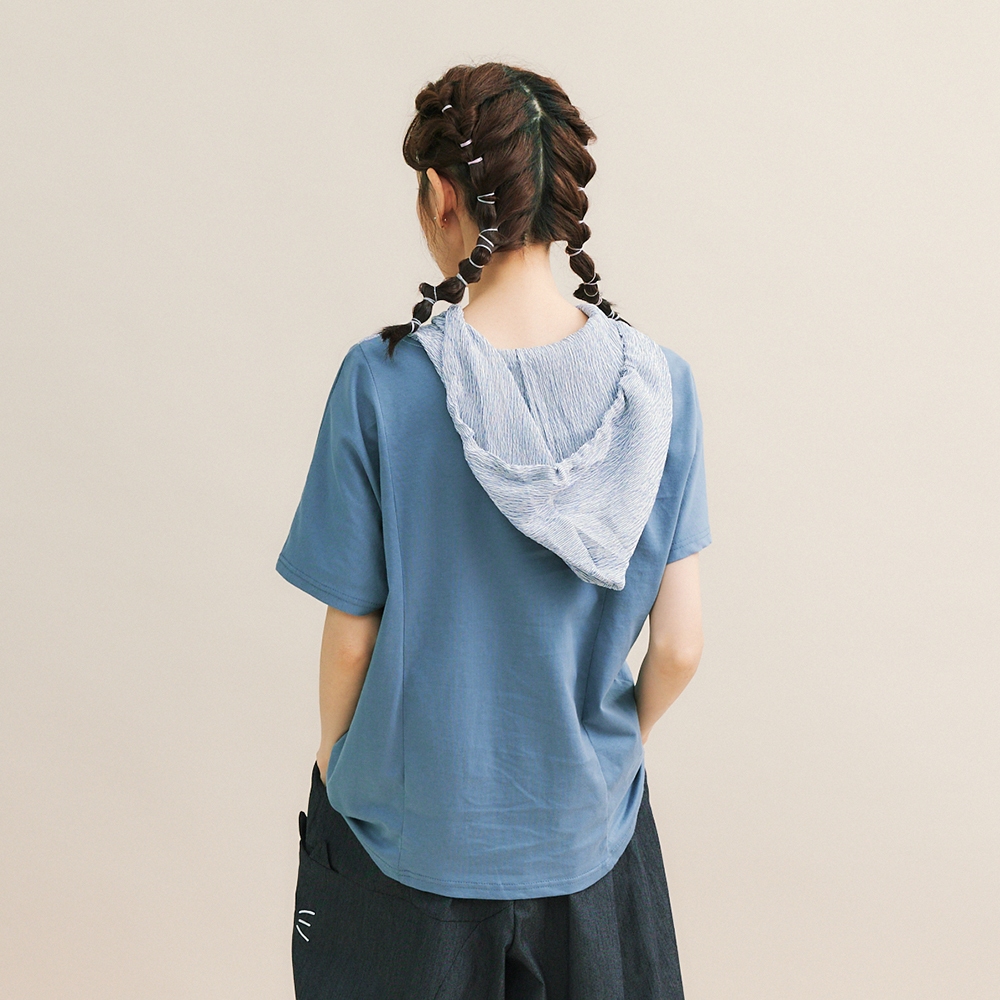 【Dailo】貓咪口袋條紋拼接連帽棉短袖上衣 藍 綠 咖藍/F|綠/F|咖/FT-shirtsINLook 流行女裝品牌旗艦店