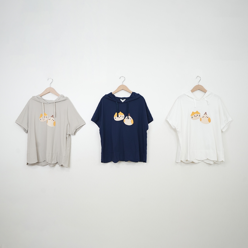 【Dailo】喵咪小鳥慶生會連袖帽T短袖上衣 藍 白 灰藍/F|白/F|灰/FHoodiesINLook 流行女裝品牌旗艦店
