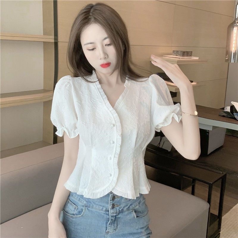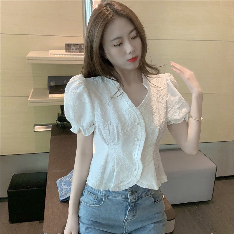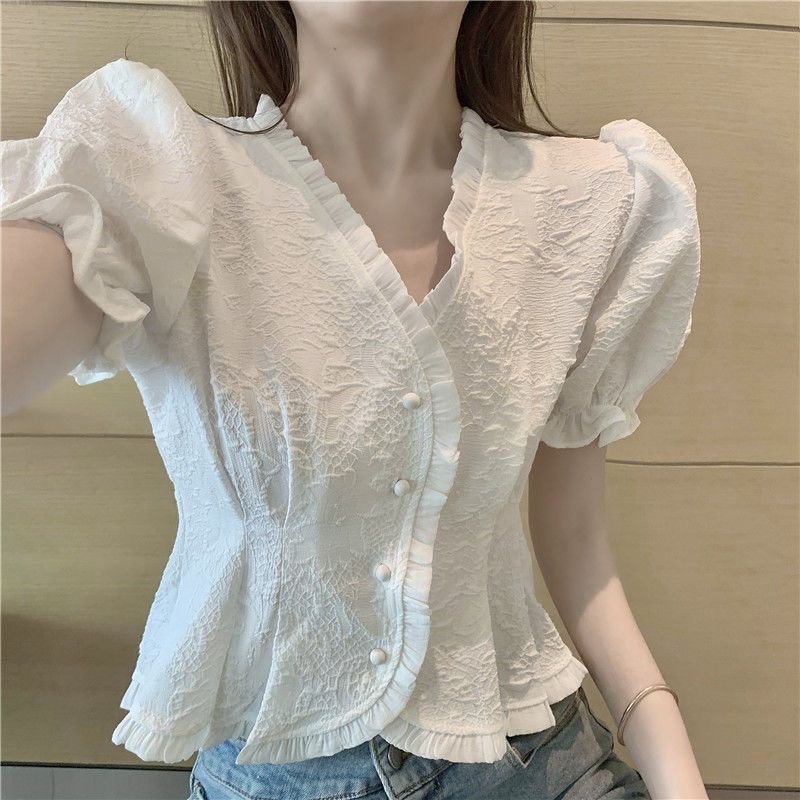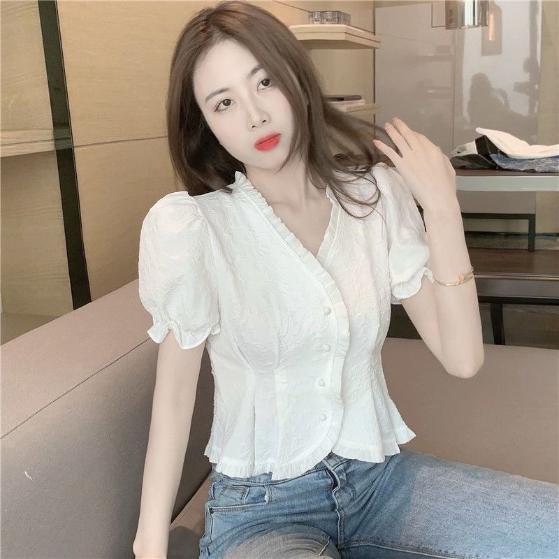 FUXI 短袖襯衫女 V領短板襯衫 法式泡泡袖氣質上衣 短板上衣 女裝 衣服白色,均碼 40-55公斤Shirts & BlousesFUXI 服喜行