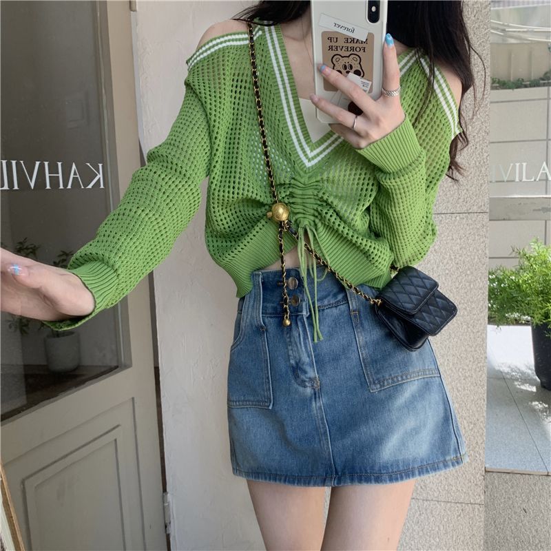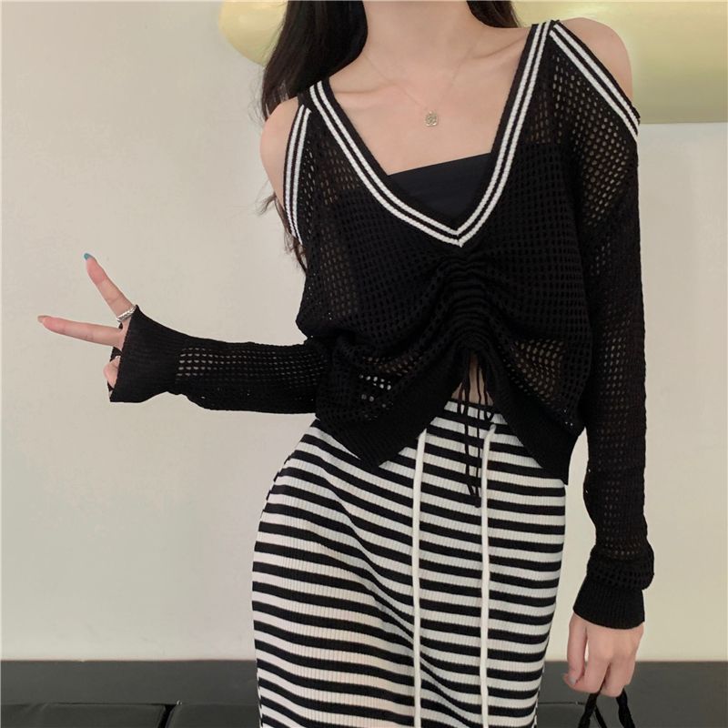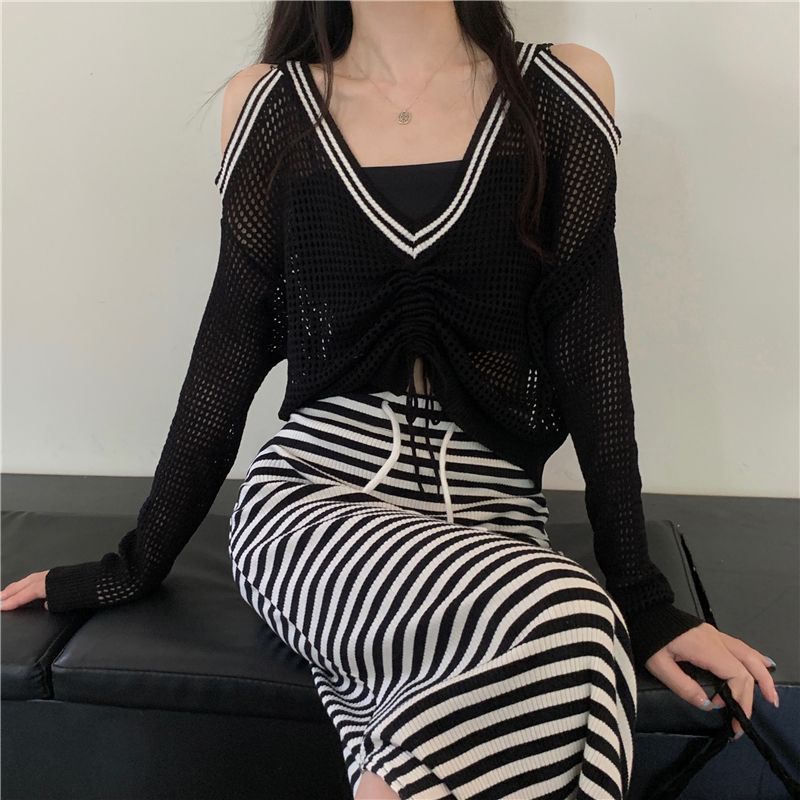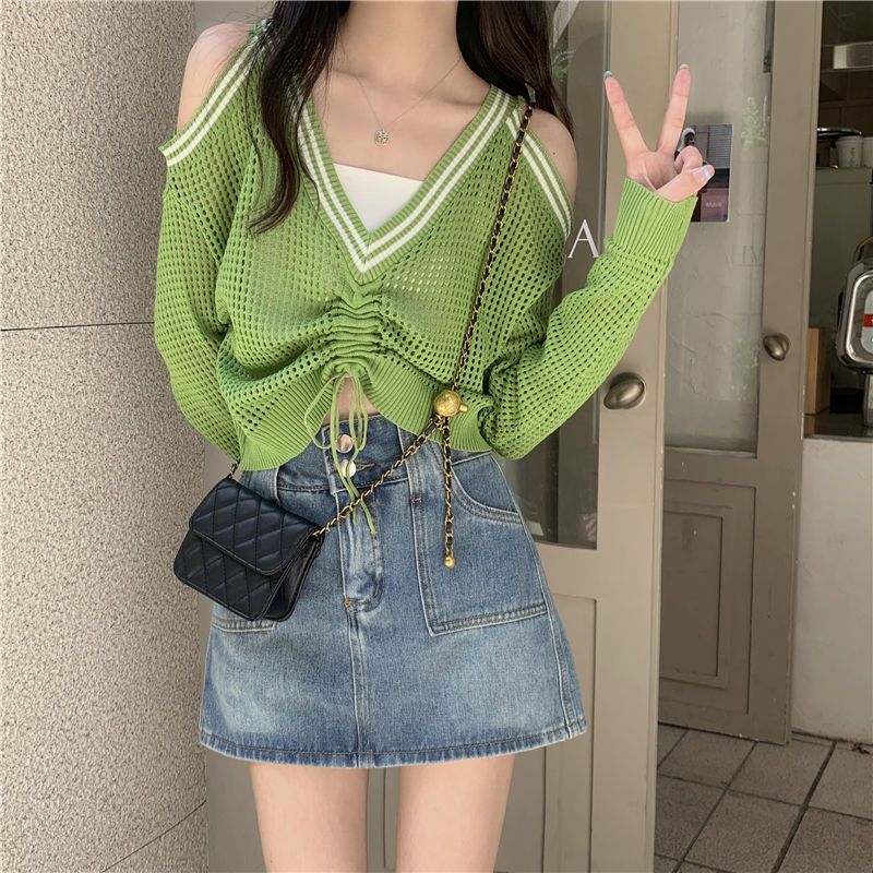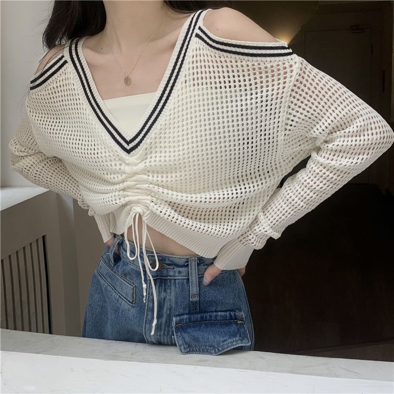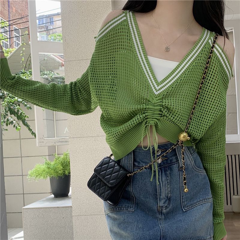 FUXI 長袖針織上衣女 露肩上衣 寬鬆V領鏤空百搭針織衫 長袖抽繩上衣 防曬罩衫 女裝 衣服白色,均碼 40-60公斤|黑色,均碼 40-60公斤|綠色,均碼 40-60公斤FUXI 服喜行