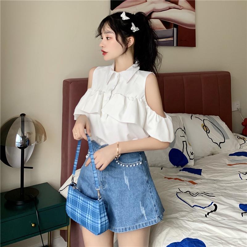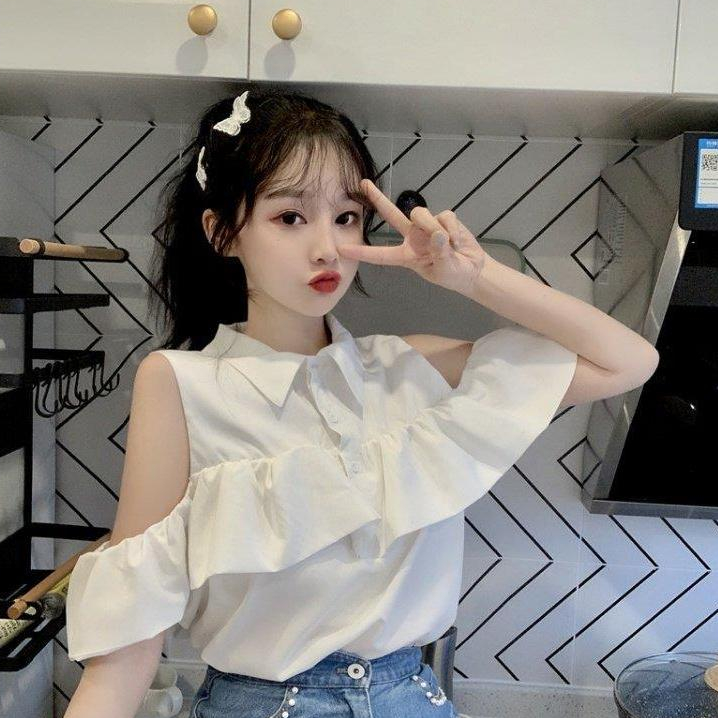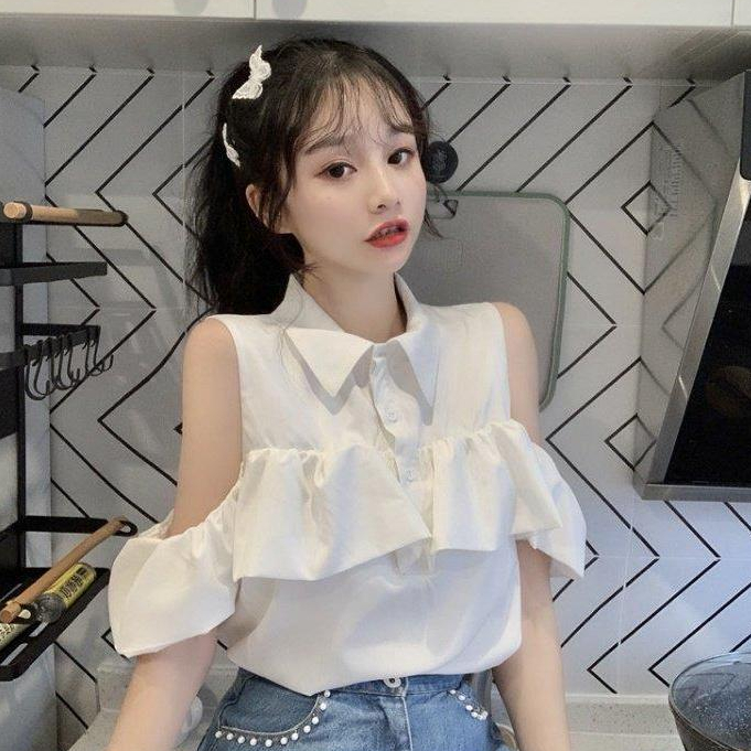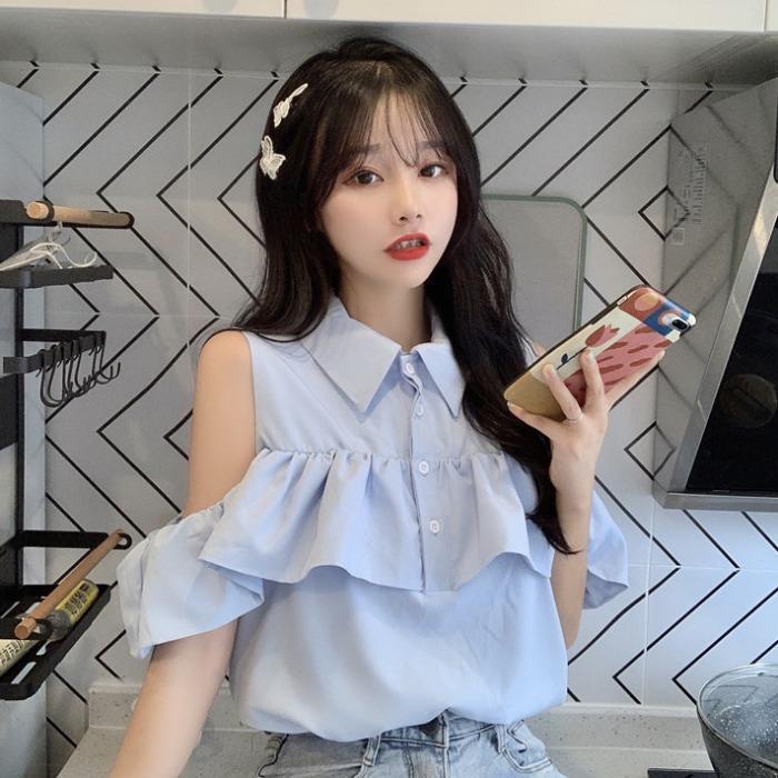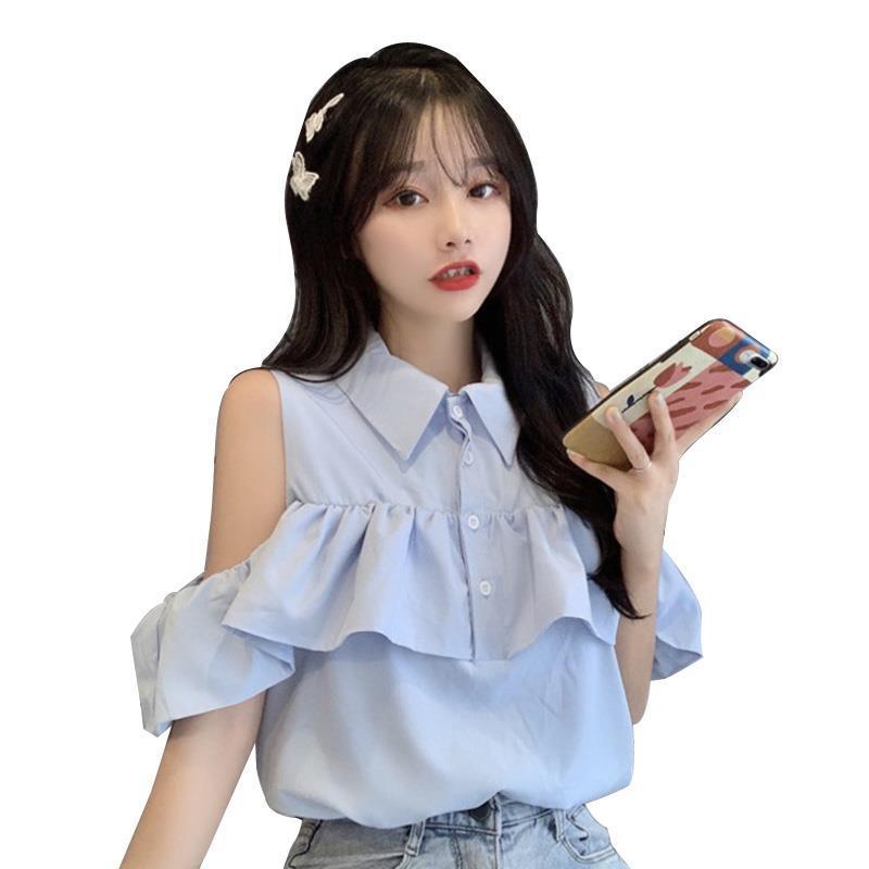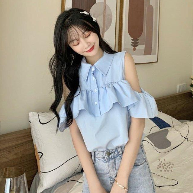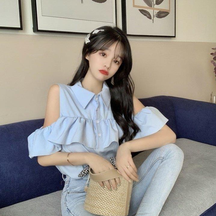 FUXI 短袖露肩襯衫女 娃娃衫翻領襯衫 短袖上衣 氣質甜美襯衣 女裝 衣服白色,S 38-45公斤|白色,M 45-52公斤|白色,L 52-58公斤|藍色,S 38-45公斤|藍色,M 45-52公斤|藍色,L 52-58公斤Shirts & BlousesFUXI 服喜行