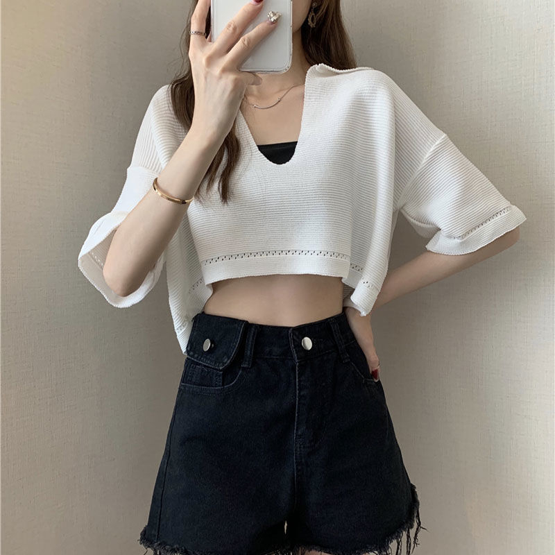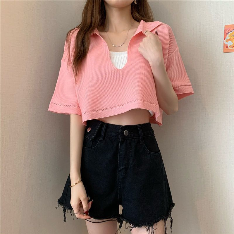 FUXI 短版針織上衣女 V領套頭針織衫 寬鬆罩衫 韓版薄款短袖上衣 翻領上衣 短板衣服 女裝黑色,均碼 38-60公斤|白色,均碼 38-60公斤|杏色,均碼 38-60公斤|粉色,均碼 38-60公斤|紫色,均碼 38-60公斤FUXI 服喜行