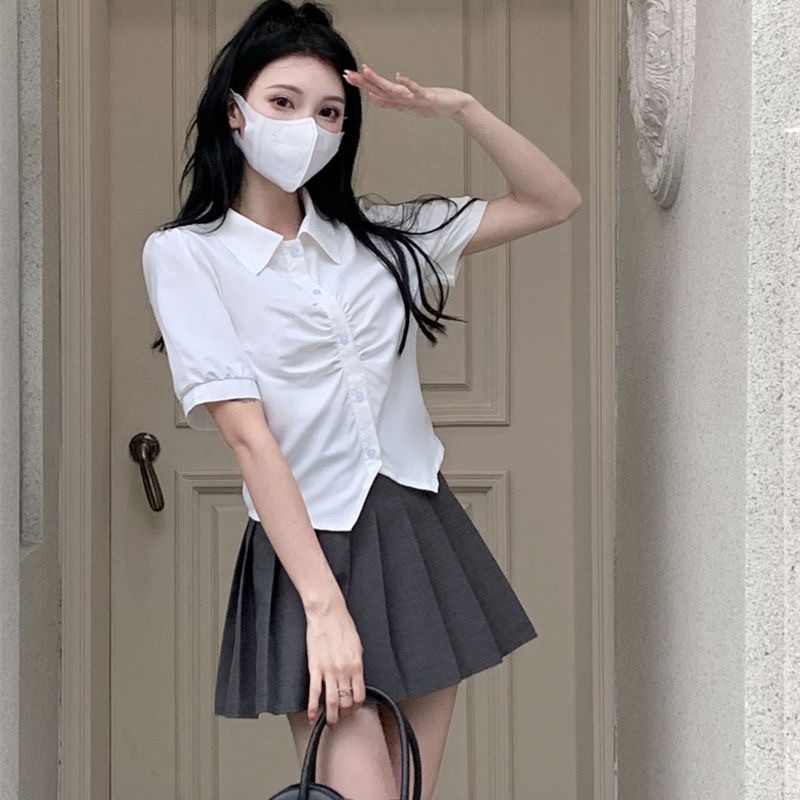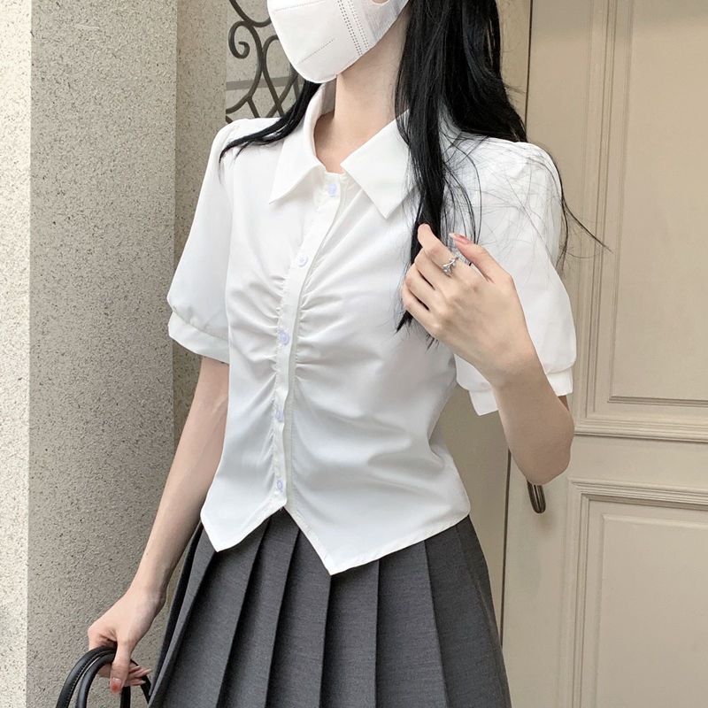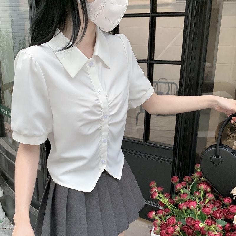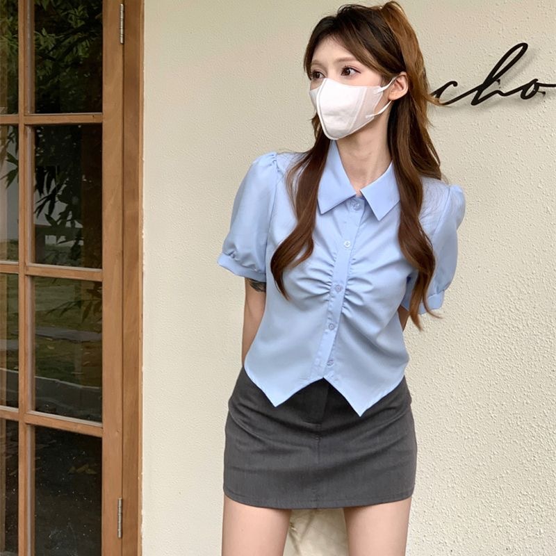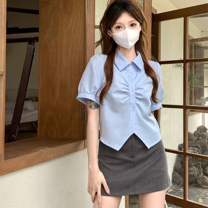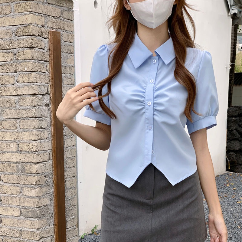 FUXI 短袖襯衫女 短版上衣 法式褶皺顯瘦白襯衫 泡泡袖短版襯衫 藍色襯衫 女生襯衣 女裝 衣服2205藍色,S 45公斤內|2205藍色,M 45-50公斤|2205藍色,L 50-58公斤|2205藍色,XL 58-65公斤|2205白色,S 45公斤內|2205白色,M 45-50公斤|2205白色,L 50-58公斤|2205白色,XL 58-65公斤Shirts & BlousesFUXI 服喜行
