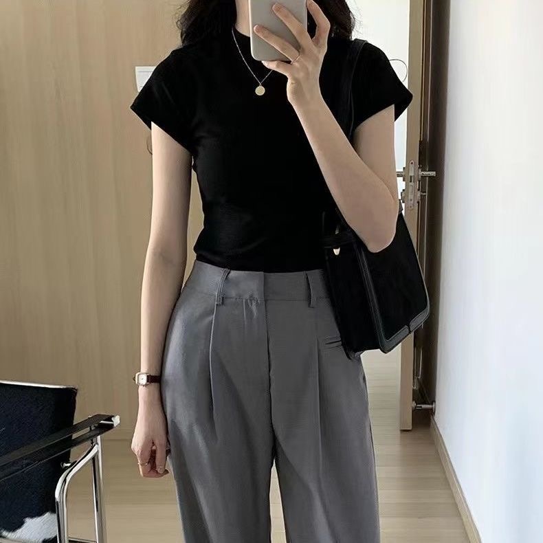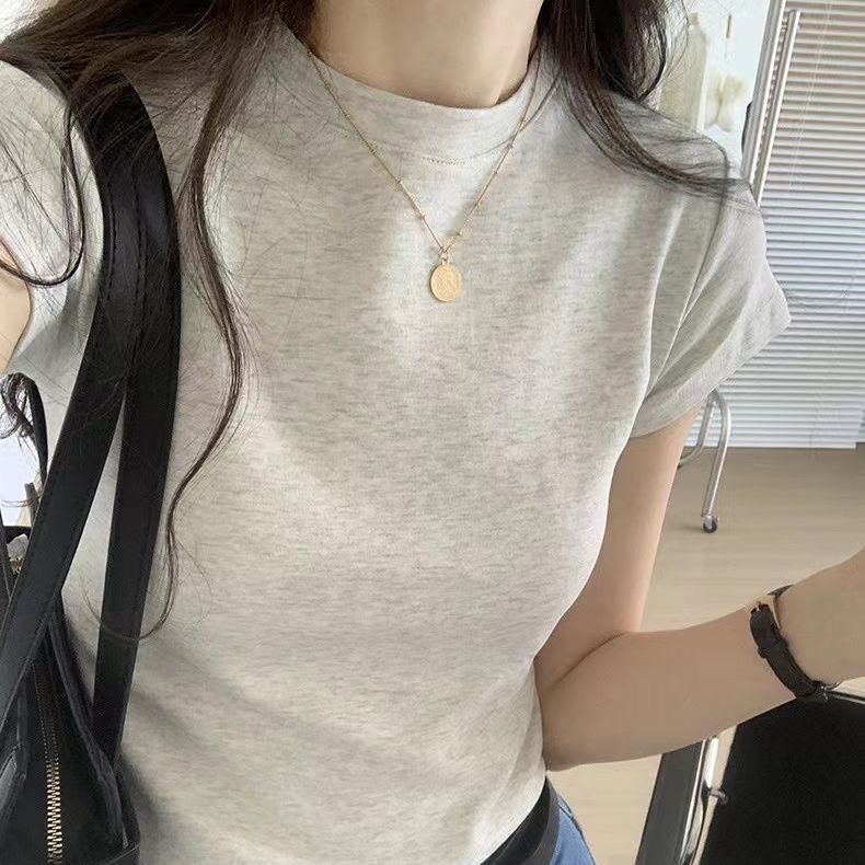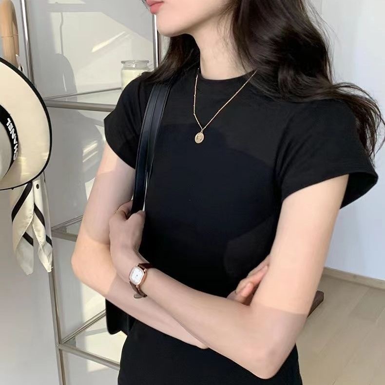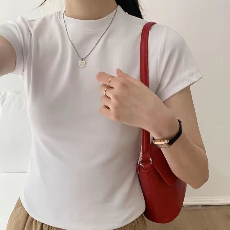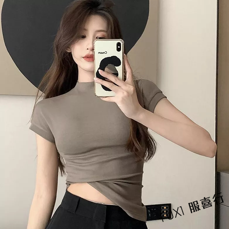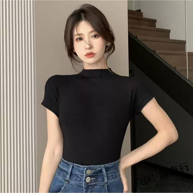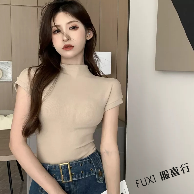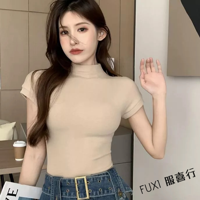 FUXI 韓版純欲半高領t恤女 性感素色上衣 短袖t恤 辣妹緊身修身內搭 正肩打底衫【T07】杏色,均碼 35-60公斤|白色,均碼 35-60公斤|藍色,均碼 35-60公斤|黑色,均碼 35-60公斤|奶咖,均碼 35-60公斤T-shirtsFUXI 服喜行
