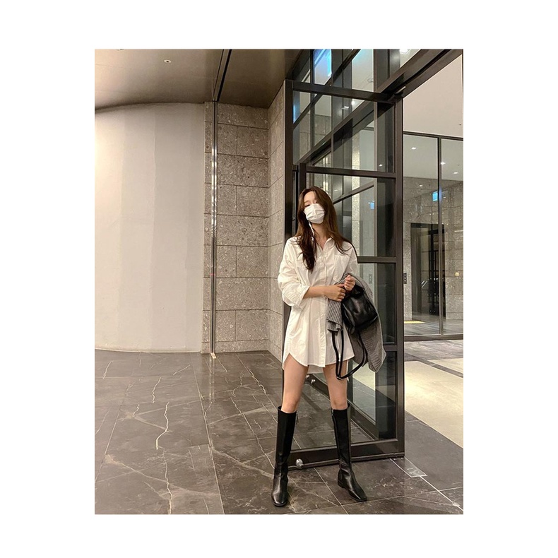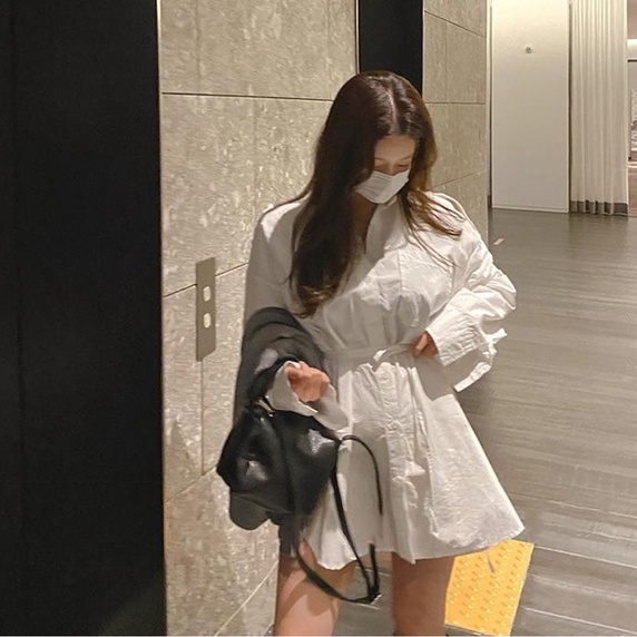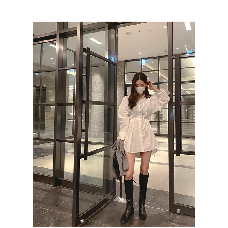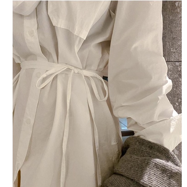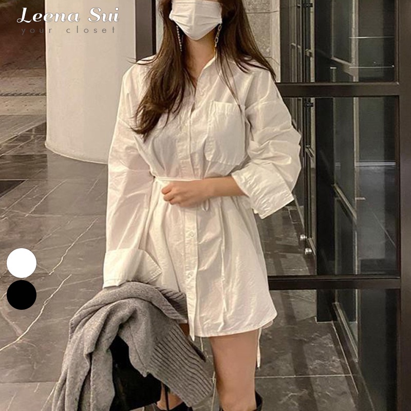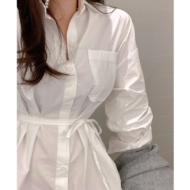 女生長袖白襯衫 下身失蹤長版襯衫 收腰綁帶男友風寬鬆襯 休閒寬鬆繫帶中長款襯衫連衣裙022608白|黑Shirts & BlousesLeenaSui ~台灣賣家 隔日到貨