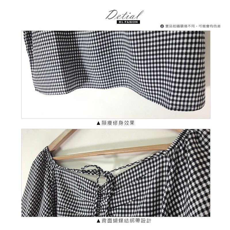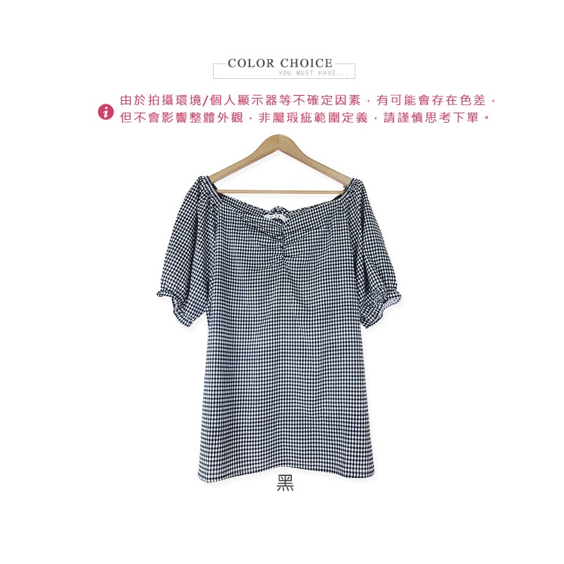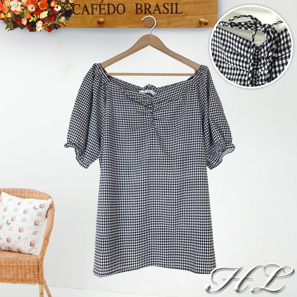 HL中大尺碼【22040037】簡雅格紋美胸後綁帶雪紡短袖上衣 1色48碼黑|50碼黑|44碼黑T-shirtsHL中大尺碼