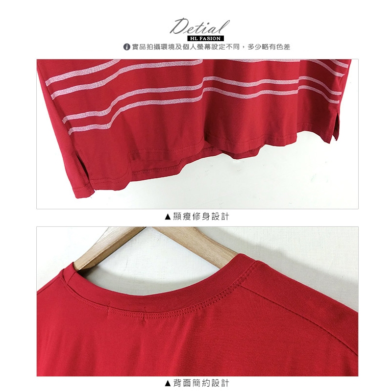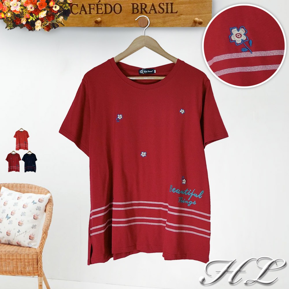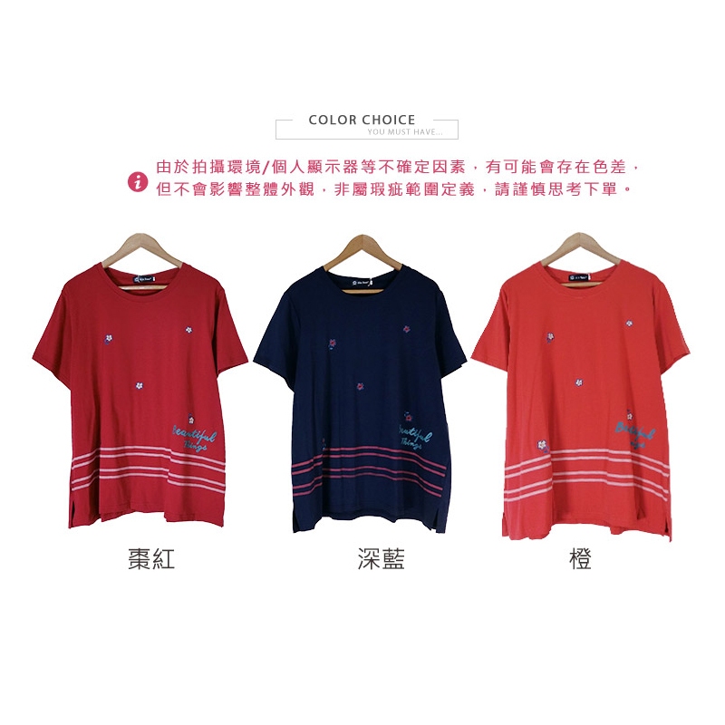 HL中大尺碼【25070081】甜妞小花橫條紋棉短袖上衣 3色48碼棗紅|48碼深藍|48碼橙T-shirtsHL中大尺碼