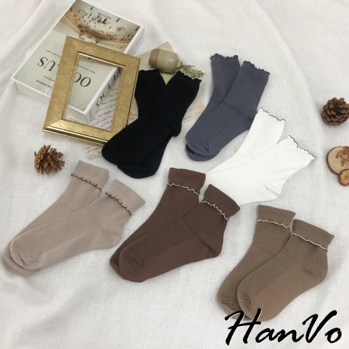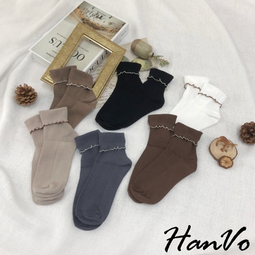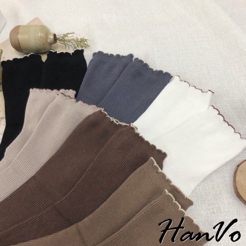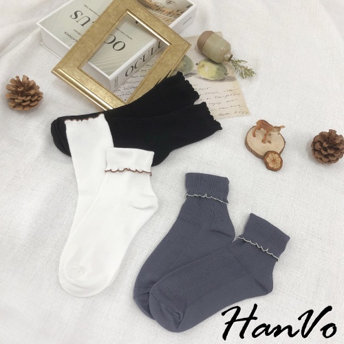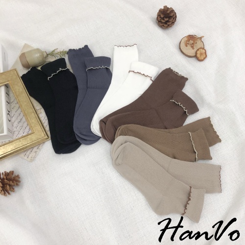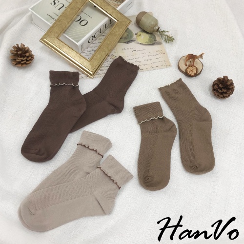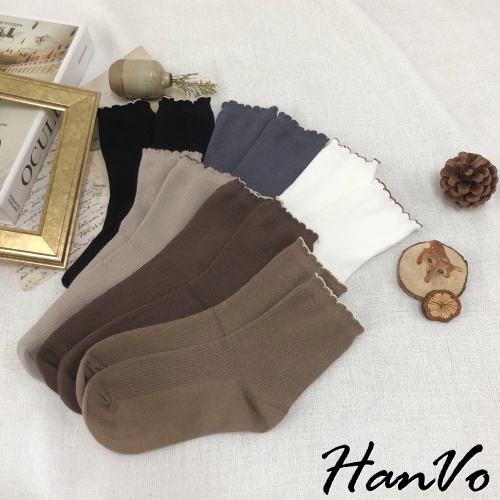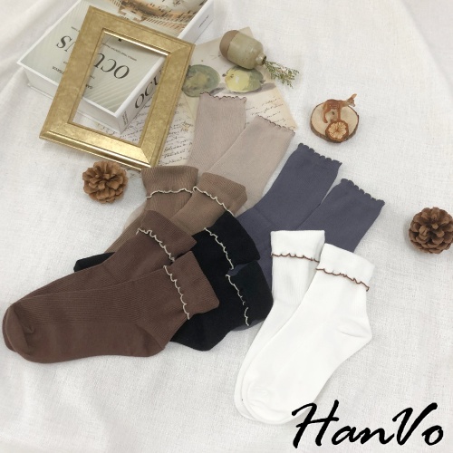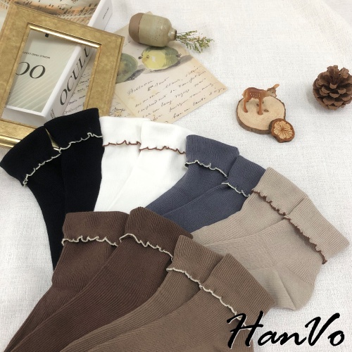 【HanVo】日系復古撞色木耳花邊中筒襪 甜美可愛百搭兩穿中筒短襪 白襪 中筒襪 襪子 女生配件 A12-6069深咖|灰霧藍|黑色|白色|燕麥|卡其SocksHanVo Wear Collection
