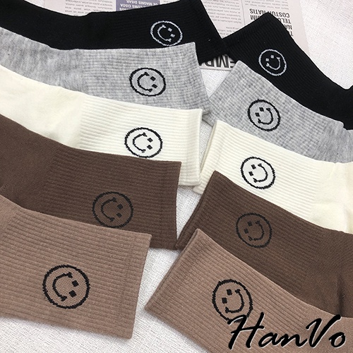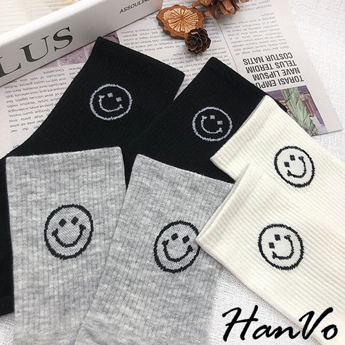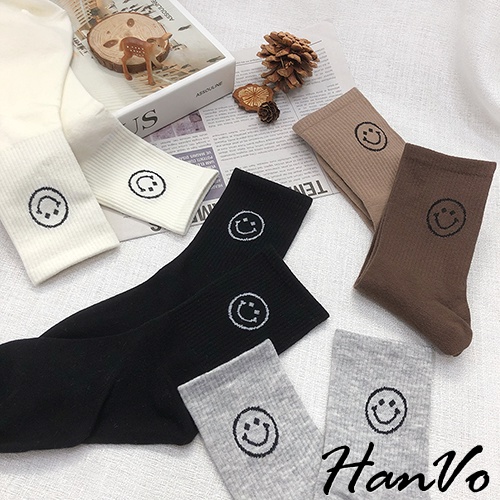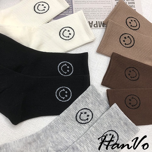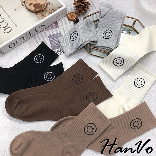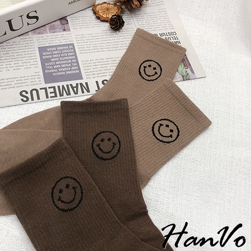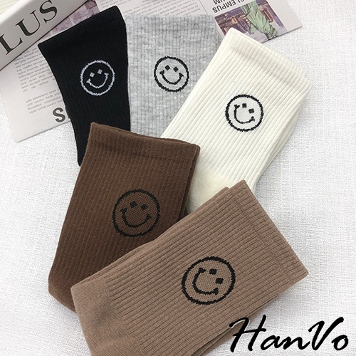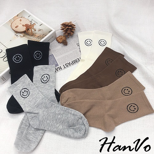 【HanVo】簡約百搭笑臉中筒襪 韓系簡約百搭舒適棉質襪 韓國潮流 女襪 白襪 中筒襪 女生配件 A12-6164灰色|奶白|深咖|卡其|黑色SocksHanVo Wear Collection