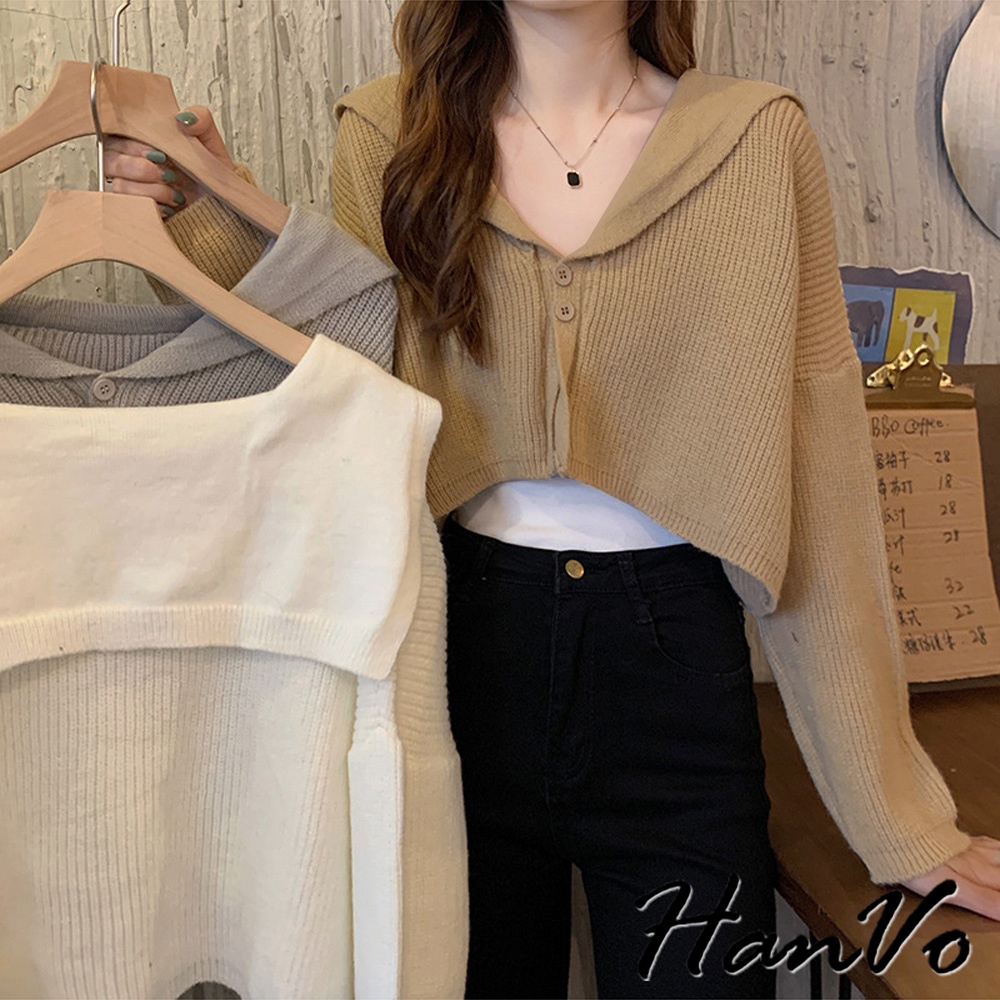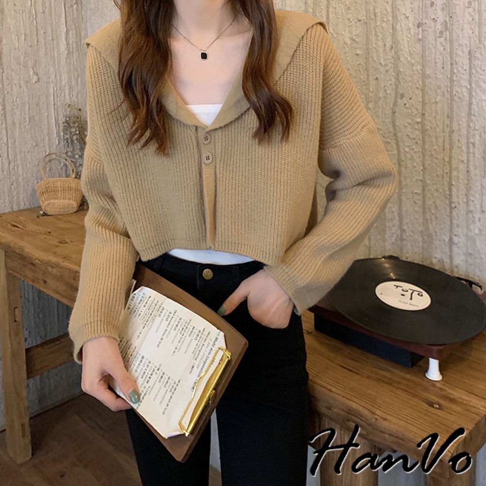 【HanVo】大V領直坑紋短版針織衣 秋冬設計感質感外套 韓系女裝 女生衣著 A02-0588卡其HanVo Wear Collection