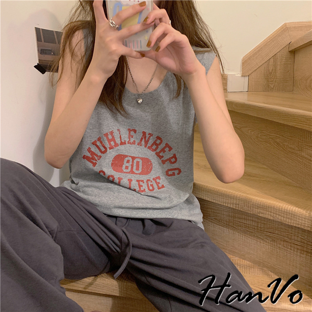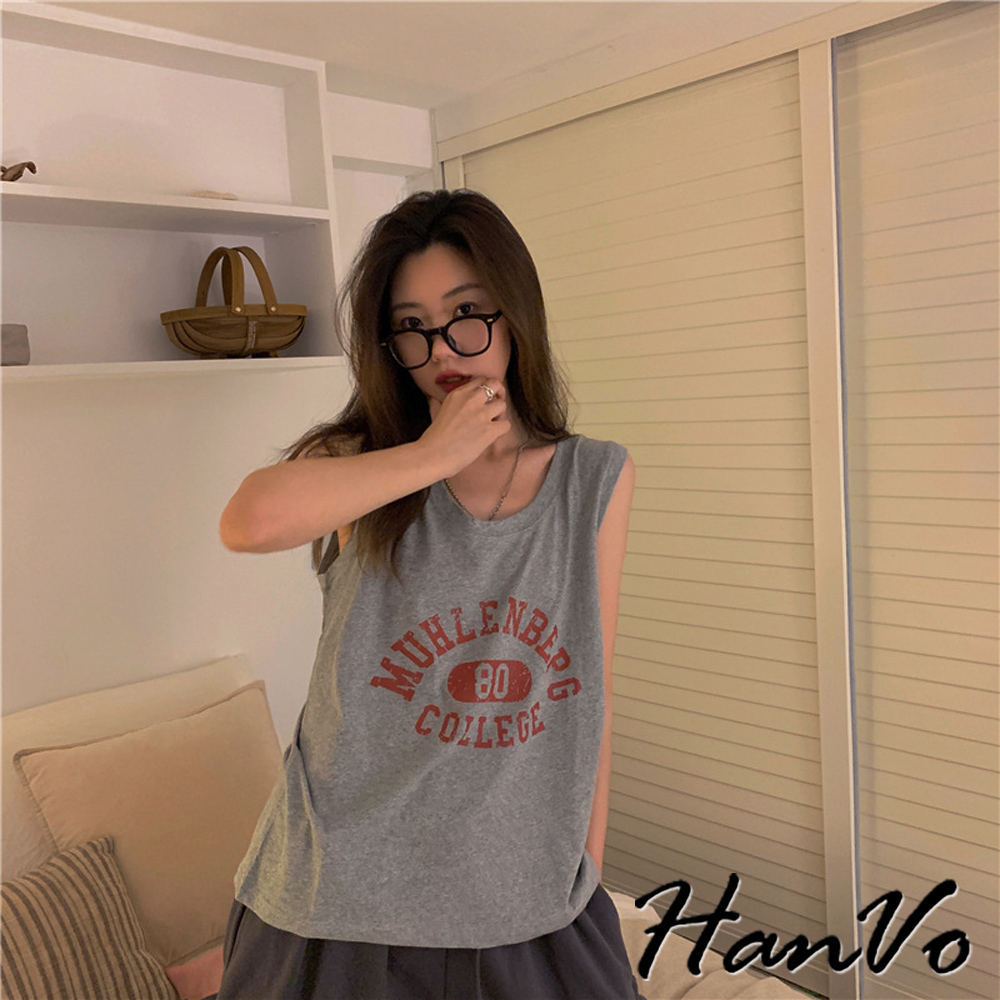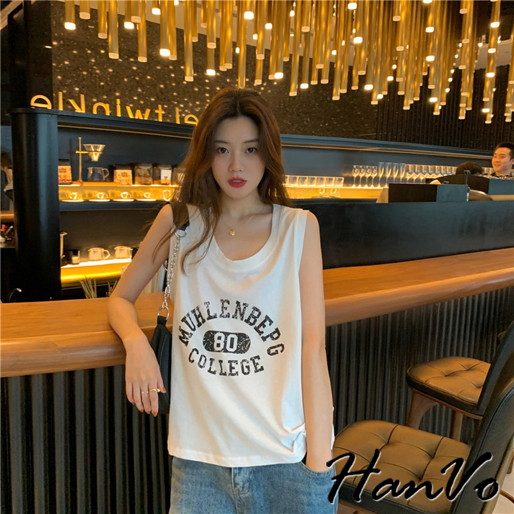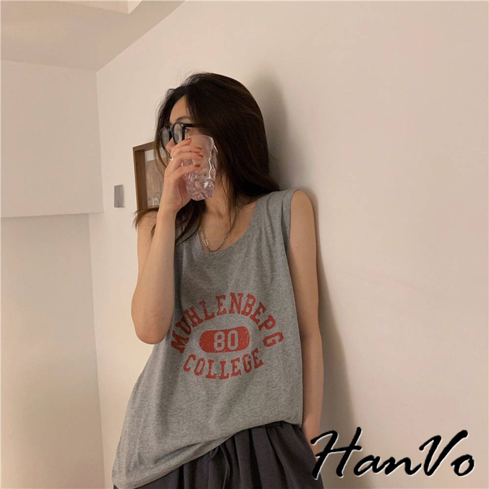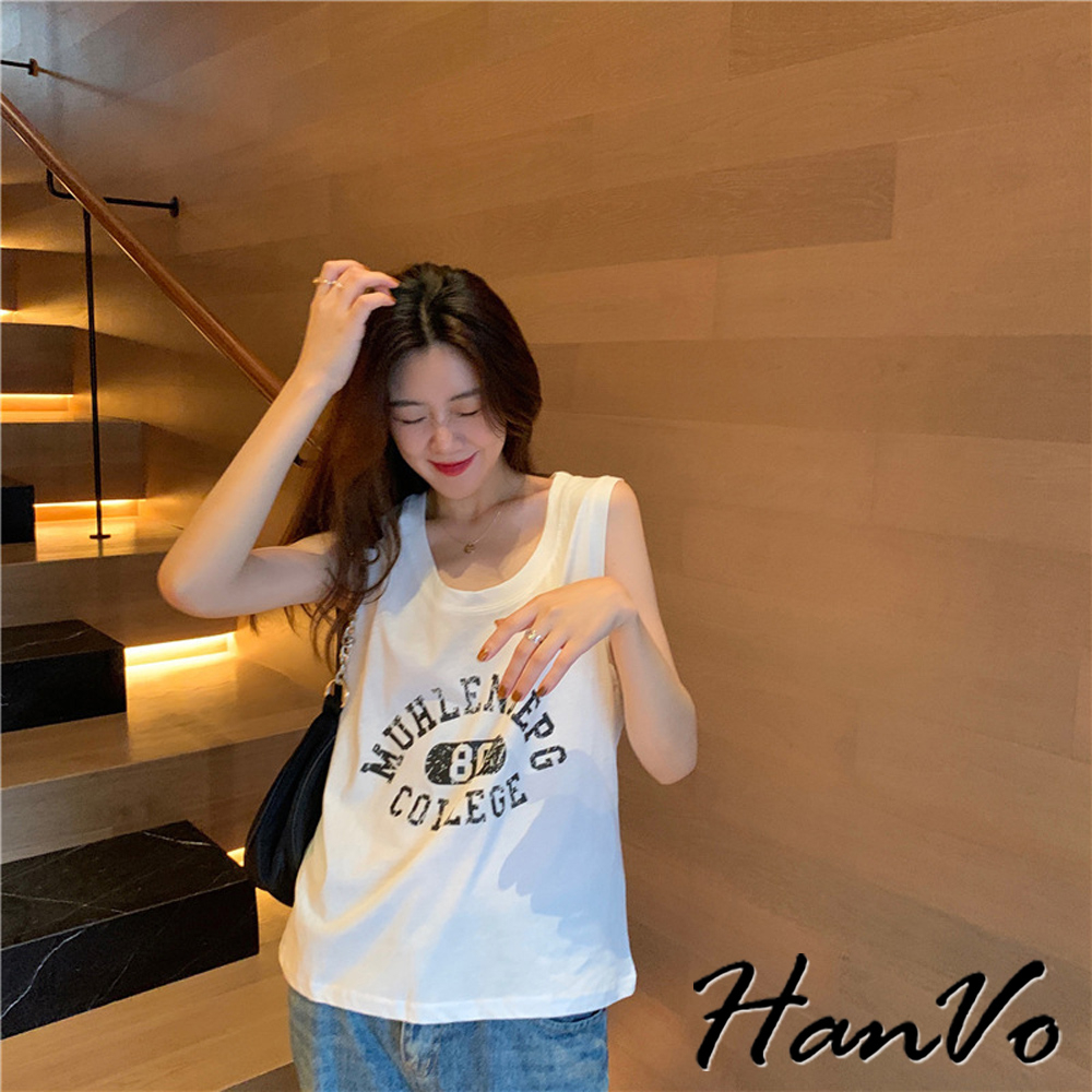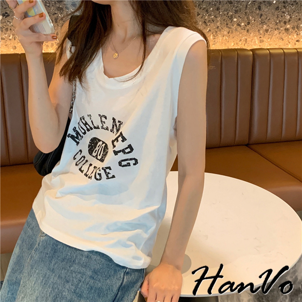 【HanVo】COLLEGR斑駁印花無袖背心上衣 韓版休閒舒適透氣百搭上衣 韓系簡約日常背心 女生衣著 A01-0090白色|灰色OthersHanVo Wear Collection