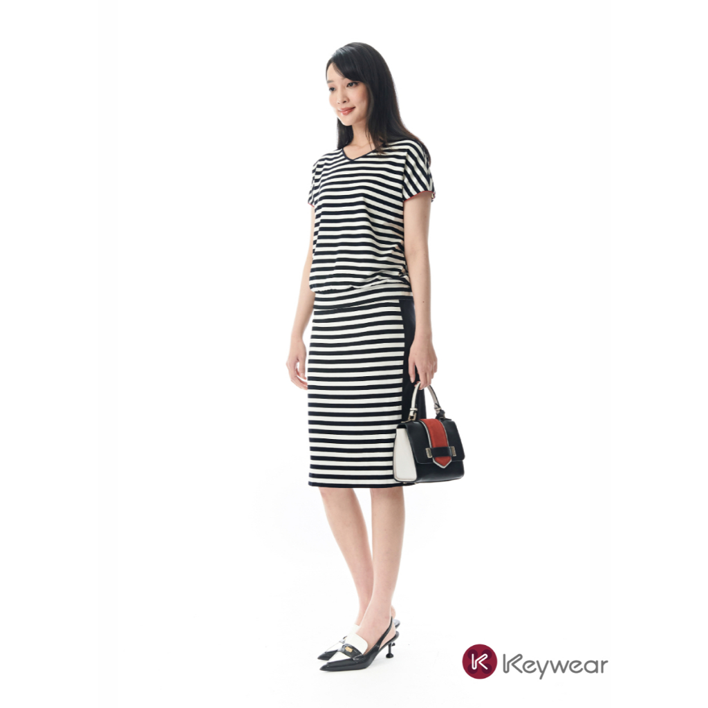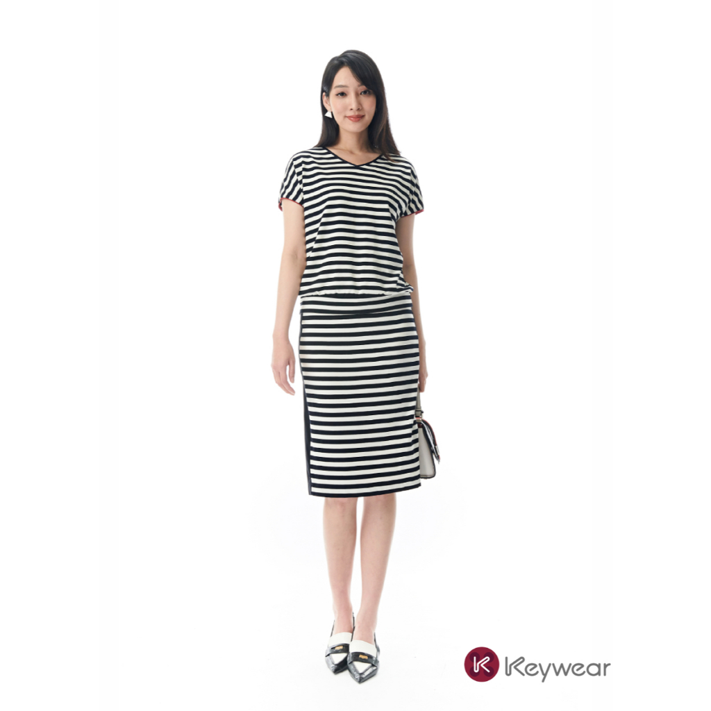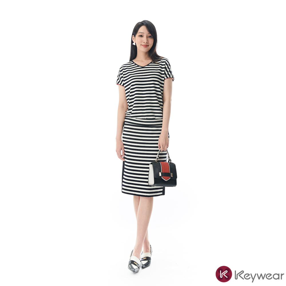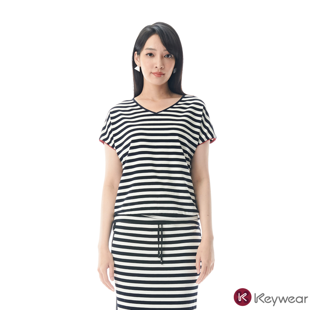 【KeyWear 奇威名品】經典休閒條紋V領垂袖上衣 黑色M|L|ST-shirtsKeywear奇威官方旗艦店