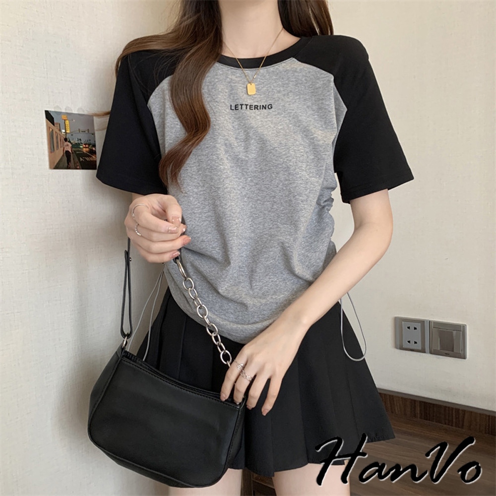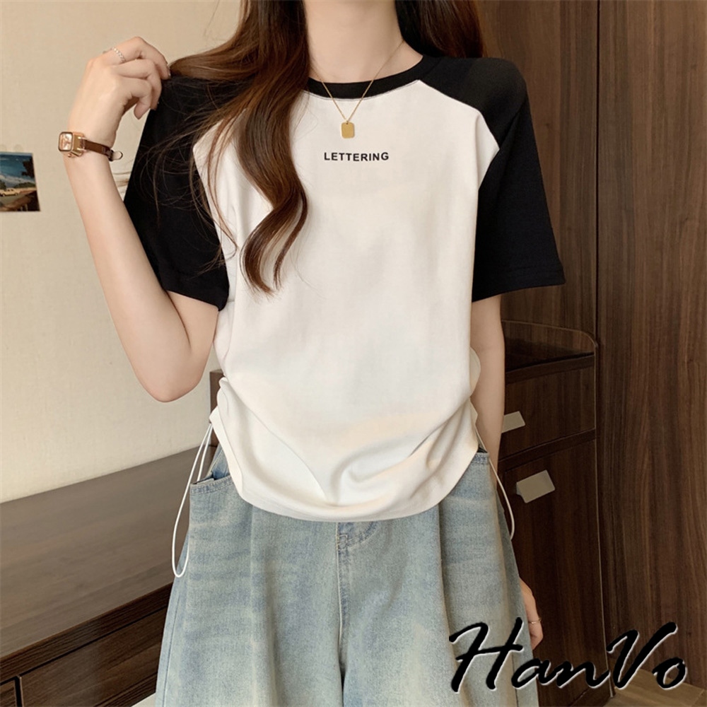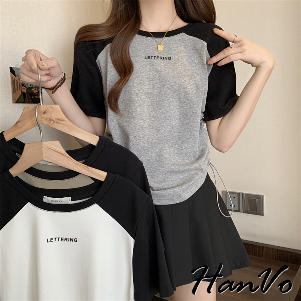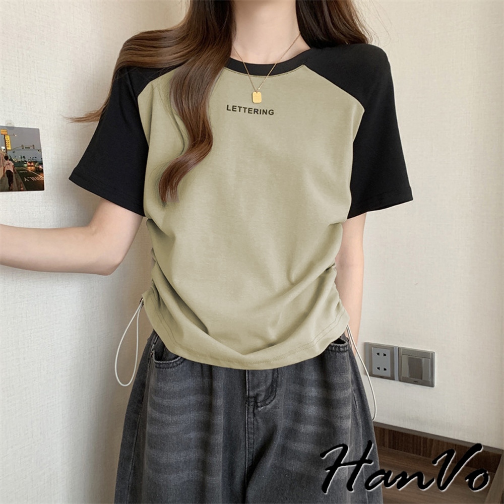 【HanVo】涼感圓領撞色側抽繩上衣 個性時尚設計感 韓系百搭 韓系女裝 女生衣著 A01-0260灰色|綠色|白色T-shirtsHanVo Wear Collection