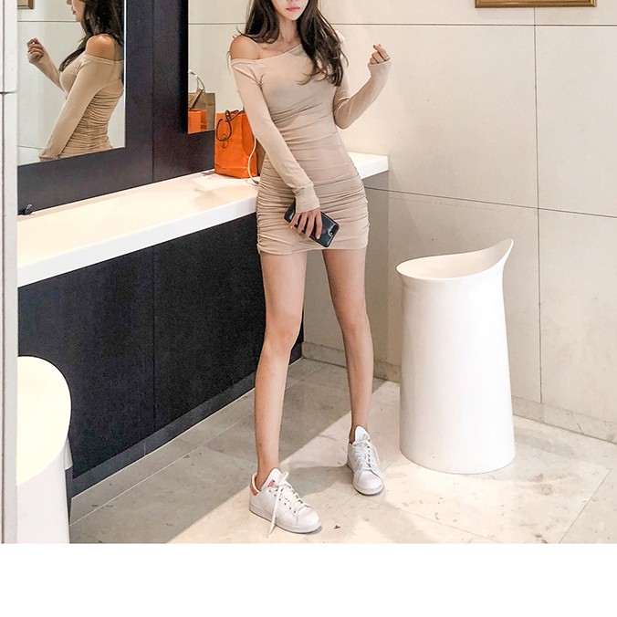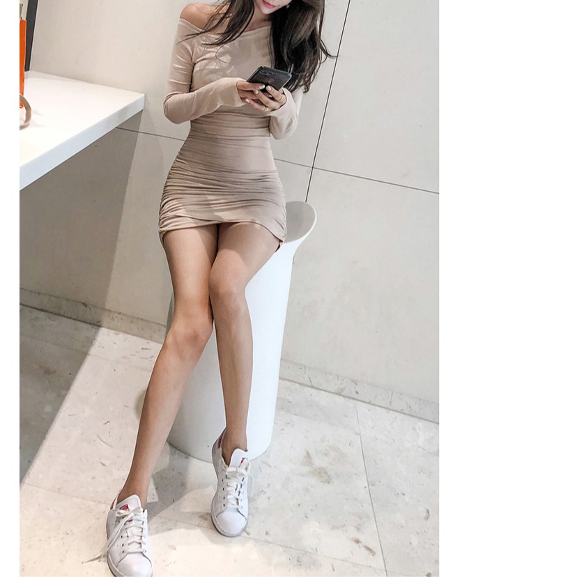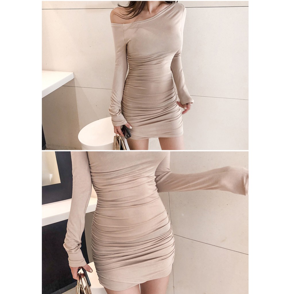 長袖洋裝 貼身連衣裙 晚宴禮服婚紗 一字領洋裝 性感一字領露肩皺褶長袖連衣裙 062283黑|卡其LeenaSui ~台灣賣家 隔日到貨
