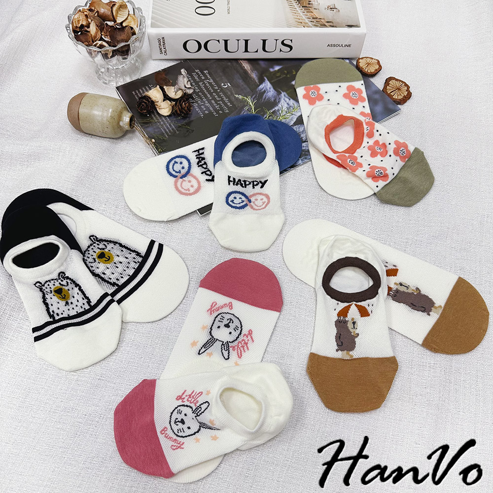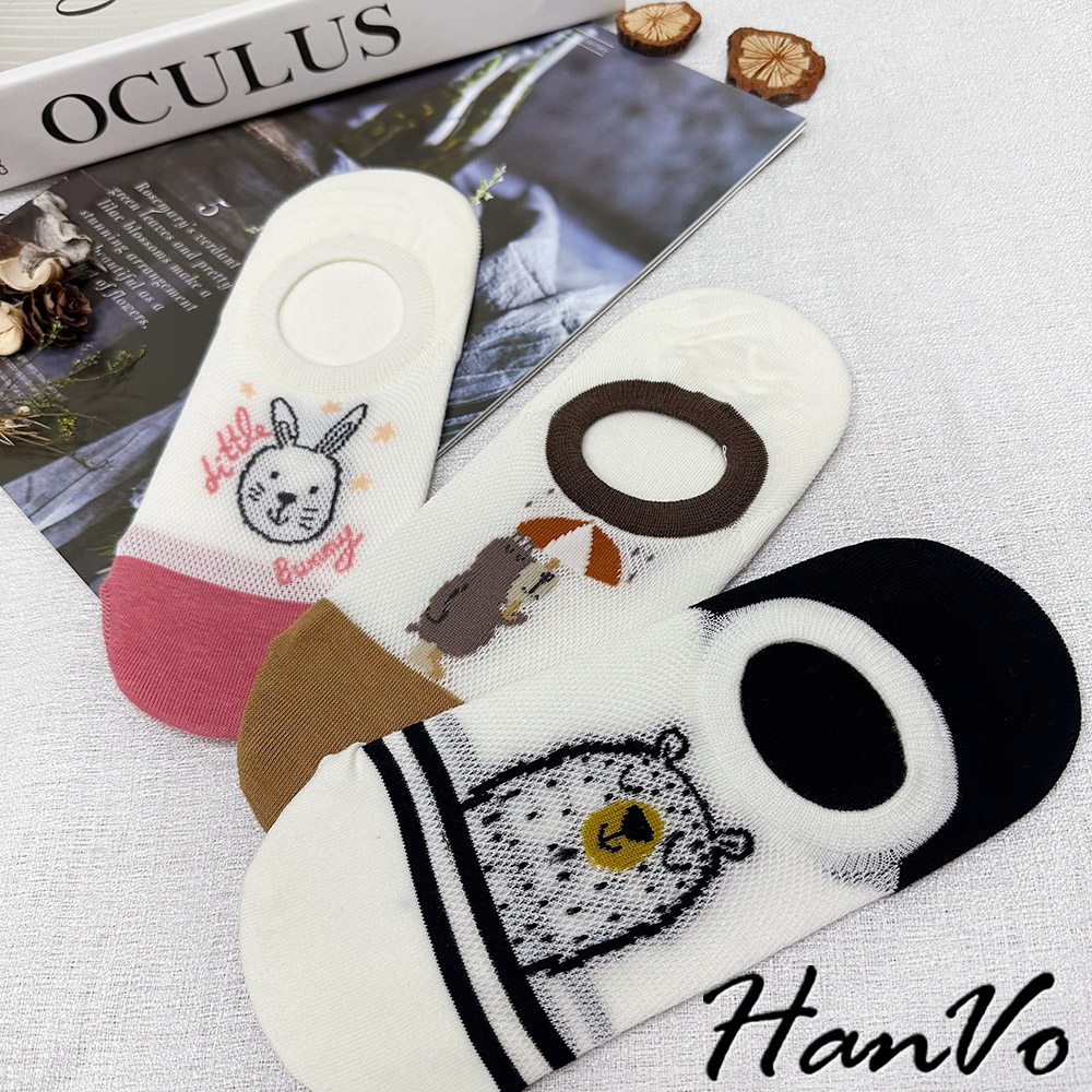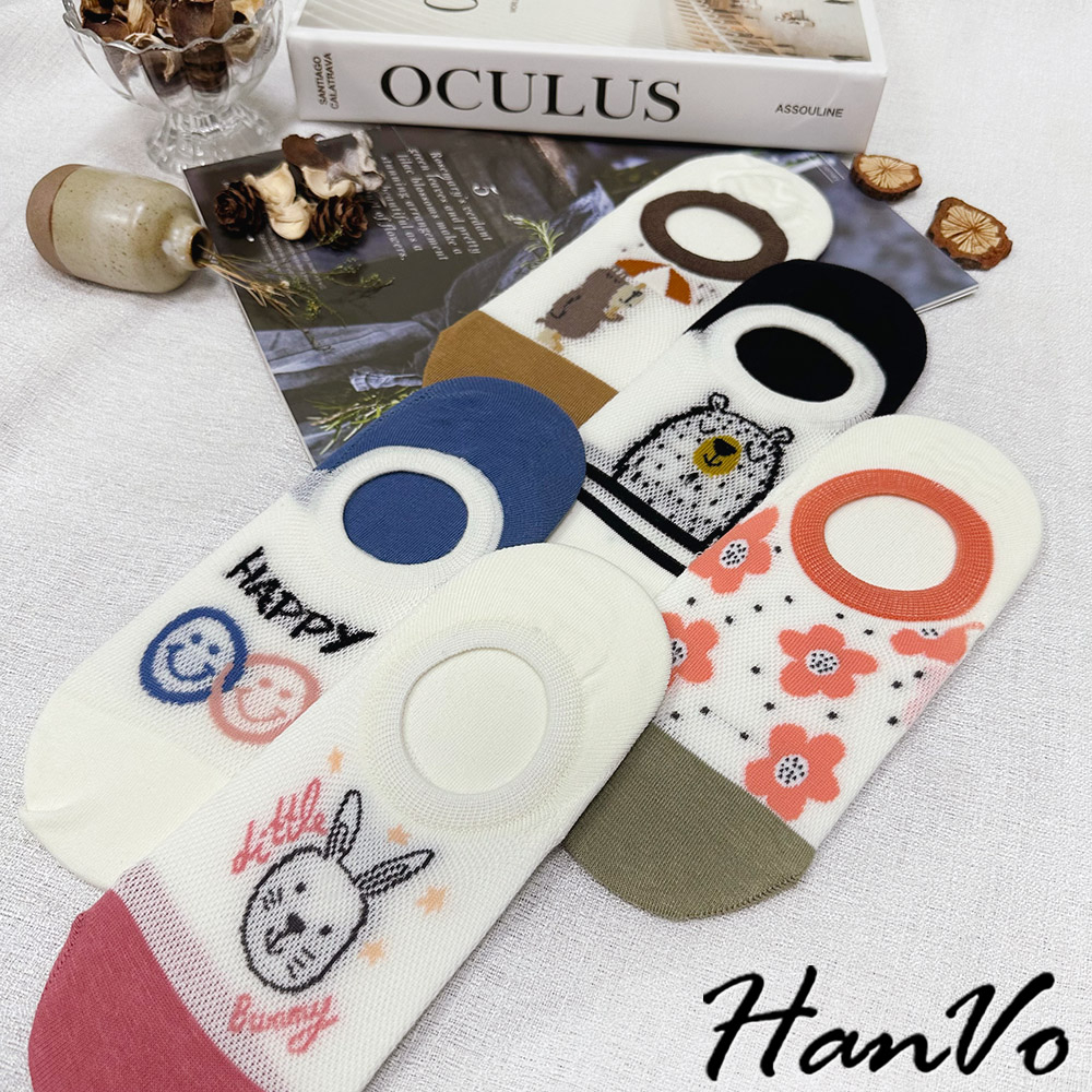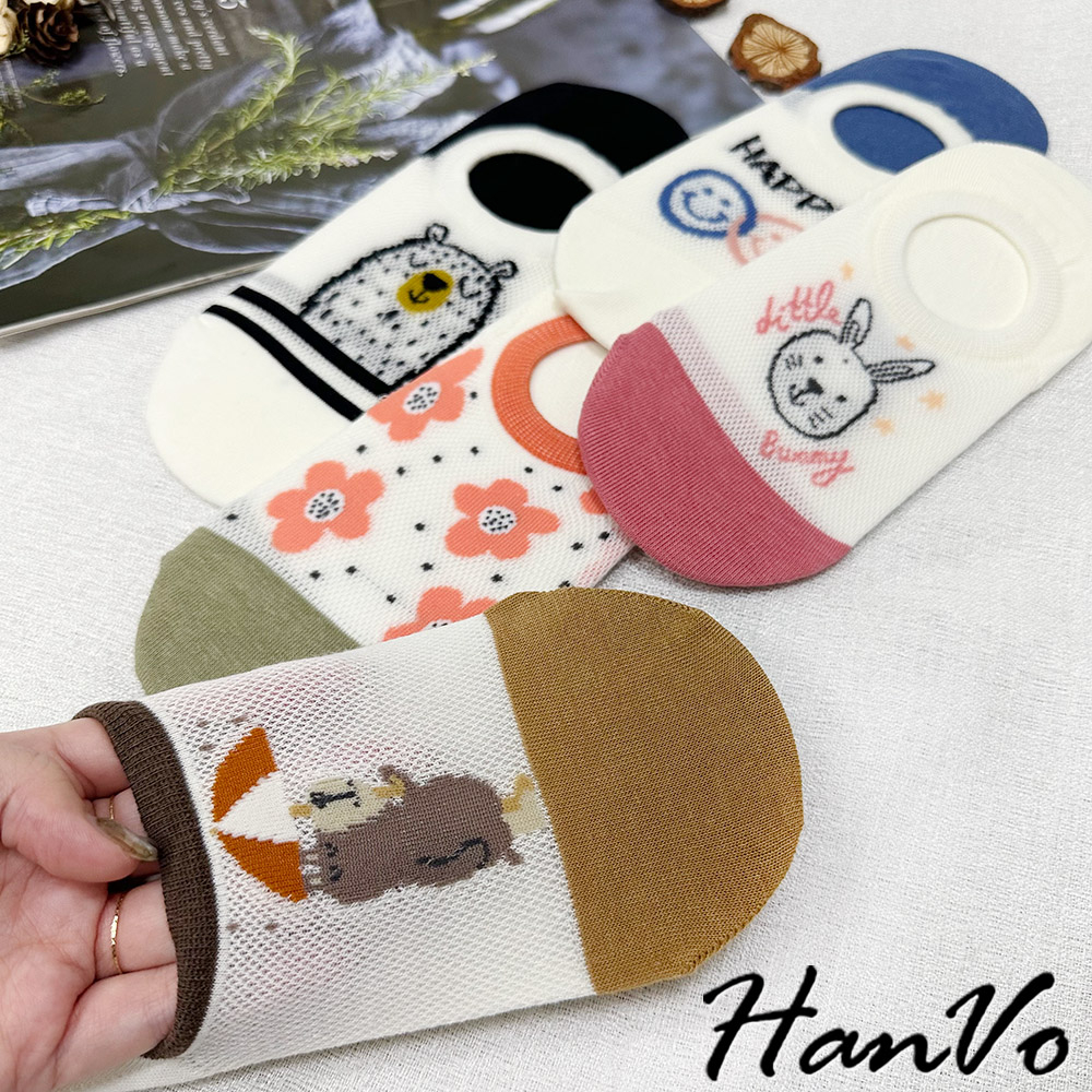 【HanVo】超萌動物園透氣網眼隱形襪 吸濕排汗 韓系百搭舒適棉質襪 韓國潮流時尚休閒襪 女生配件 A12-6259粉橘小花|撐傘小熊|粉紅兔兔|Happy笑臉|黑色熊熊SocksHanVo Wear Collection