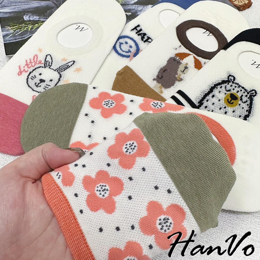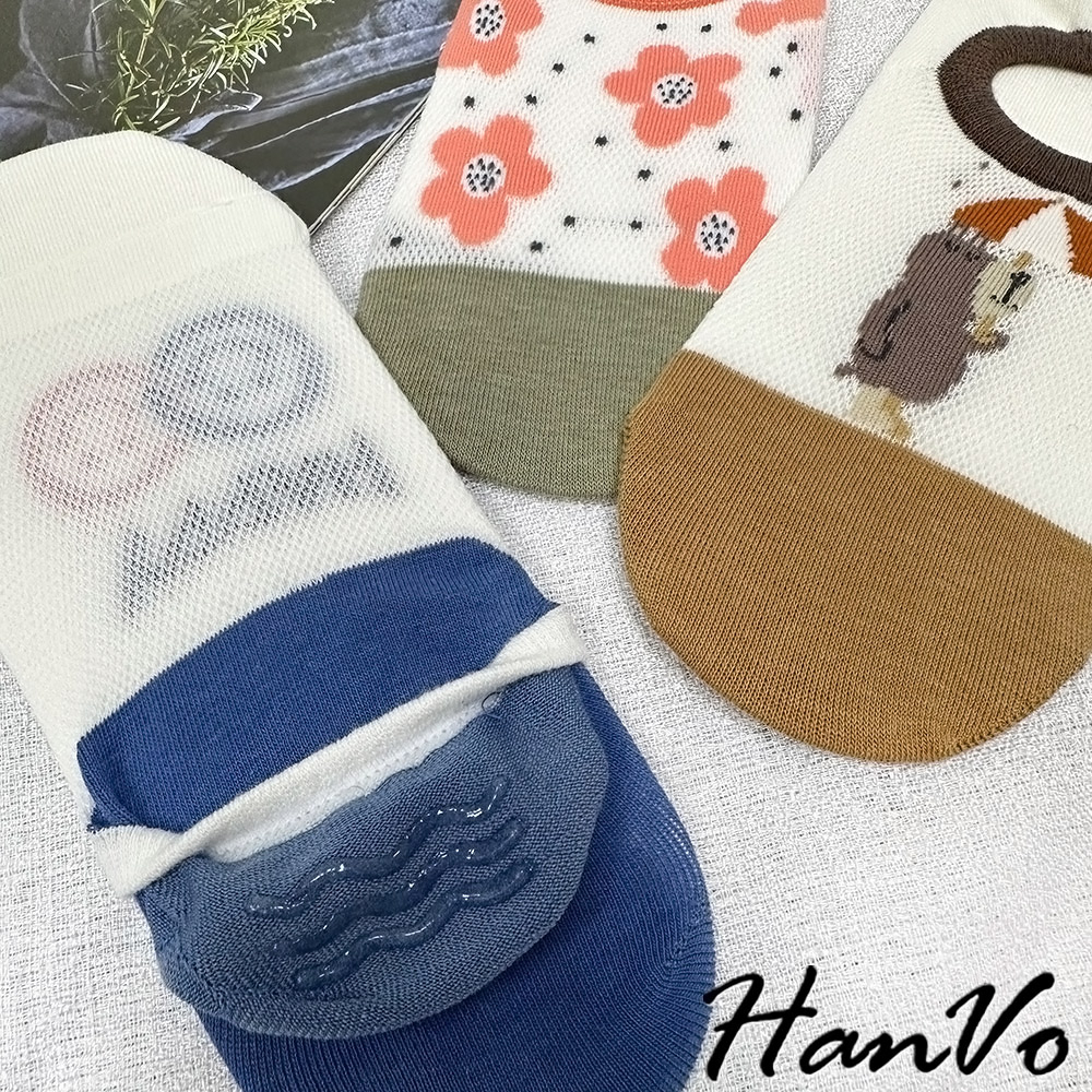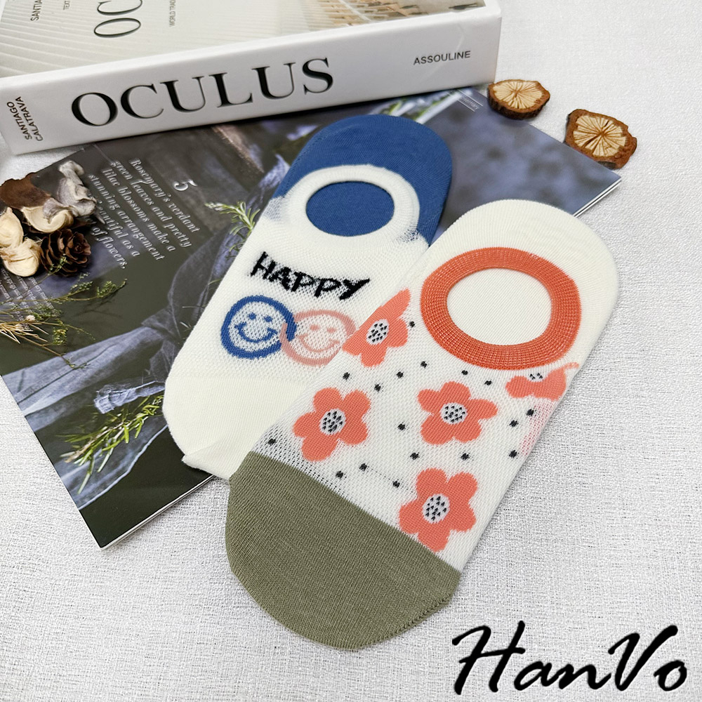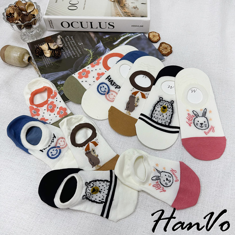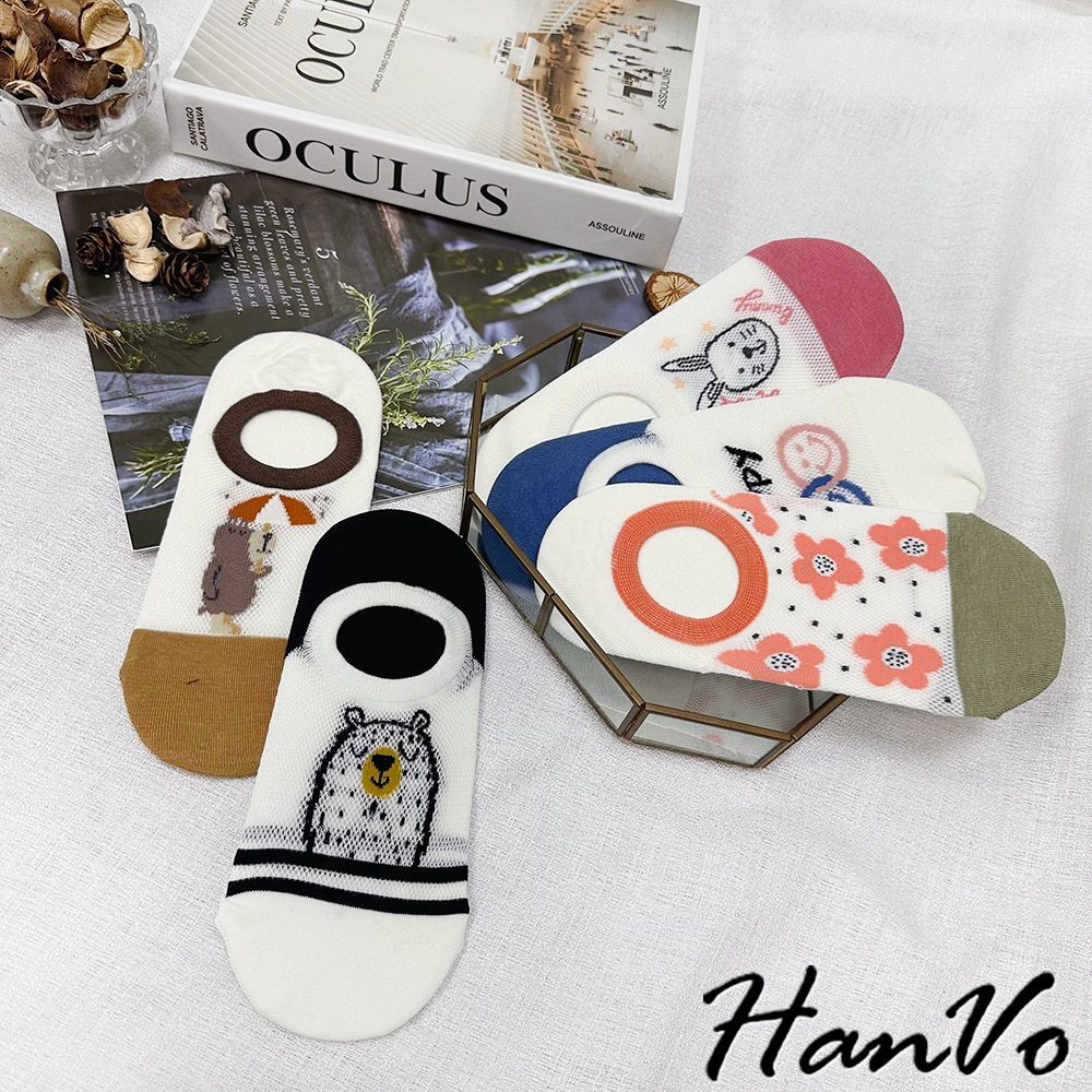 【HanVo】超萌動物園透氣網眼隱形襪 吸濕排汗 韓系百搭舒適棉質襪 韓國潮流時尚休閒襪 女生配件 A12-6259粉橘小花|撐傘小熊|粉紅兔兔|Happy笑臉|黑色熊熊SocksHanVo Wear Collection