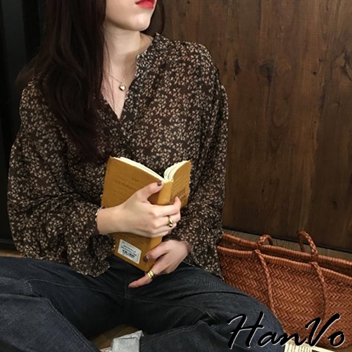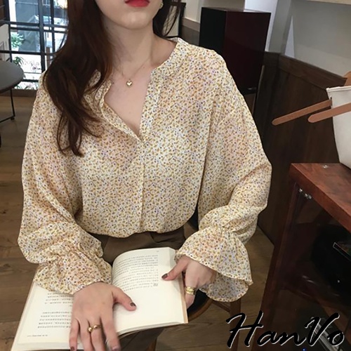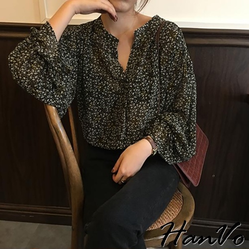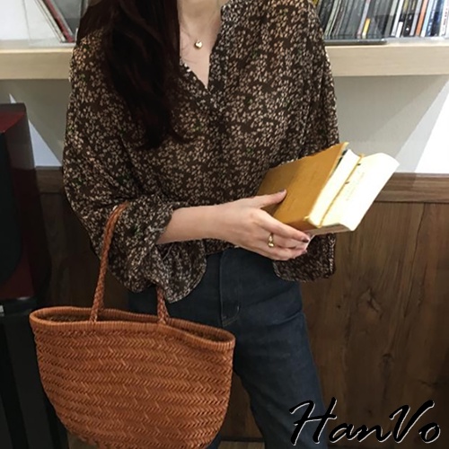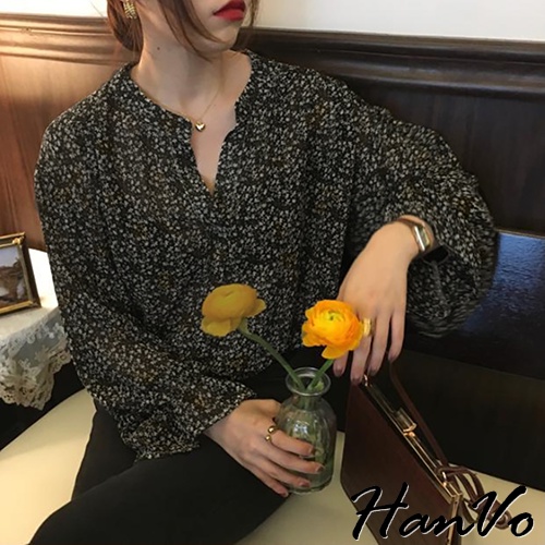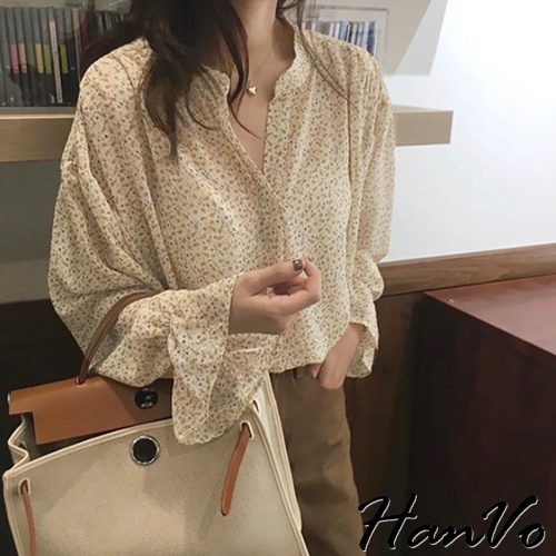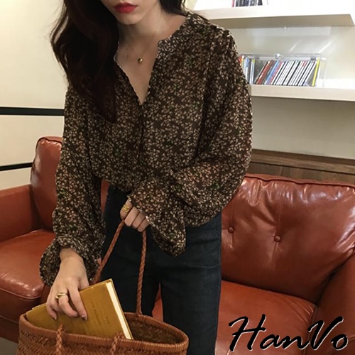 【HanVo】大地色系小碎花蓬袖上衣 韓系時髦百搭寬鬆顯瘦修身襯衫上衣 韓國女裝 女生衣著 A02-1760黃杏|黑色|深咖Shirts & BlousesHanVo Wear Collection