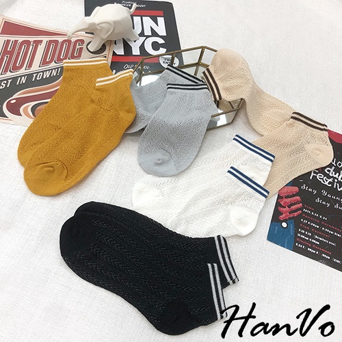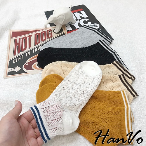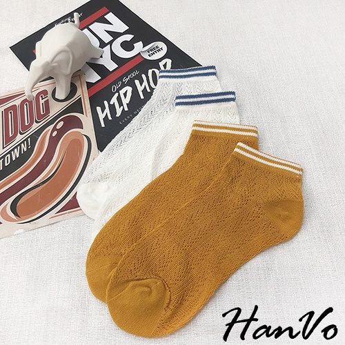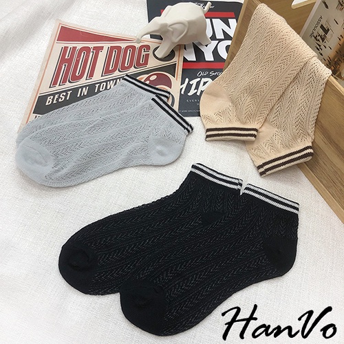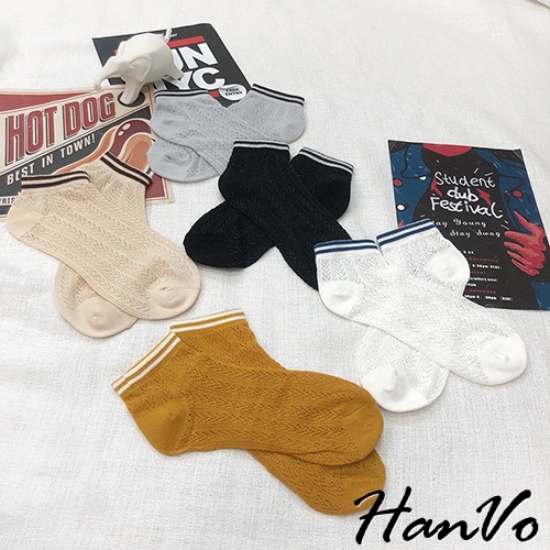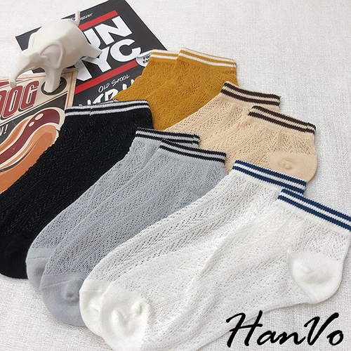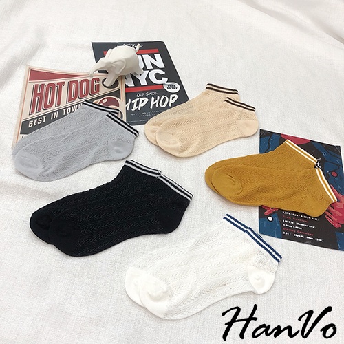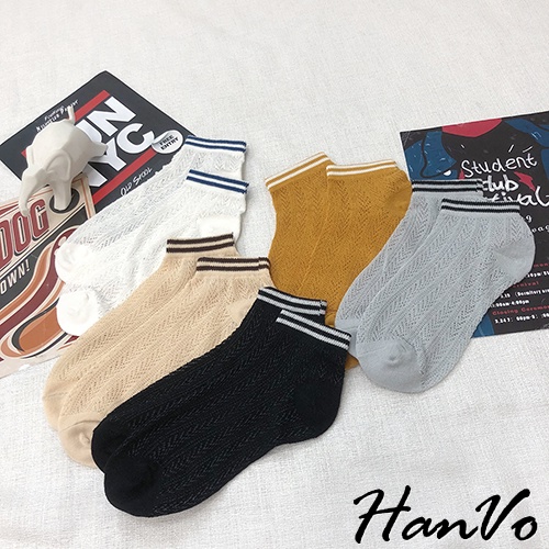 【HanVo】春天鏤空織紋線條短襪 韓系簡約百搭舒適鏤空短襪 韓國潮流時尚休閒襪 女生配件 A12-6125黑色|白色|雲灰|姜黃|米杏SocksHanVo Wear Collection