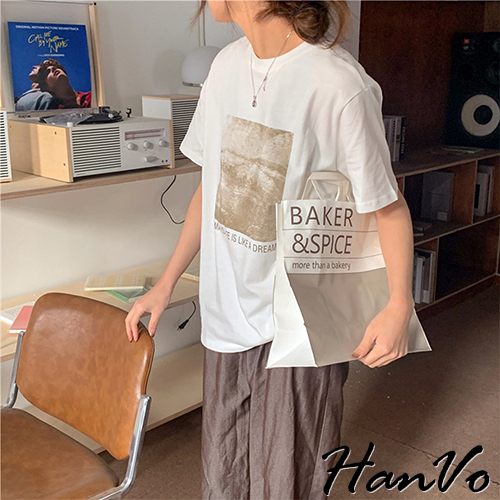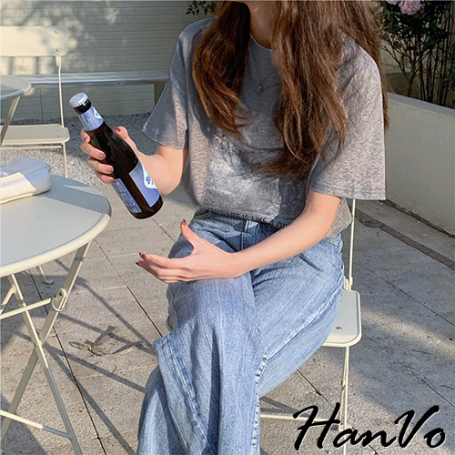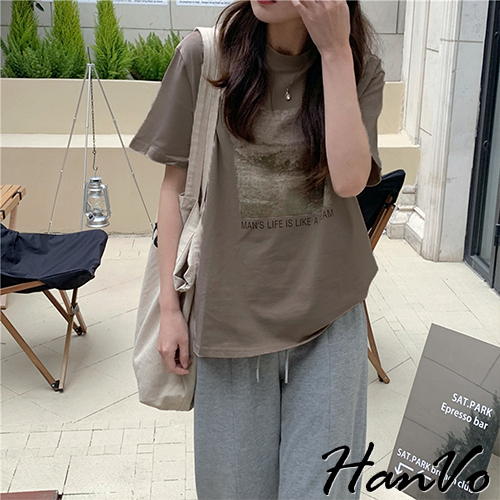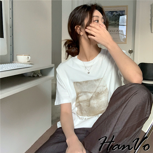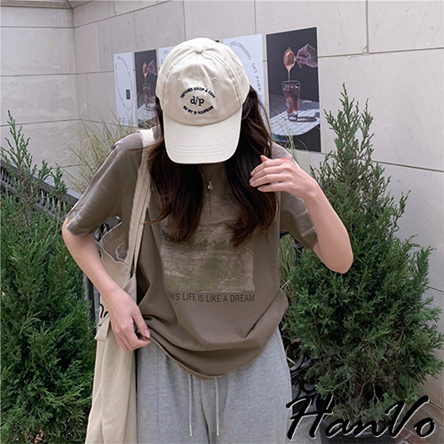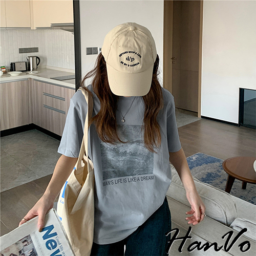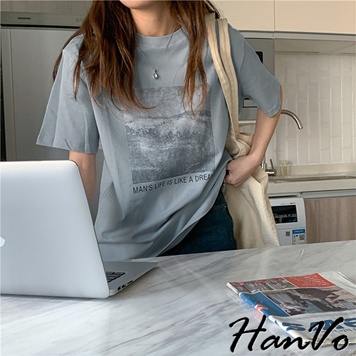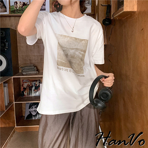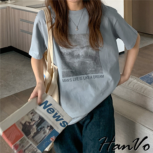 【HanVo】人生如夢天空個性T恤 韓國時尚百搭顯瘦圓領短袖上衣 韓版簡約日常T 韓系女裝 女生衣著 A01-1429灰色|卡其|霧藍|白色T-shirtsHanVo Wear Collection