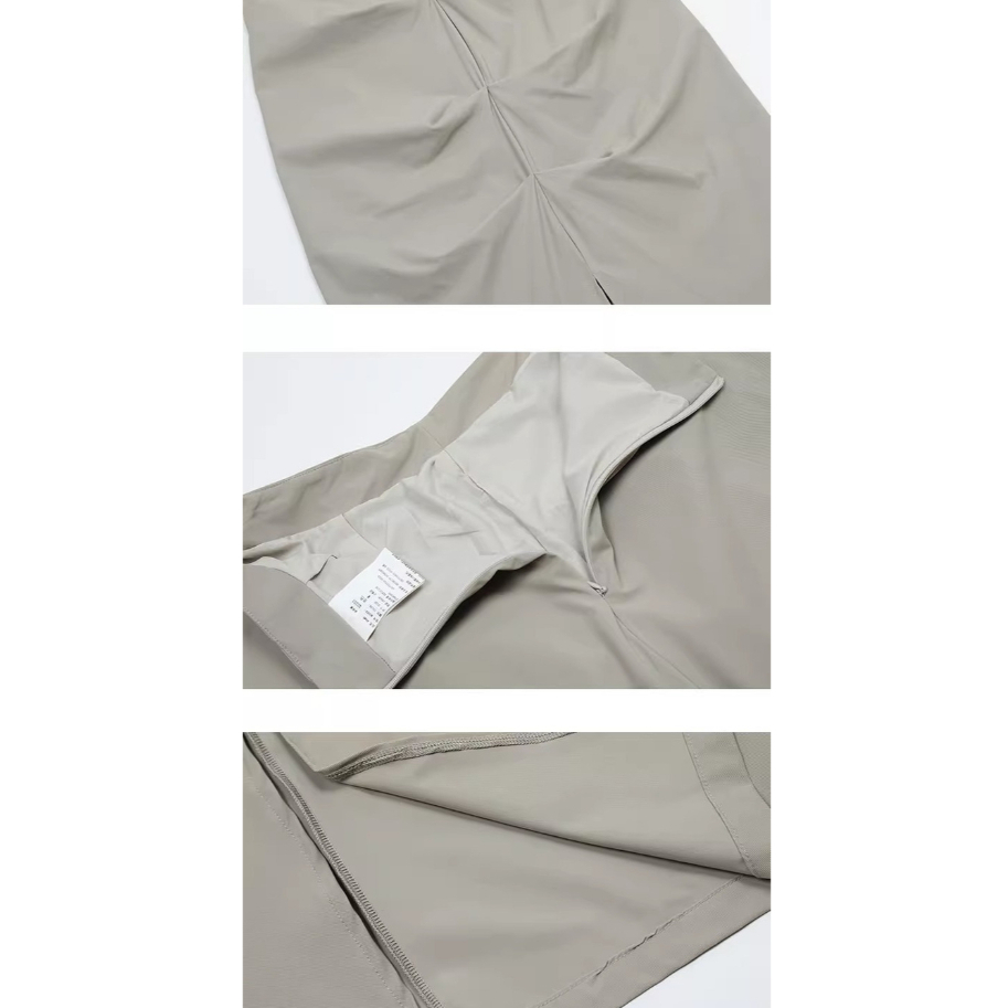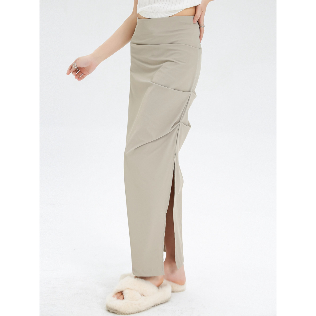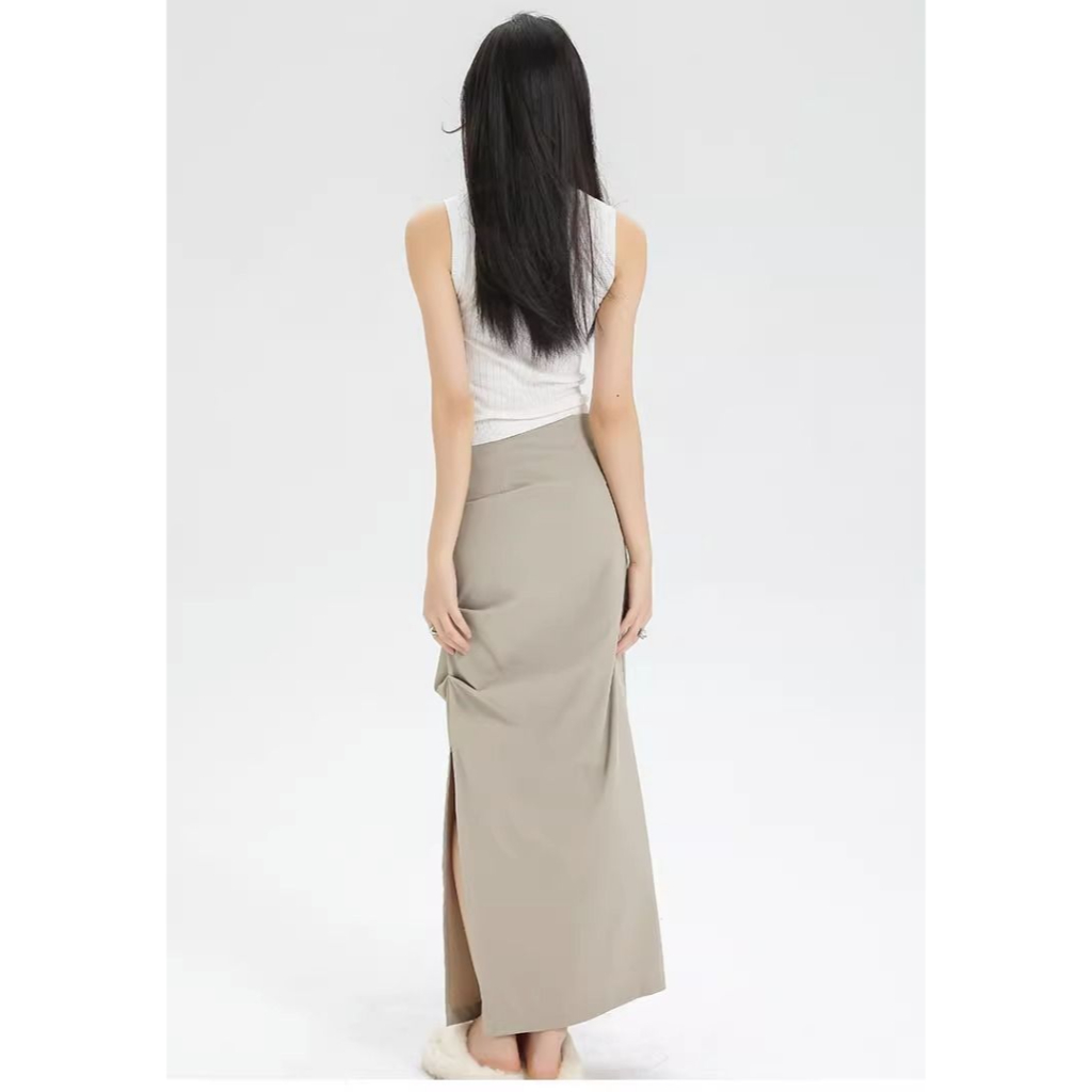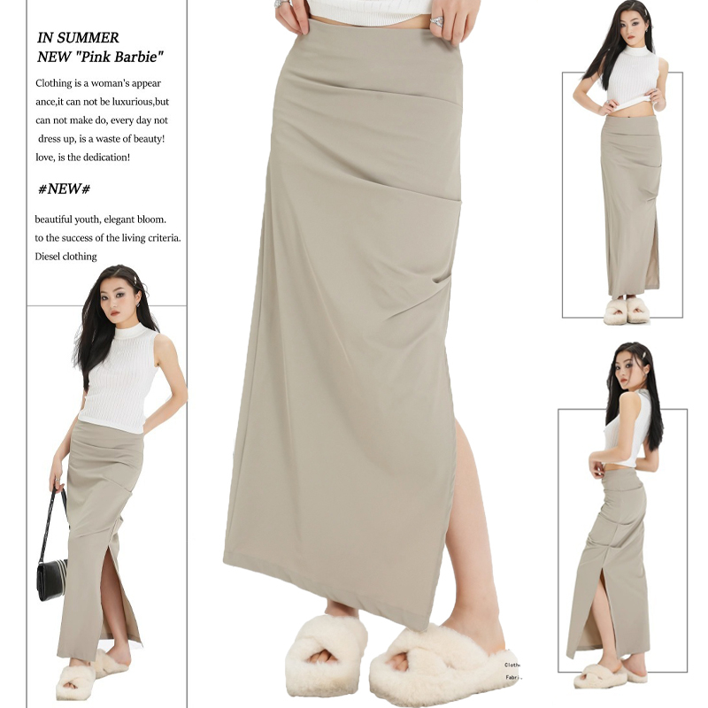 • FUXI 歐美辣妹工裝長裙女 半身裙 中長裙 修身顯瘦褶皺開叉一步裙 高腰包臀裙 窄裙 卡其色半身裙 裙子
