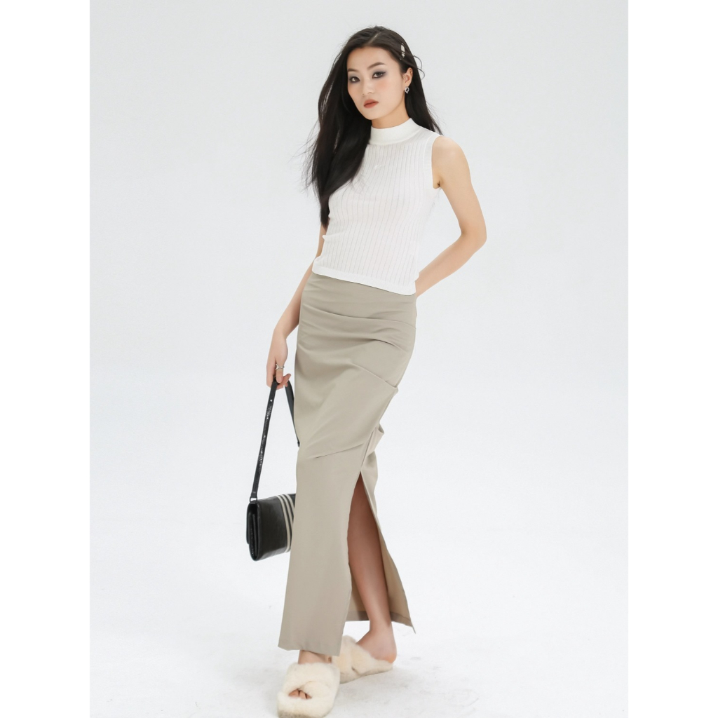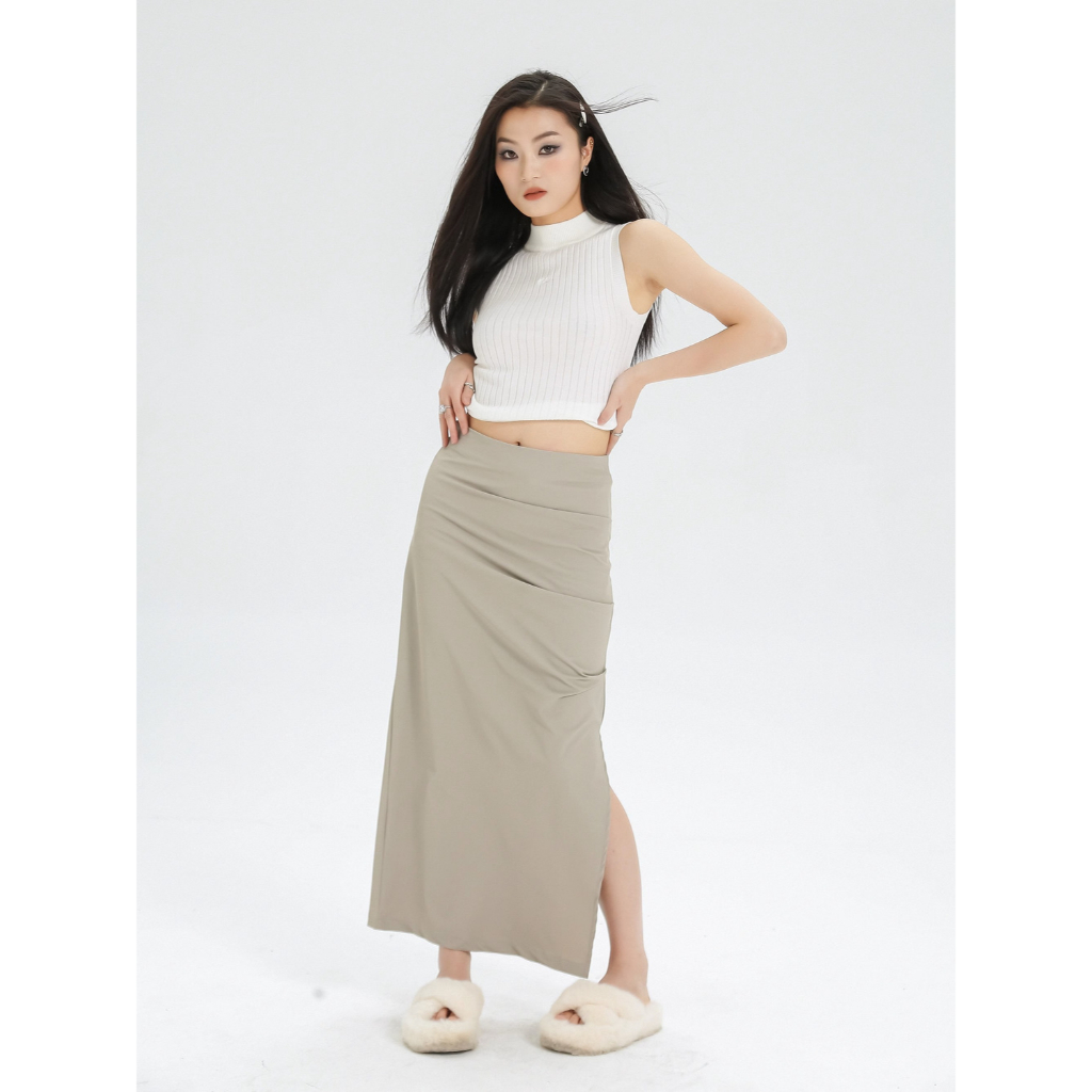 FUXI 歐美辣妹工裝長裙女 半身裙 中長裙 修身顯瘦褶皺開叉一步裙 高腰包臀裙 窄裙 卡其色半身裙 裙子