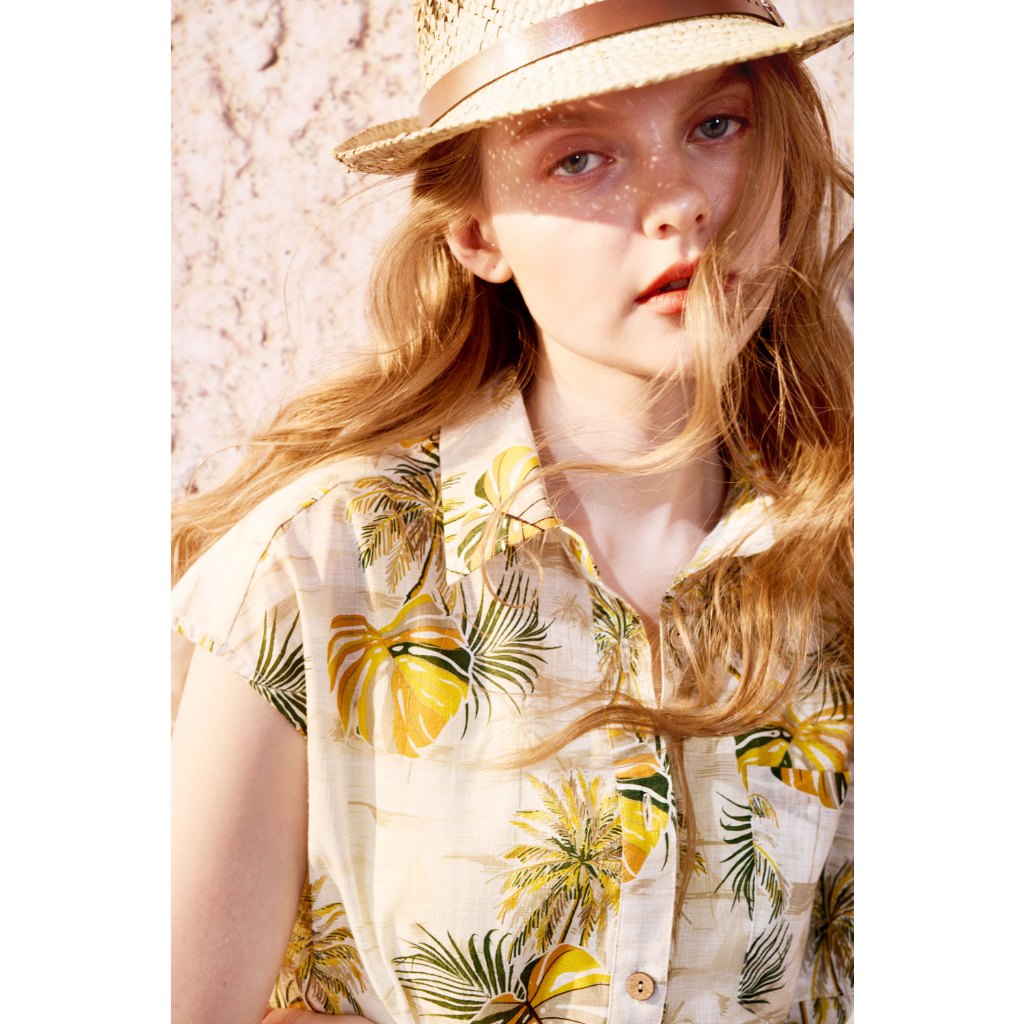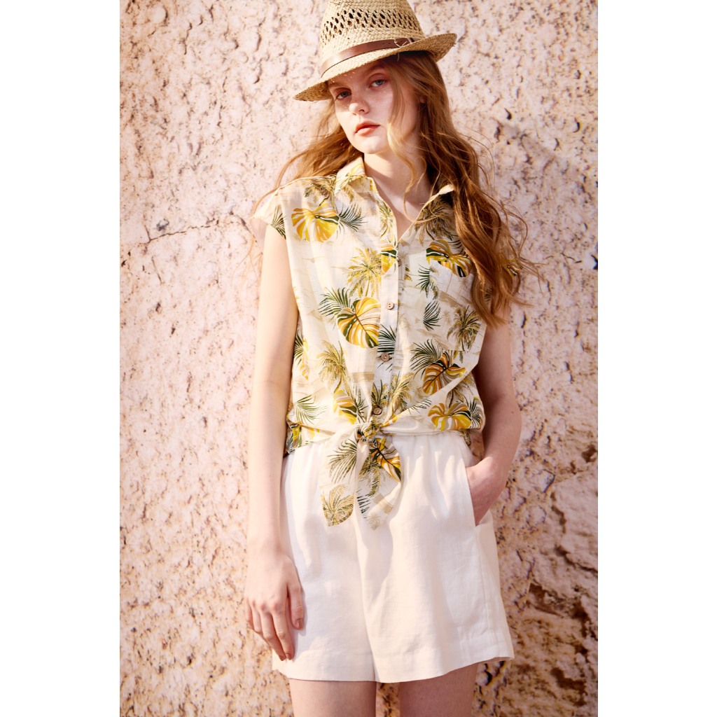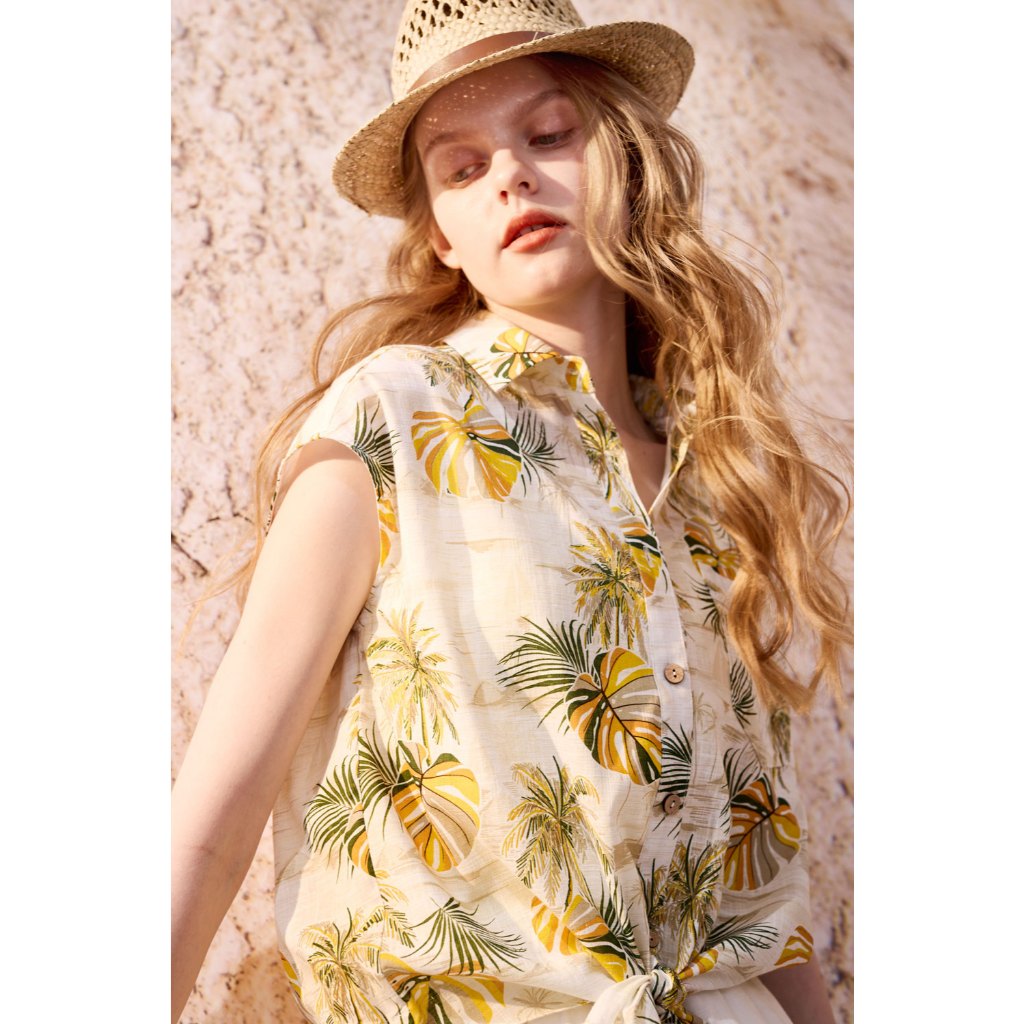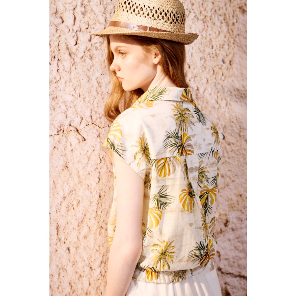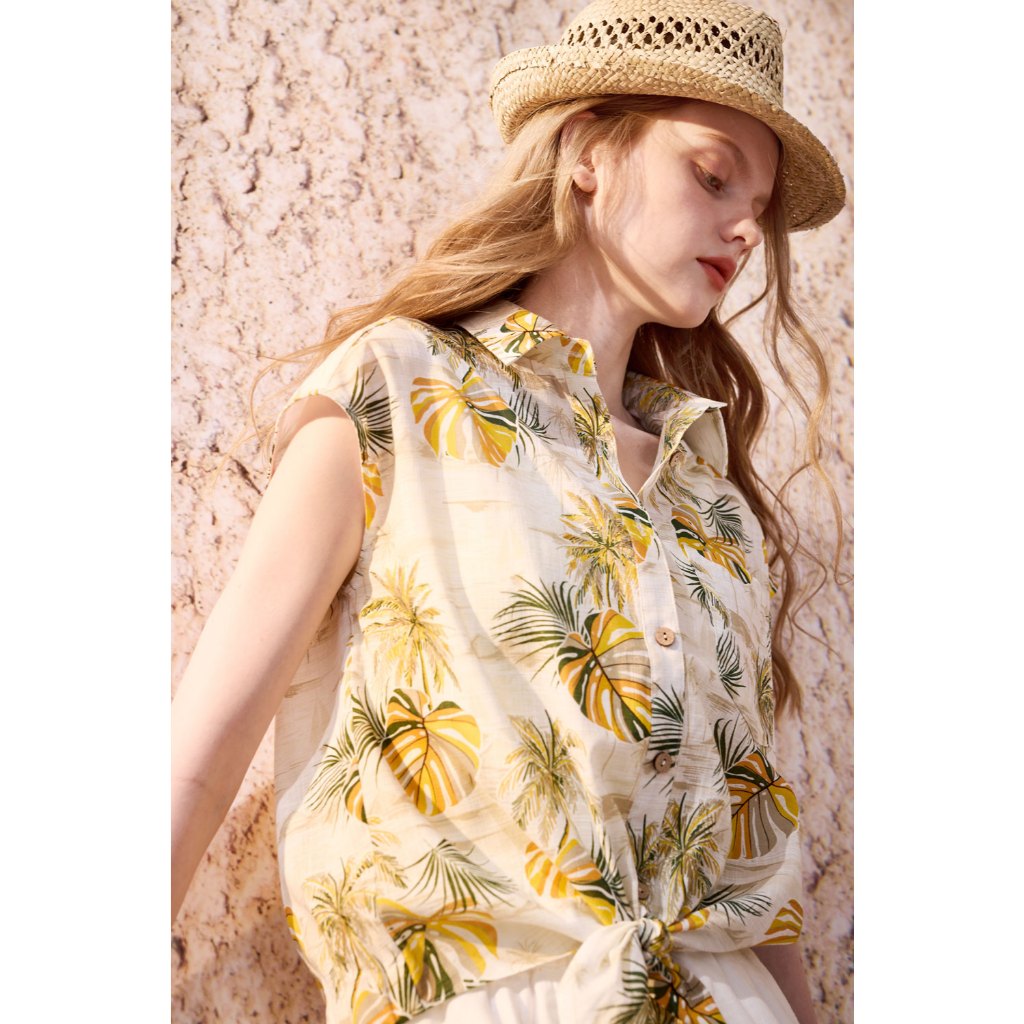 叢林悠遊 ● 熱帶印花綁帶襯衫黃,FShirts & BlousesLe Polka