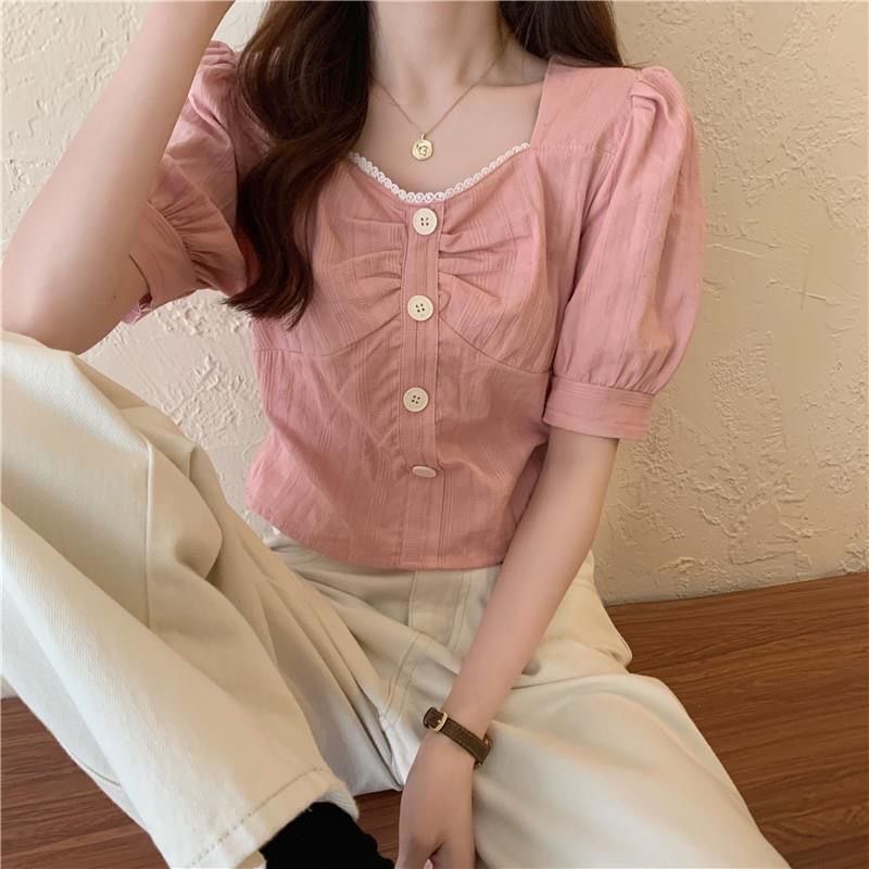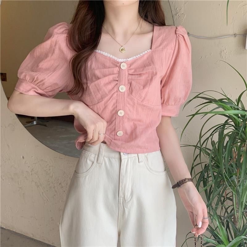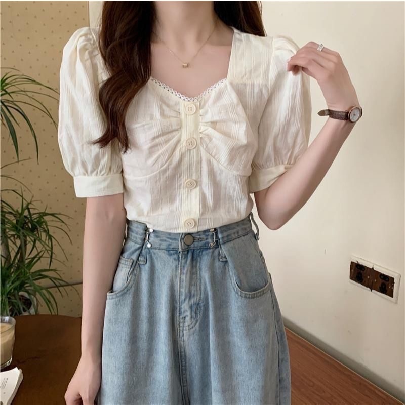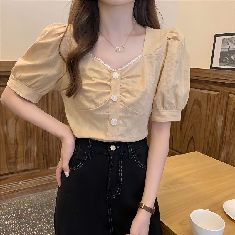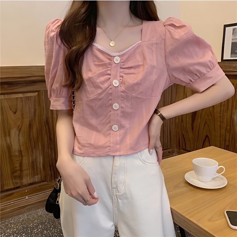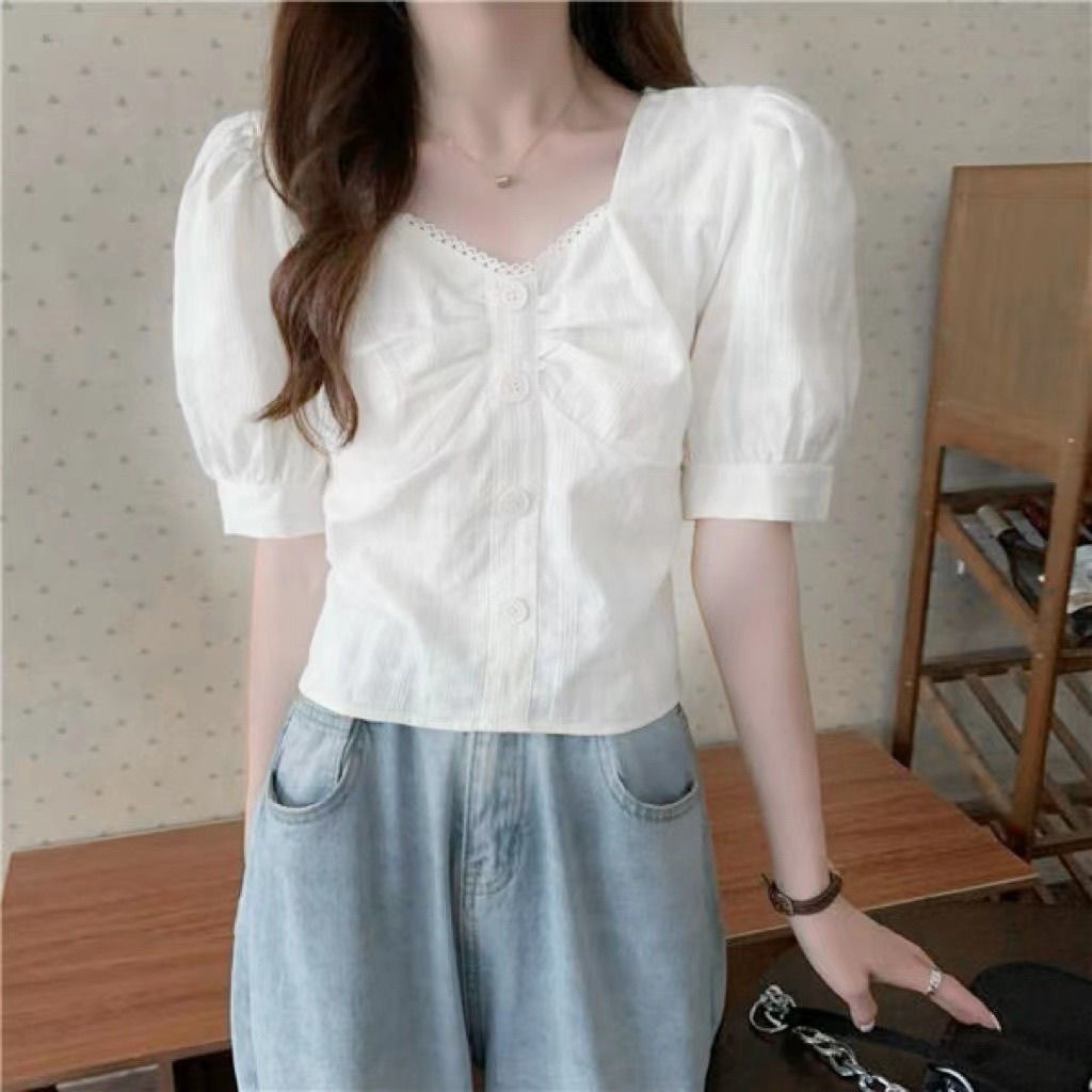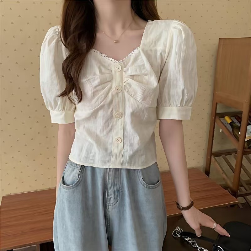 • FUXI 法式方領襯衫女 泡泡袖襯衫 短袖襯衫 短板上衣 修身顯瘦短版襯衣 女裝 衣服