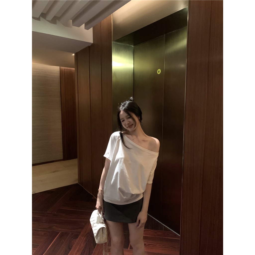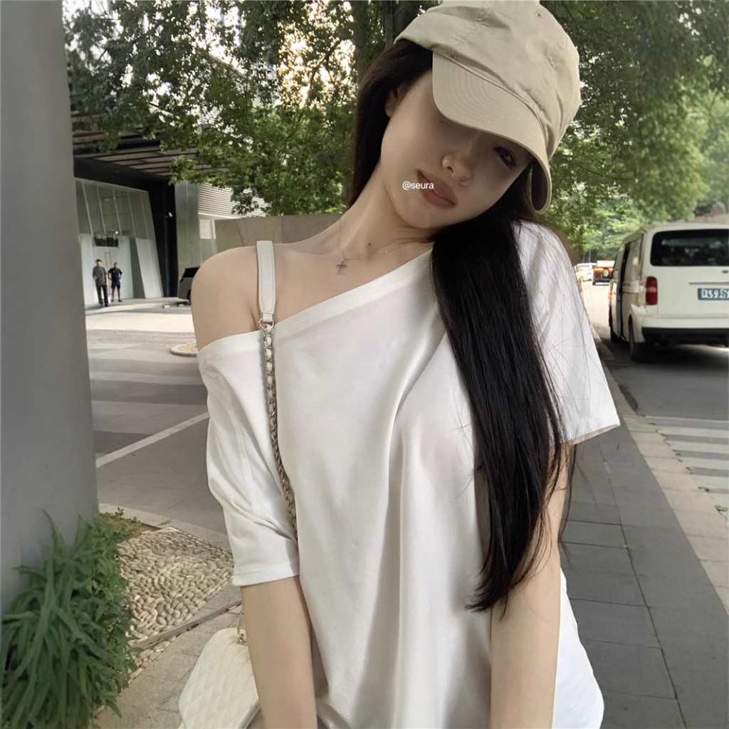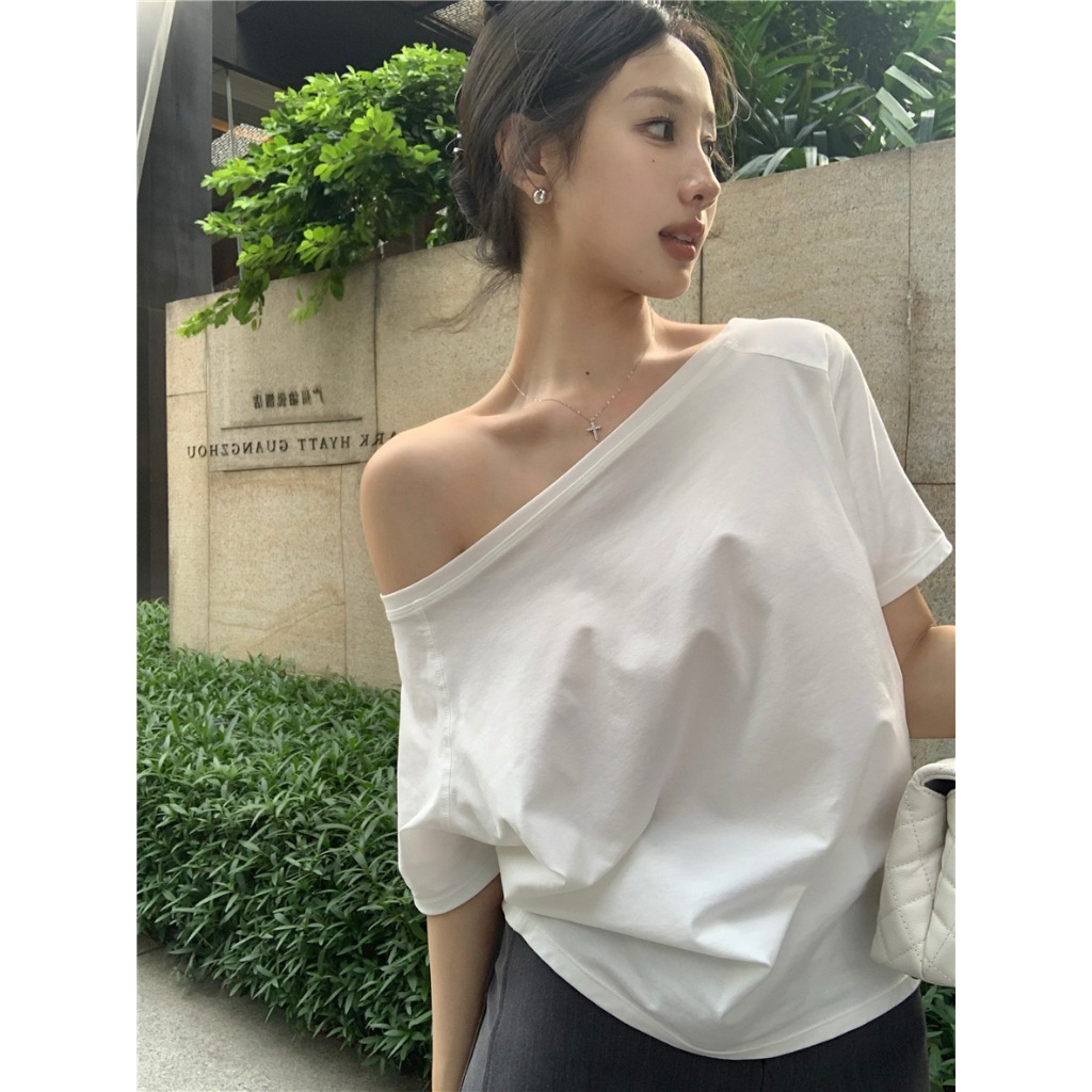 • FUXI 辣妹斜肩上衣 短袖t恤女 寬鬆休閒露肩上衣 素色百搭一字領上衣 女裝 衣服【AB6】