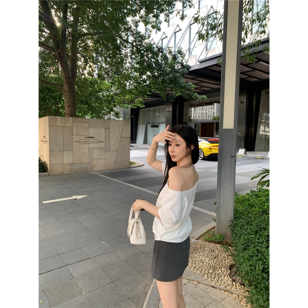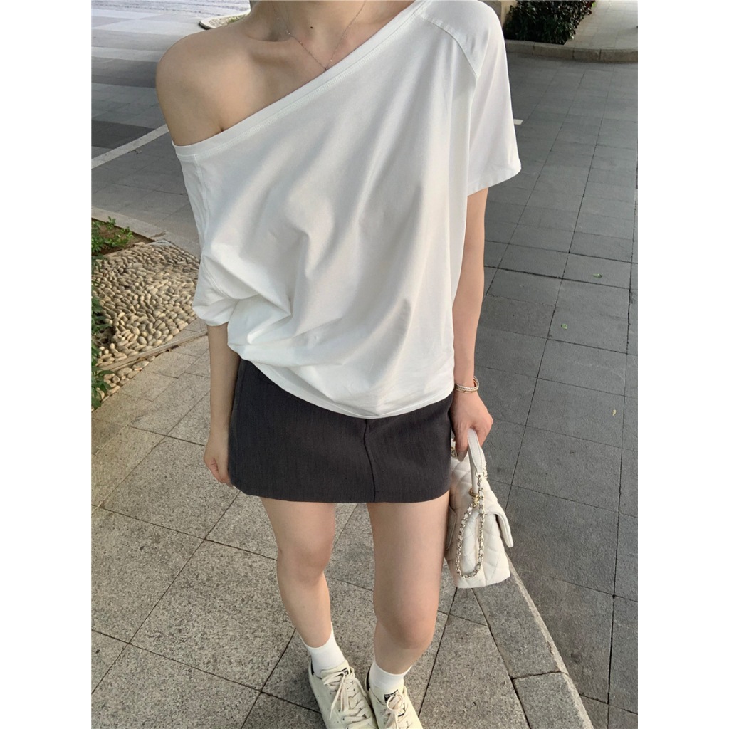 FUXI 辣妹斜肩上衣 短袖t恤女 寬鬆休閒露肩上衣 素色百搭一字領上衣 女裝 衣服【AB6】