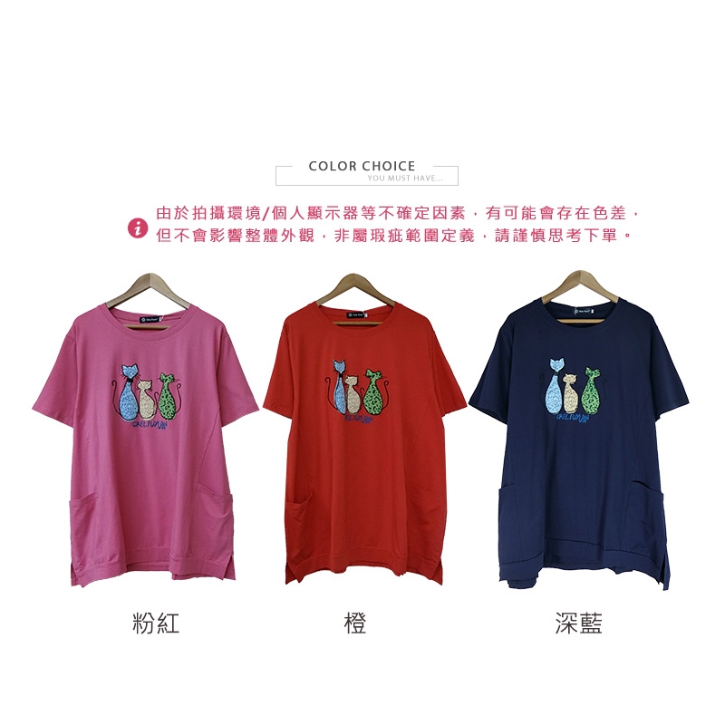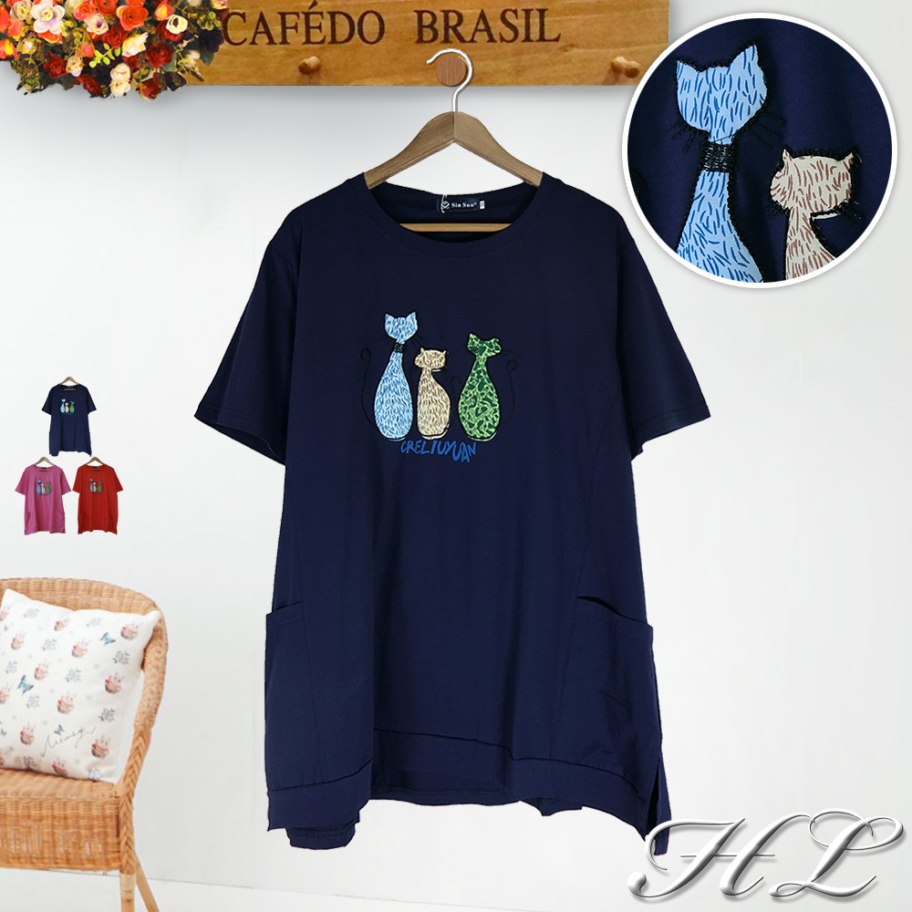 HL中大尺碼【25070317】綽約三貓背影雙口袋棉短袖上衣 3色52碼粉紅|52碼深藍|52碼橙T-shirtsHL中大尺碼
