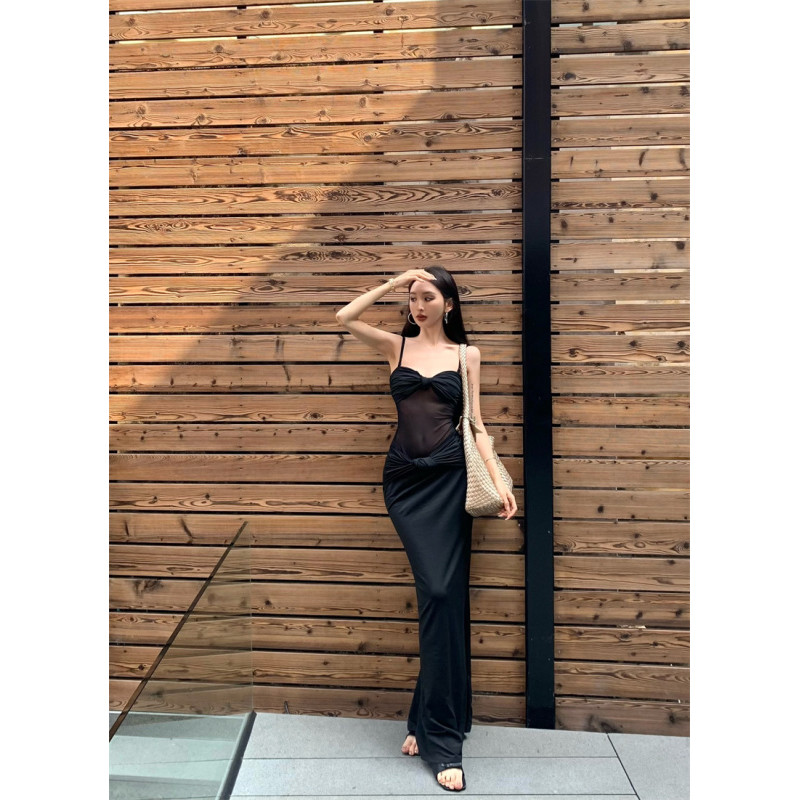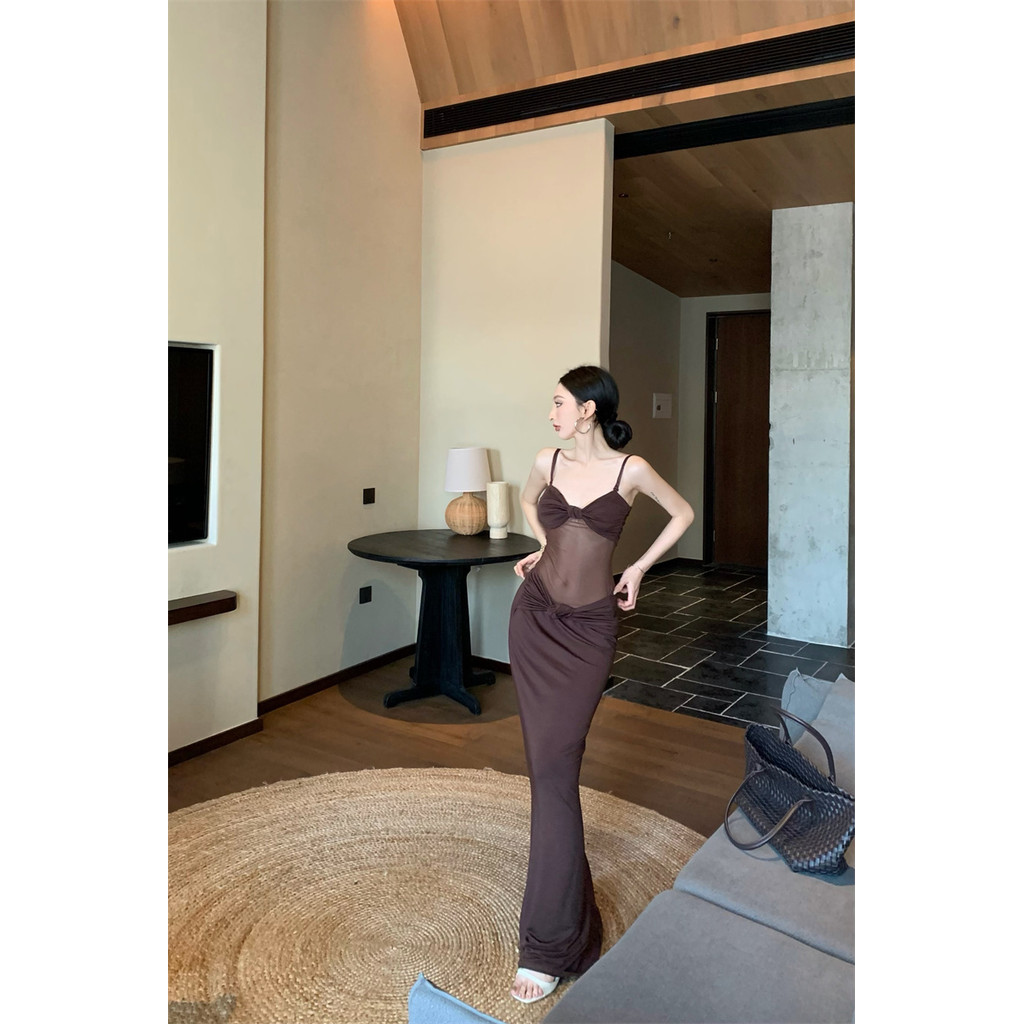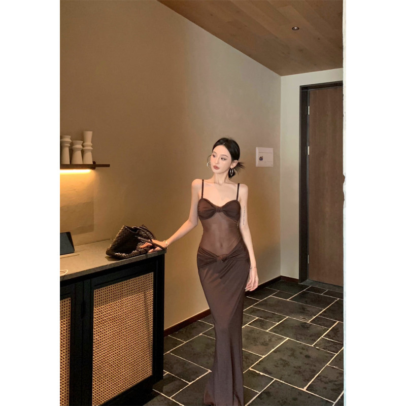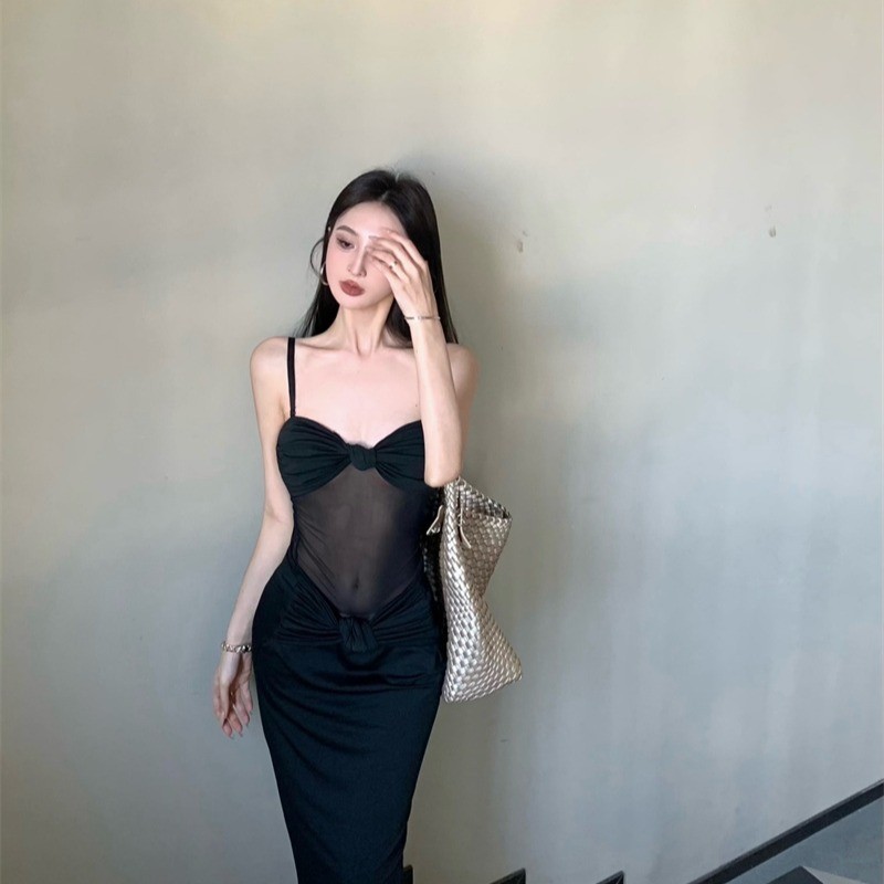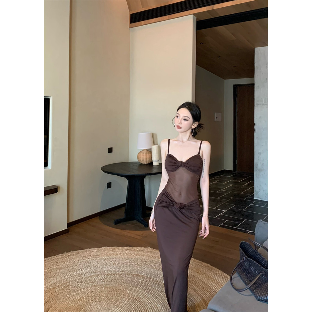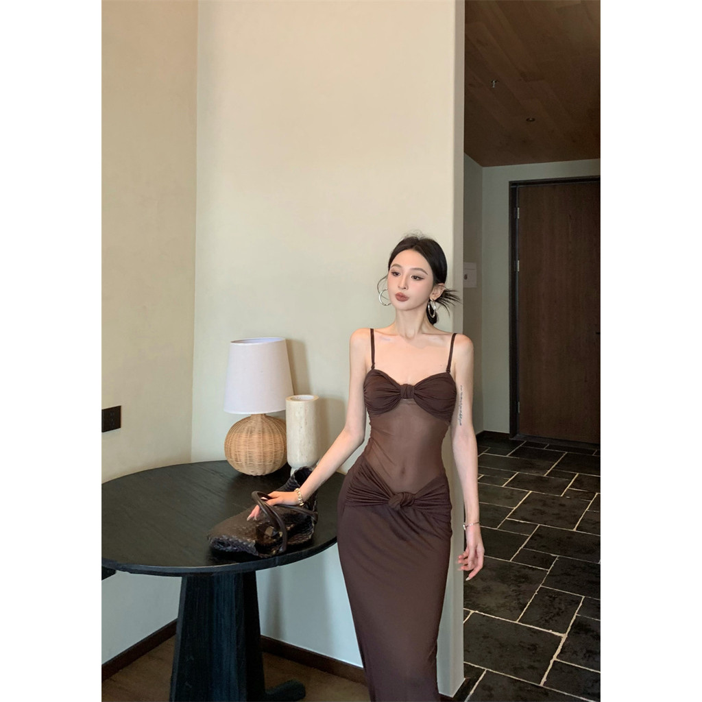 【HOT 本舖】 性感海妖風透視網紗拼接蝴蝶扭結收腰包臀吊帶連衣裙咖色連衣裙,S|咖色連衣裙,M|黑色連衣裙,S|黑色連衣裙,MHOT本舖|女裝館