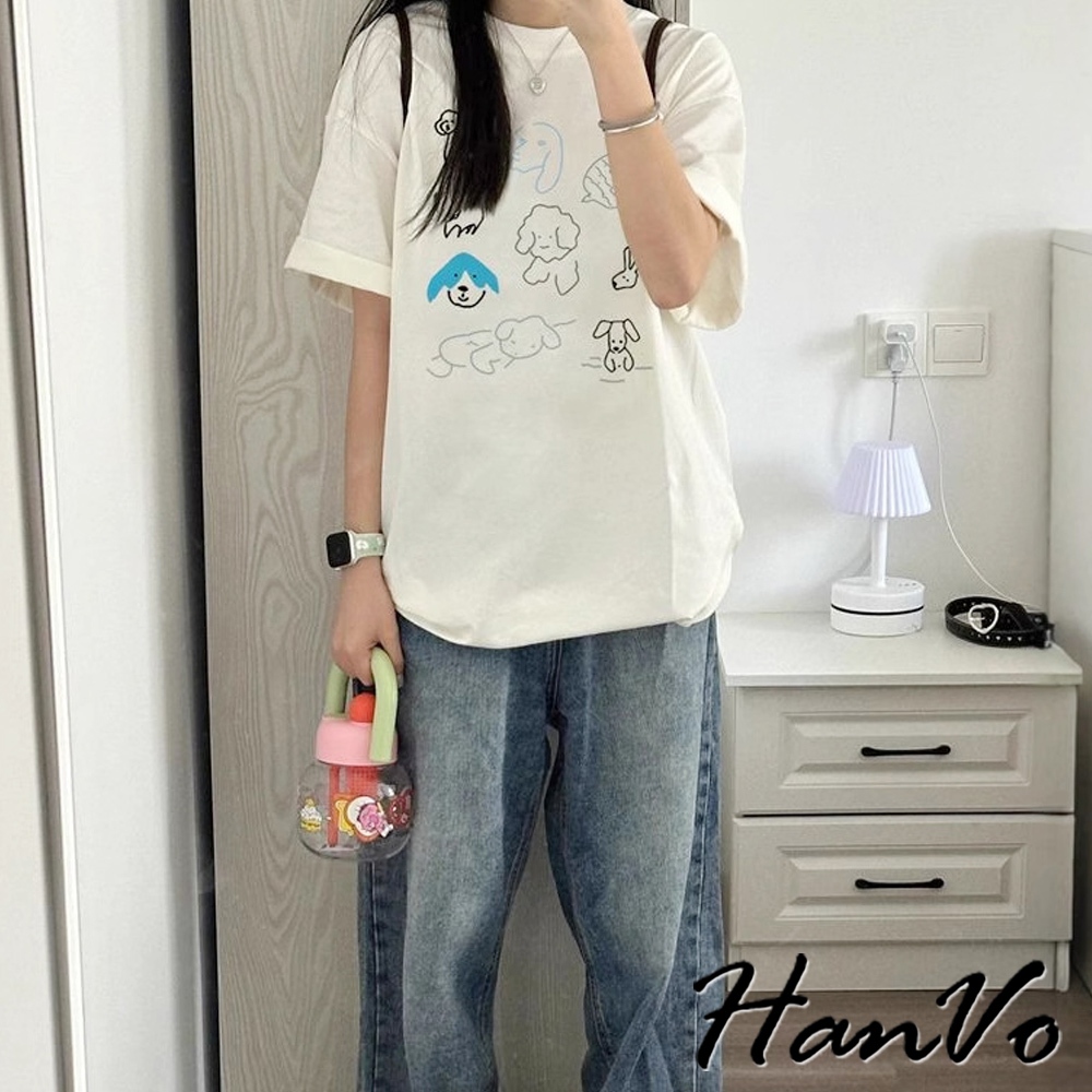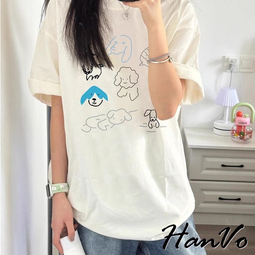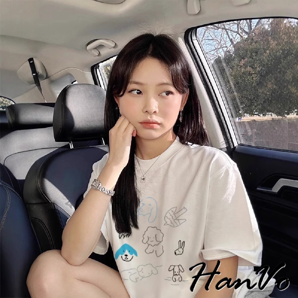 【HanVo】可愛動物圖案純棉短袖T恤 休閒百搭潮流上衣 韓系女裝 女生衣著 A01-0330