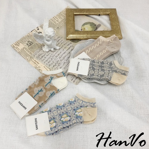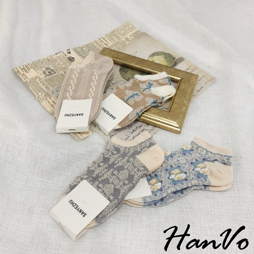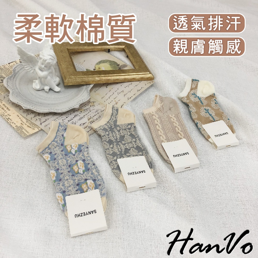 【HanVo】歐式復古花紋船型襪 甜美可愛百搭短襪 中筒襪 韓系襪子 女襪 襪子 女生配件 A12-6068復古藍花|灰色雕花|沙漠小樹|麻花織紋SocksHanVo Wear Collection