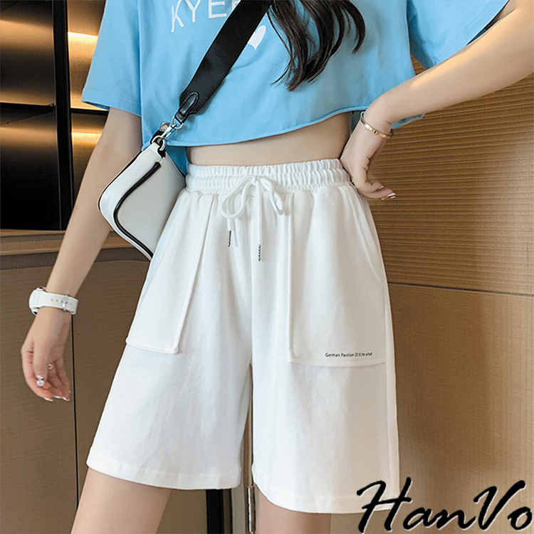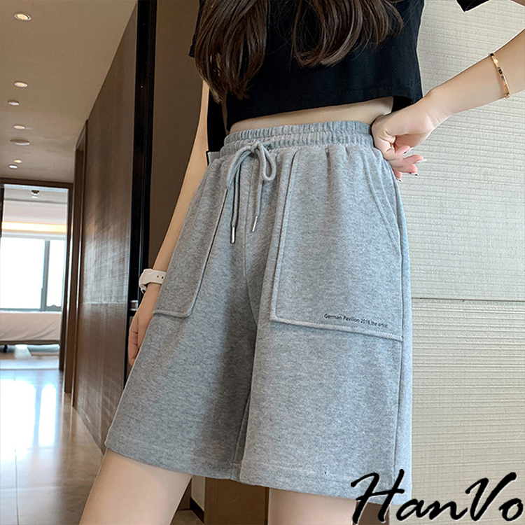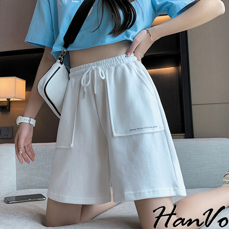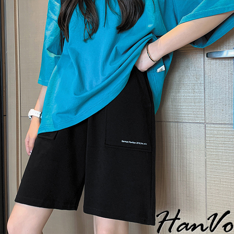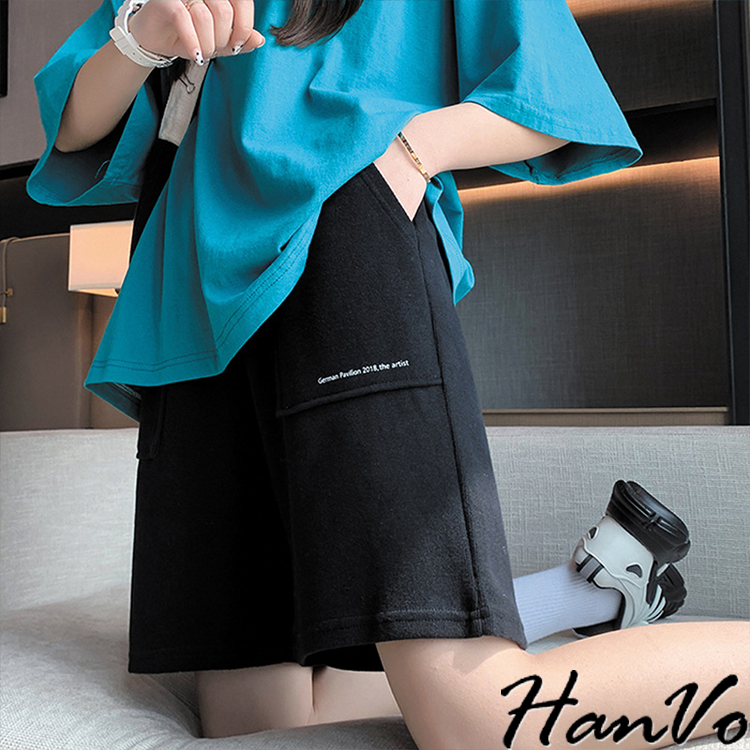【HanVo】休閒素色字母立體口袋五分短褲 韓系簡約百搭休閒短褲 日常穿搭舒適寬鬆 韓國女裝 女生衣著 A03-2074黑色|灰色|白色ShortsHanVo Wear Collection
