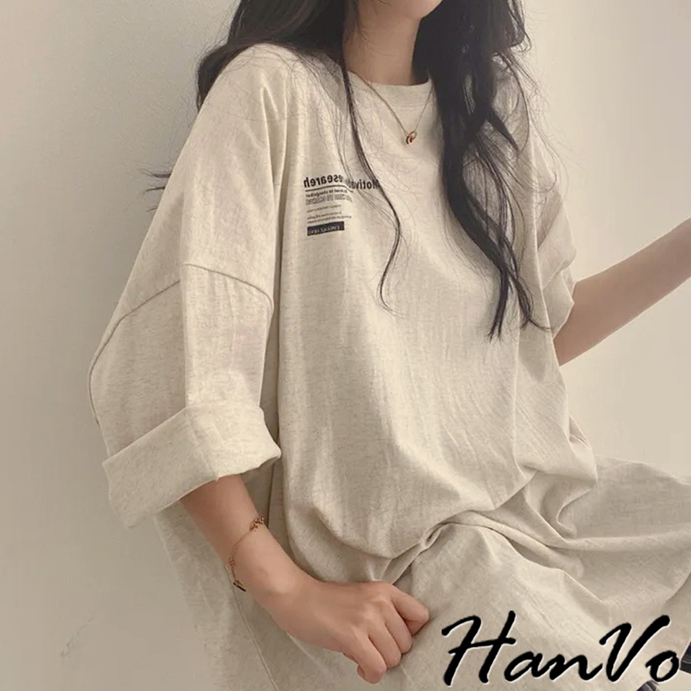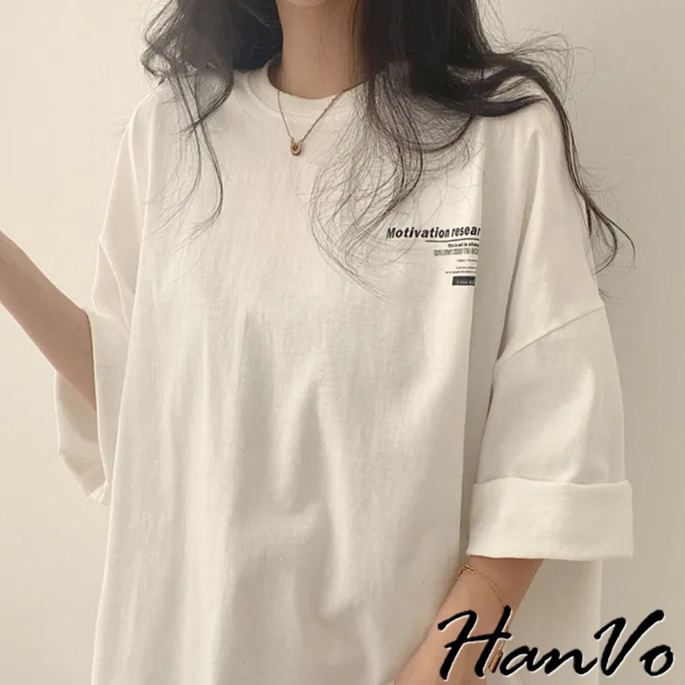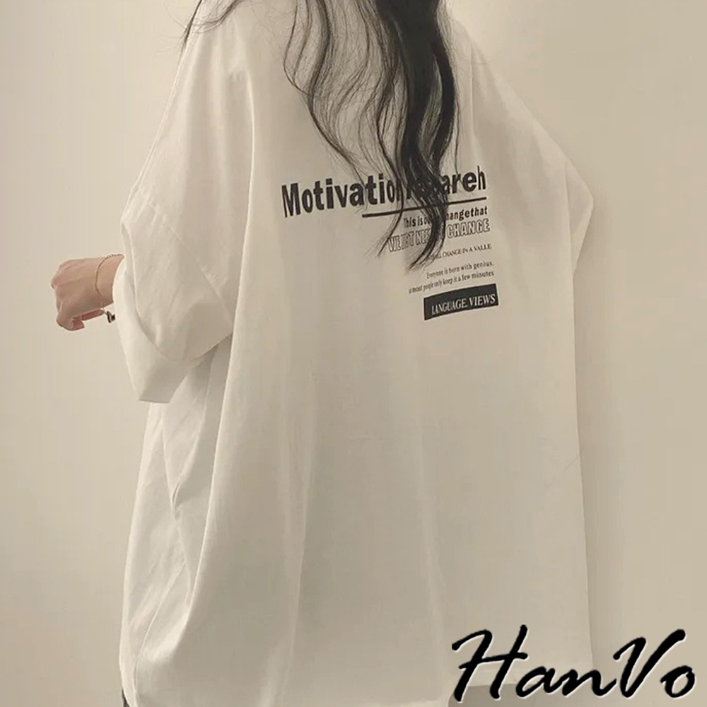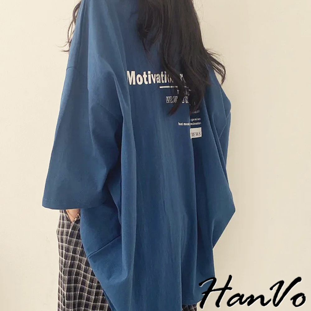 【HanVo】簡約前後字母印花T恤 寬鬆棉質上衣 舒適親膚透氣百搭圓領 韓系衣著 女生上衣 女生衣著 A01-0065白色|海藍|灰色T-shirtsHanVo Wear Collection