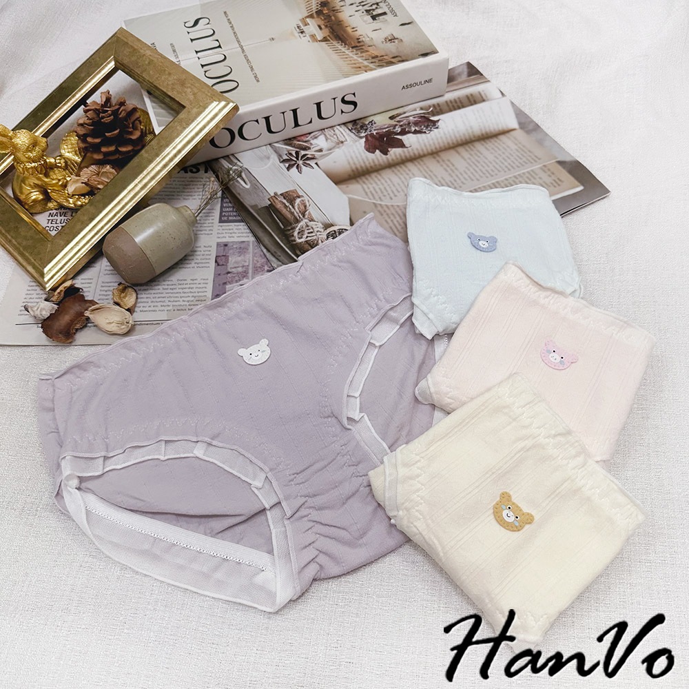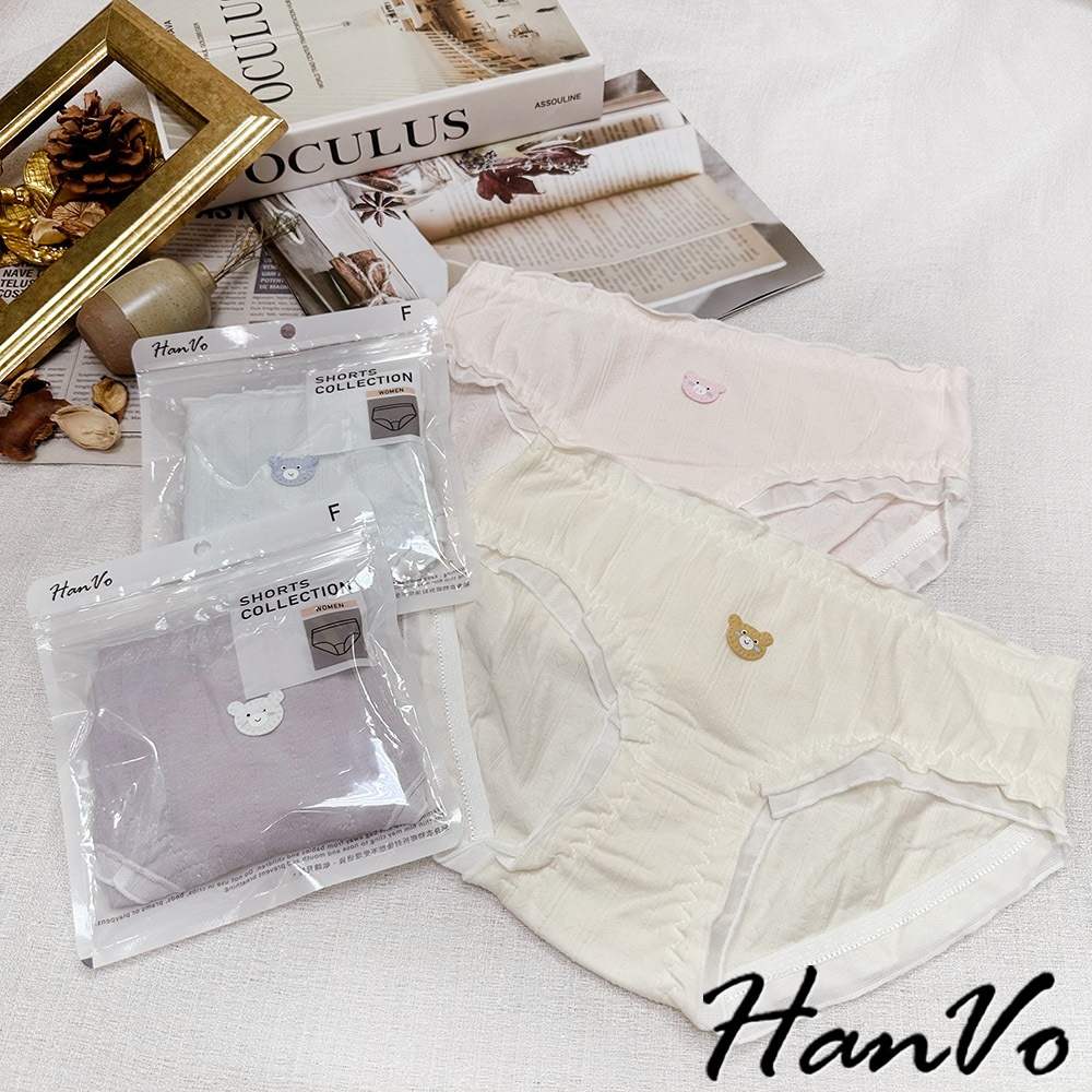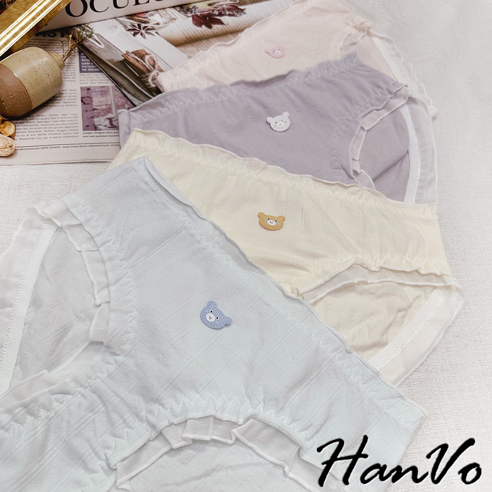 【HanVo】荷葉花邊小熊棉質內褲 彈性佳包覆感透氣三角褲 中腰 獨立包裝 女生內褲 內著 A11-5256淡霧灰|奶油黃|蜜糖粉|天空藍PantiesHanVo Wear Collection