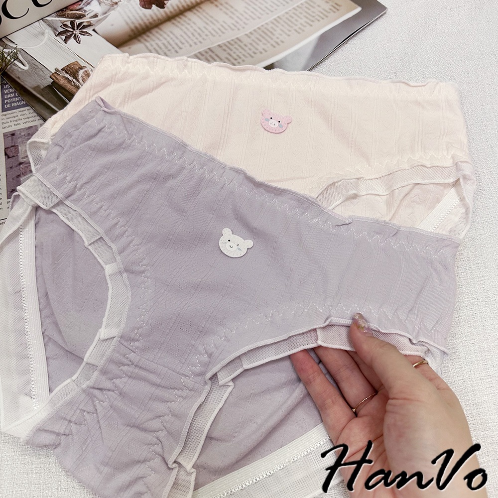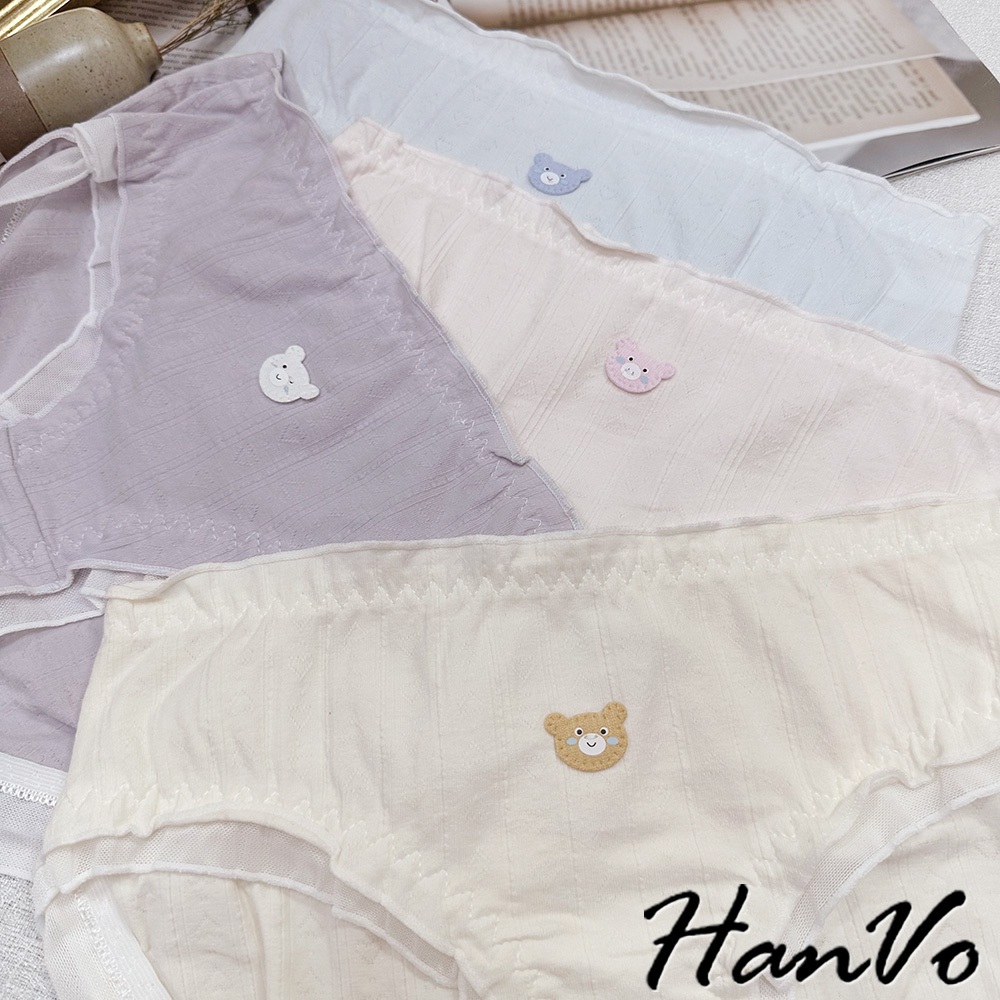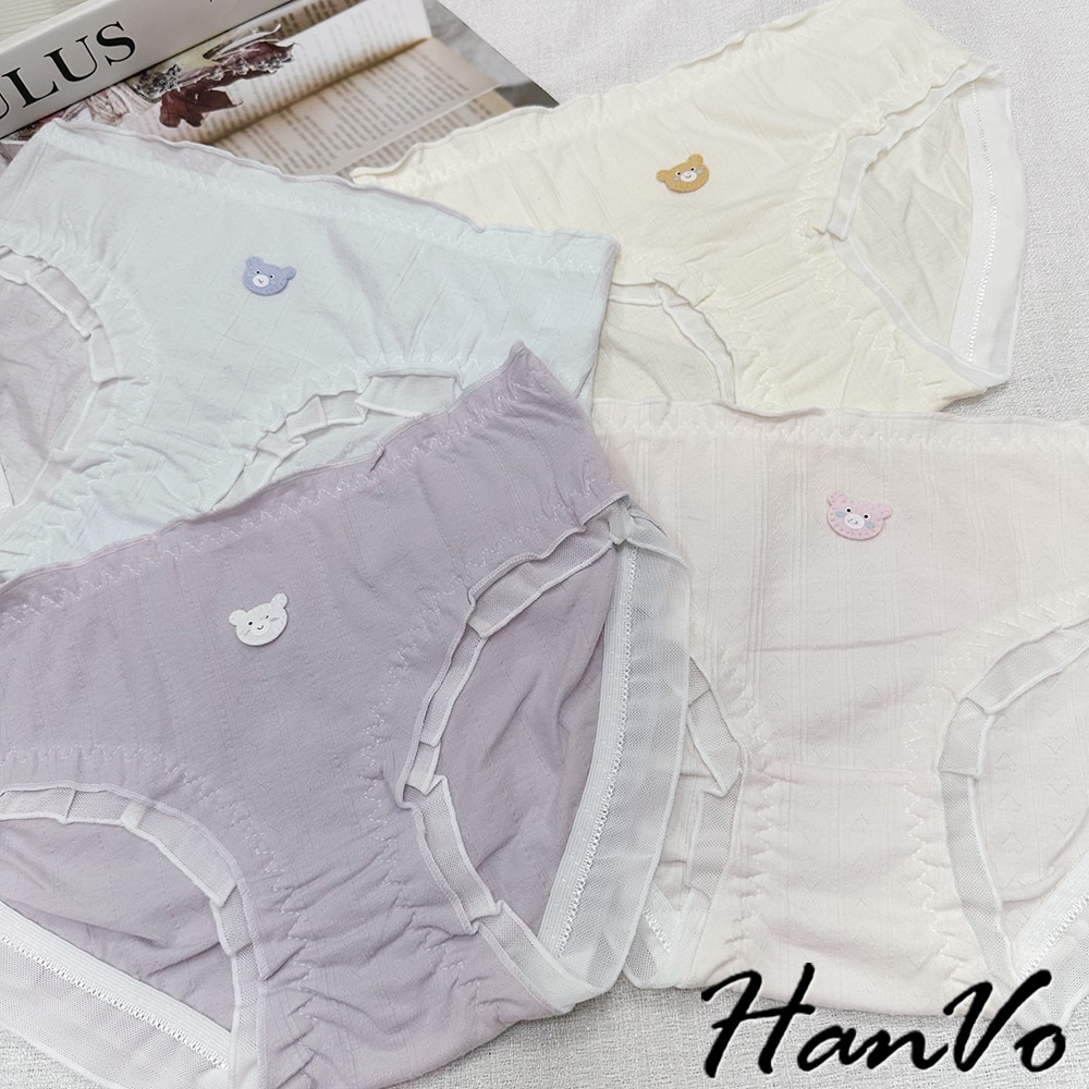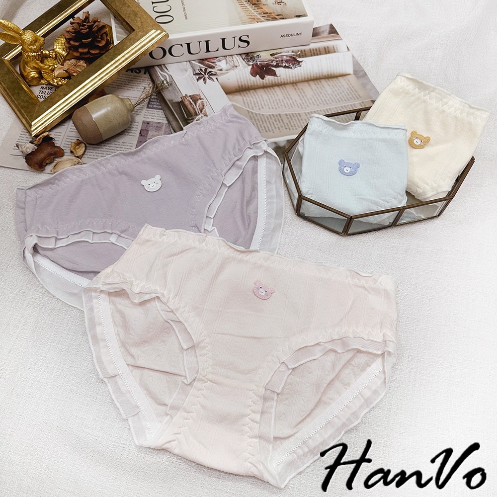 【HanVo】荷葉花邊小熊棉質內褲 彈性佳包覆感透氣三角褲 中腰 獨立包裝 女生內褲 內著 A11-5256淡霧灰|奶油黃|蜜糖粉|天空藍PantiesHanVo Wear Collection